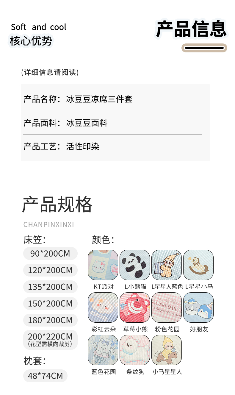 (总)优品惠 2026春夏新款冰豆豆印花凉席三件套,星点木马,彩虹云朵,草莓小熊,海盐奶狗,萌宠家族,奶格kt,田园粉语,条纹小狗,小马星星人,星星人蓝,熊猫