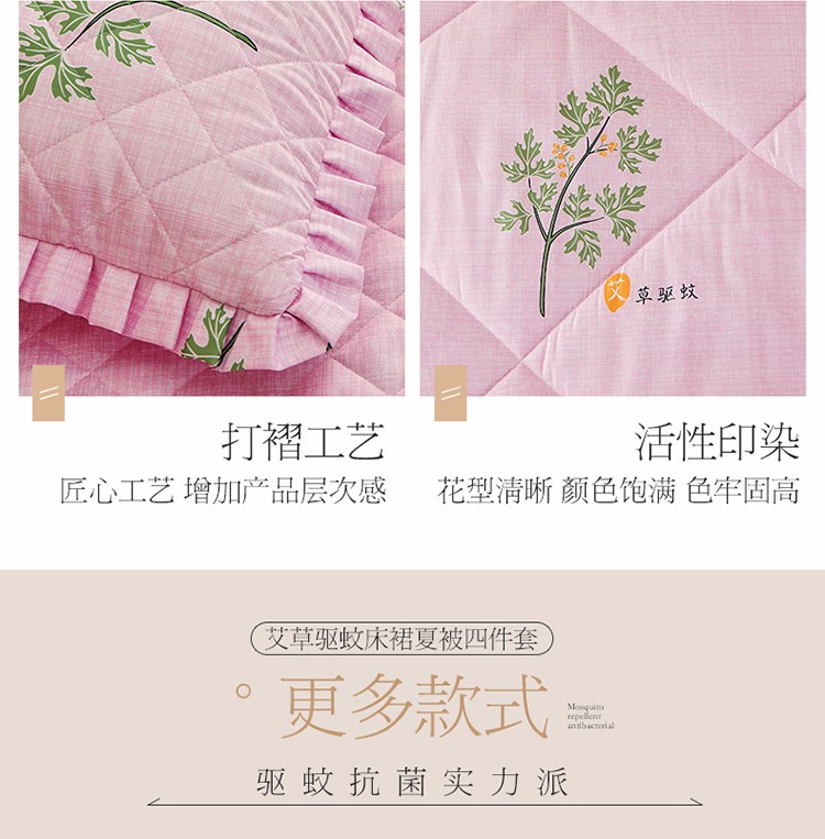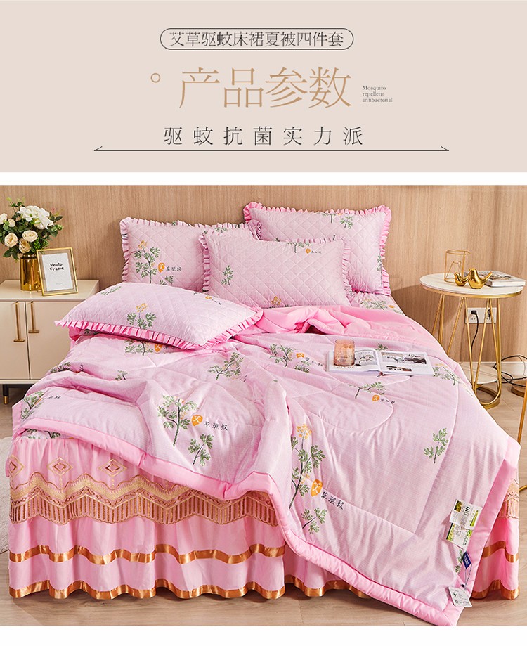 • 91家纺网 家纺一手货源 找家纺 情恒家纺  2025新款艾草驱蚊抗菌床裙夏被四件套 清新粉