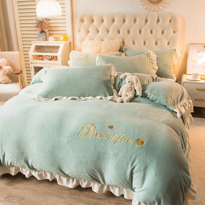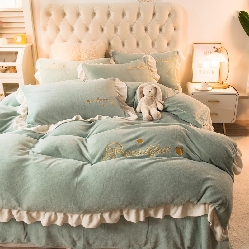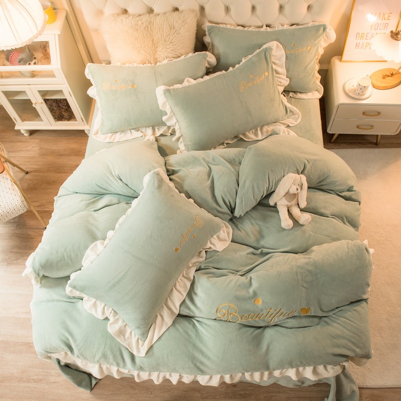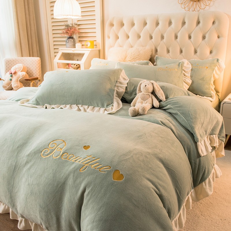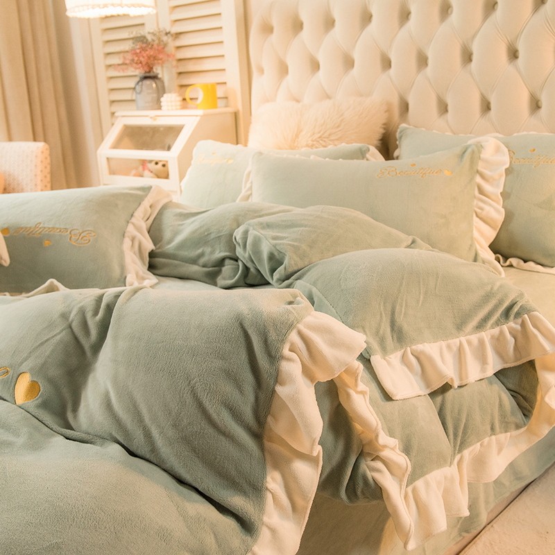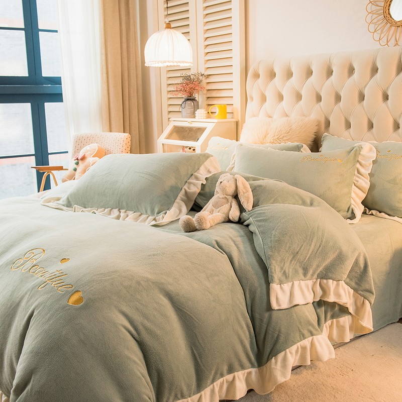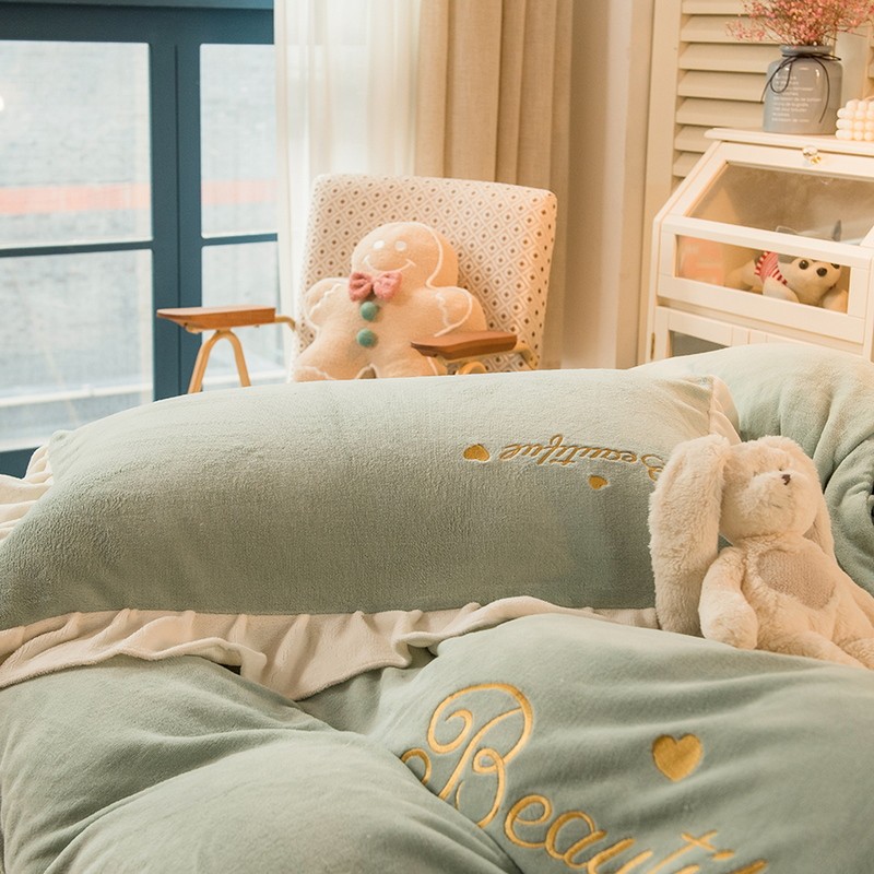 丝羽坊 2021新款牛奶绒韩系心意系列四件套 豆绿