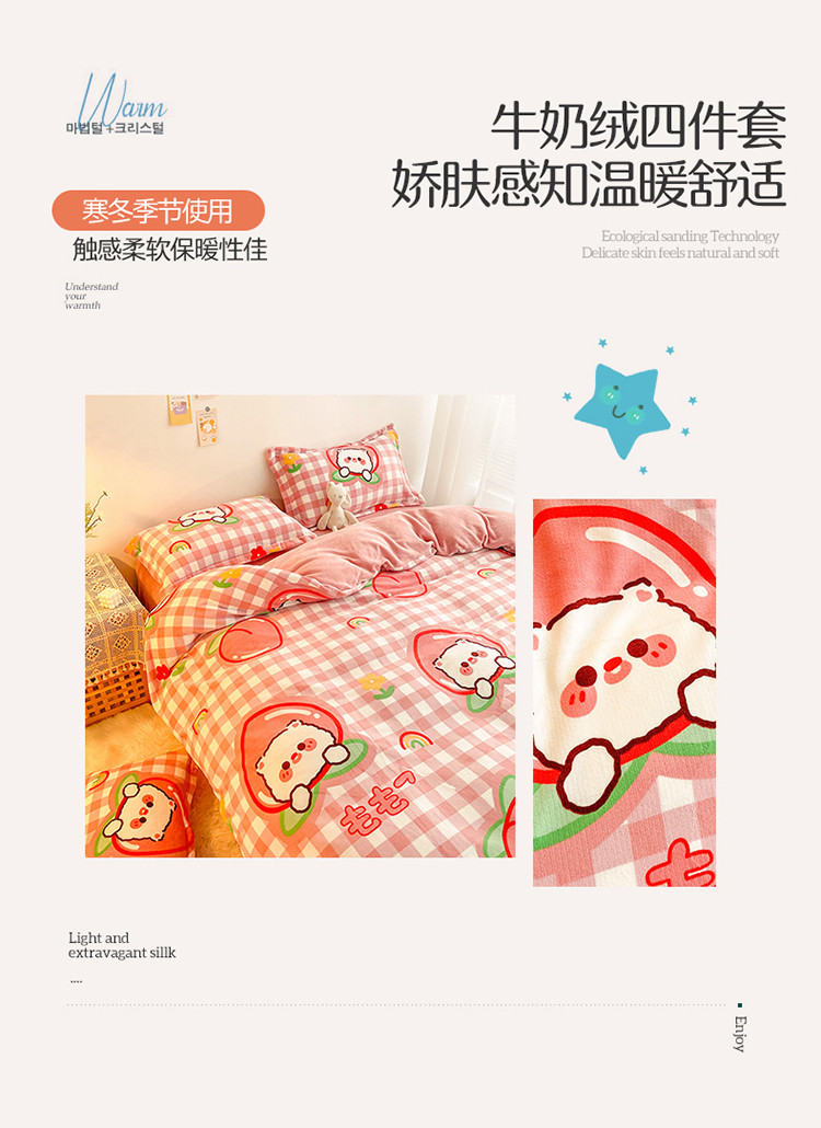 沐棉 2021新款卡通牛奶绒四件套新拍 蜜桃熊
