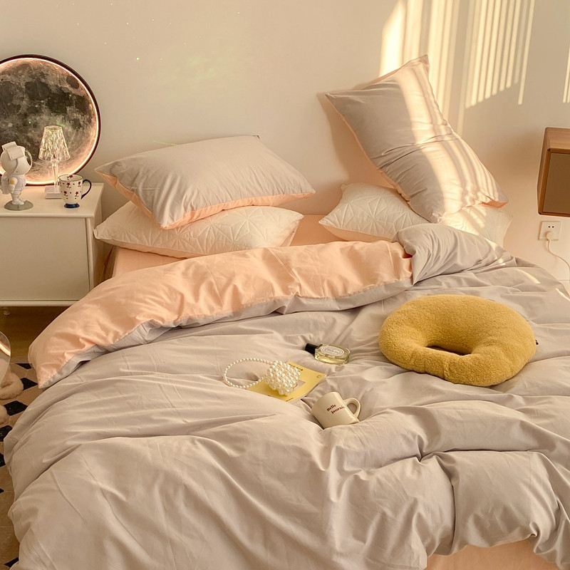昔可家纺 2021新款双拼加厚磨毛四件套 灰粉双拼