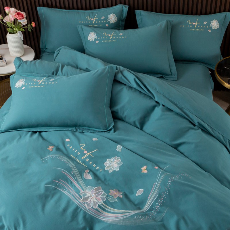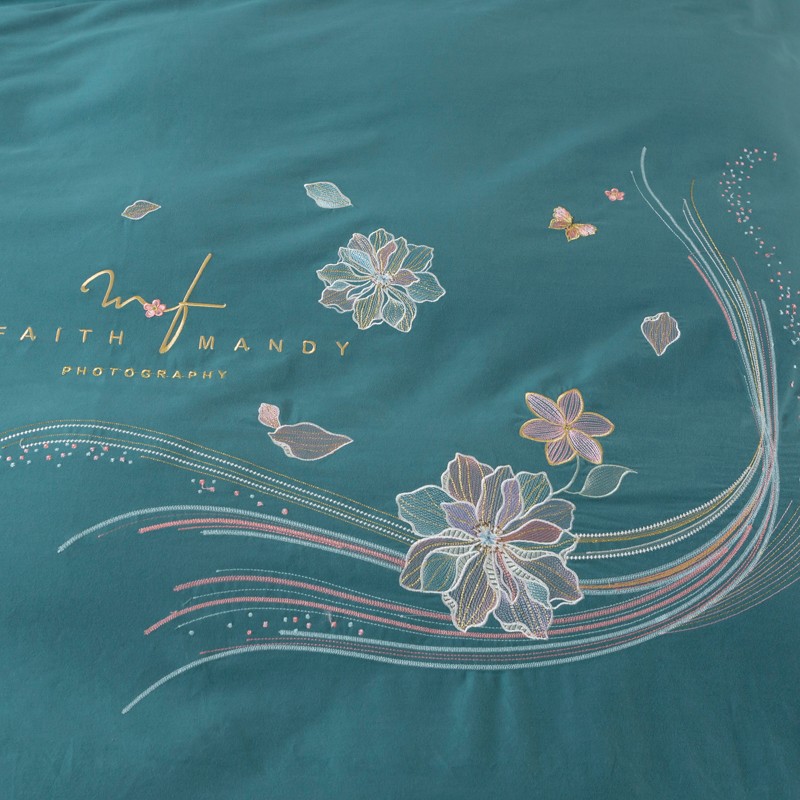 优姿2022新款100S长绒棉宽边绣花四件套似锦年华-孔雀蓝