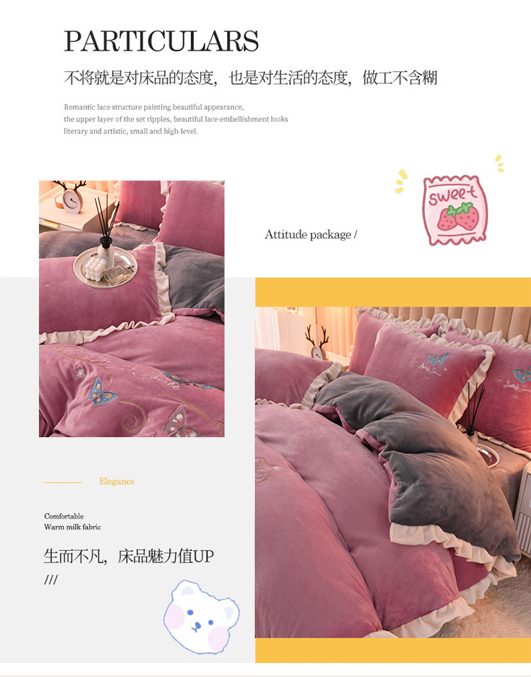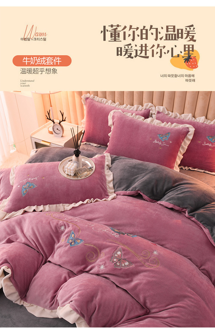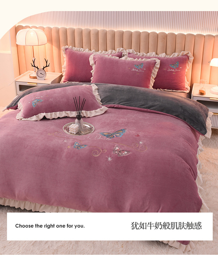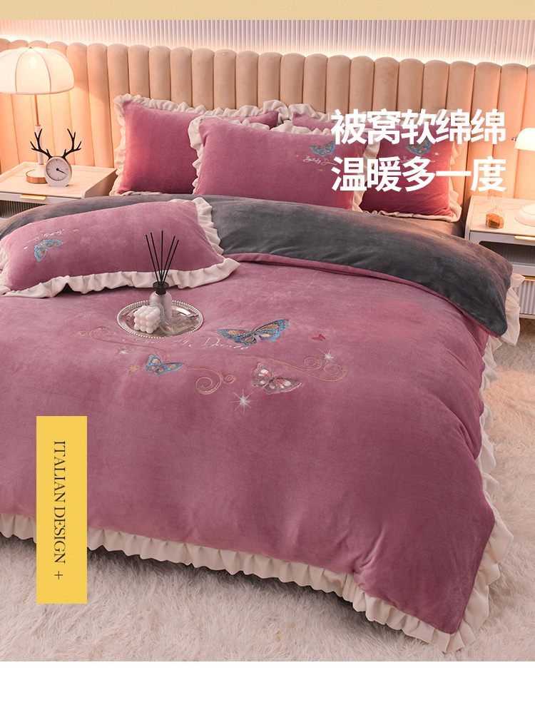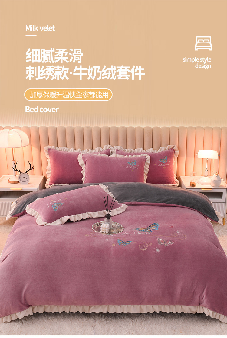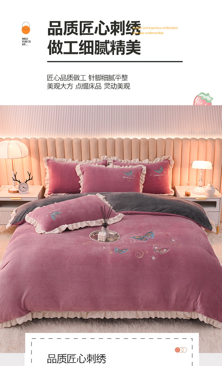 商品名称:芃成 2022新款加厚保暖牛奶绒绣花四件套 蝶舞 豆沙