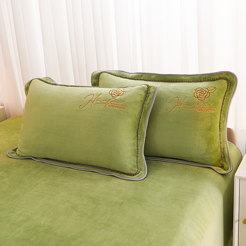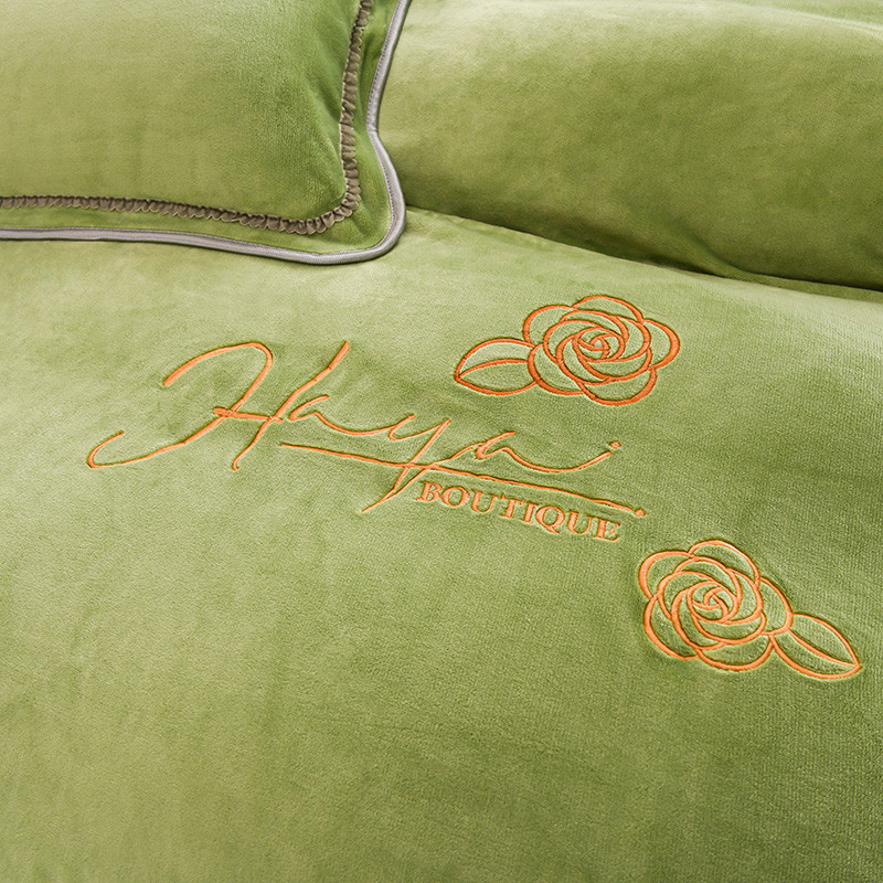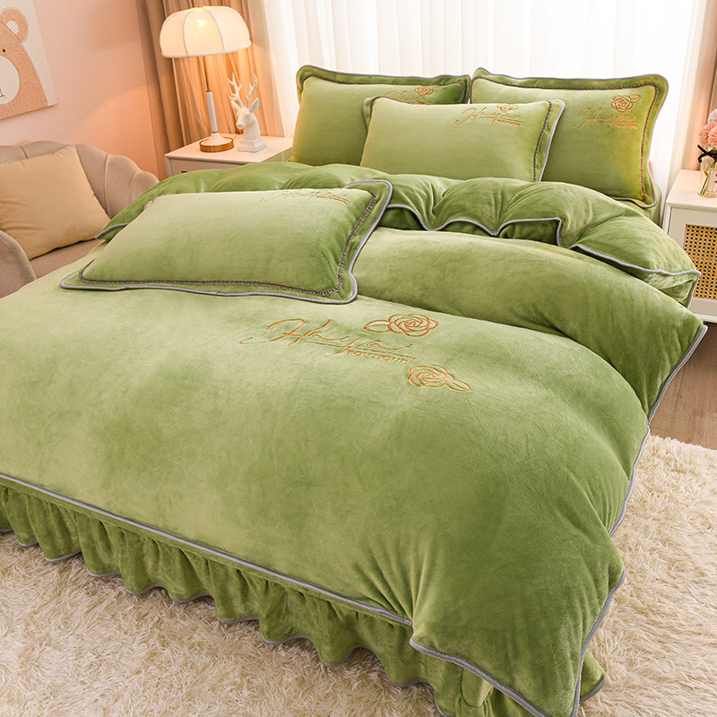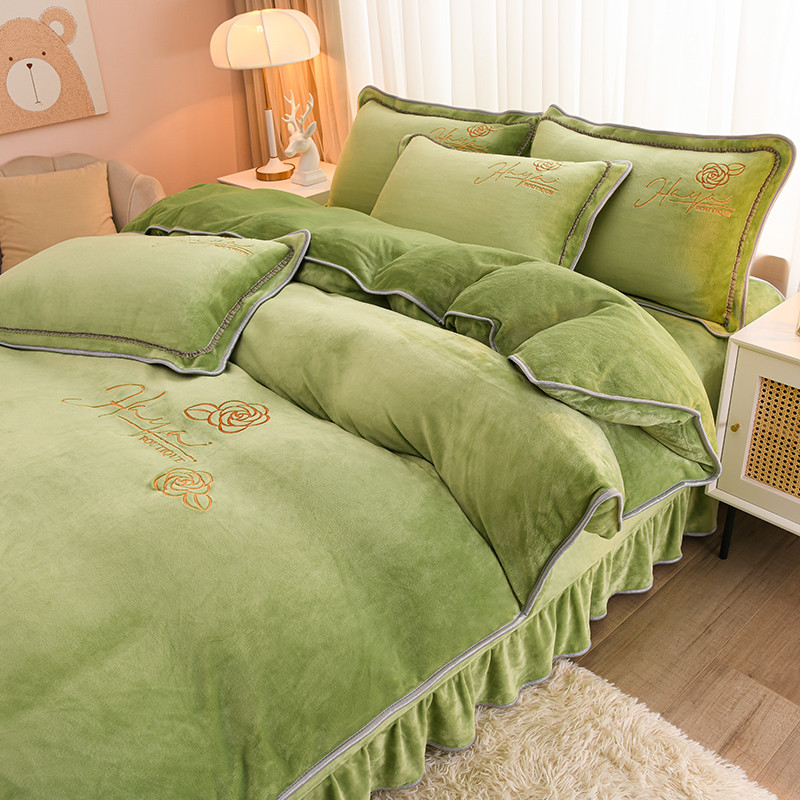 博兰蒂 2022高克重牛奶绒素色绣花床裙四件套直播爆款-水仙 水仙浅绿