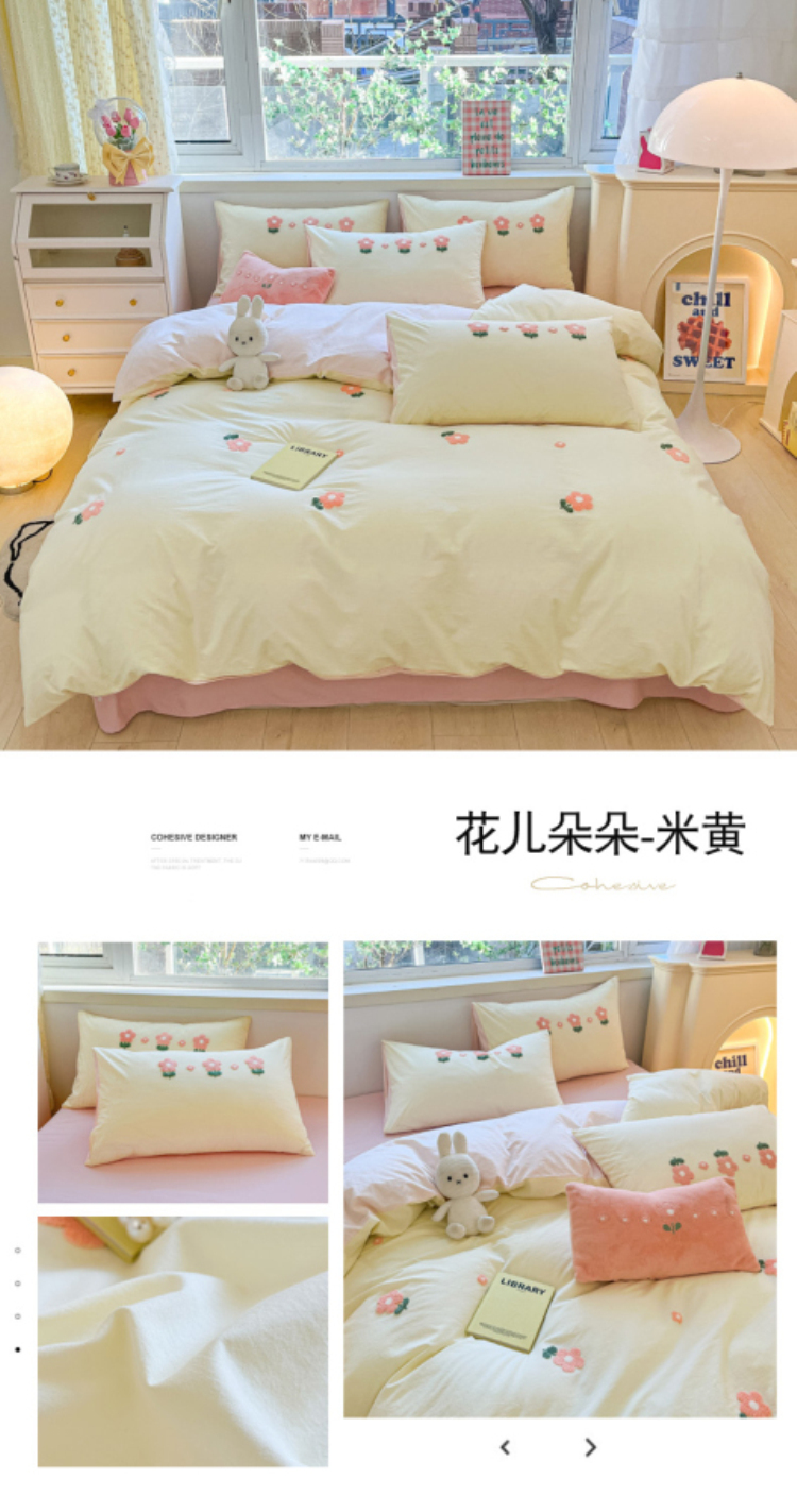 商品名称:寐居2023新款绣花款水洗棉四件套 花儿朵朵-米黄