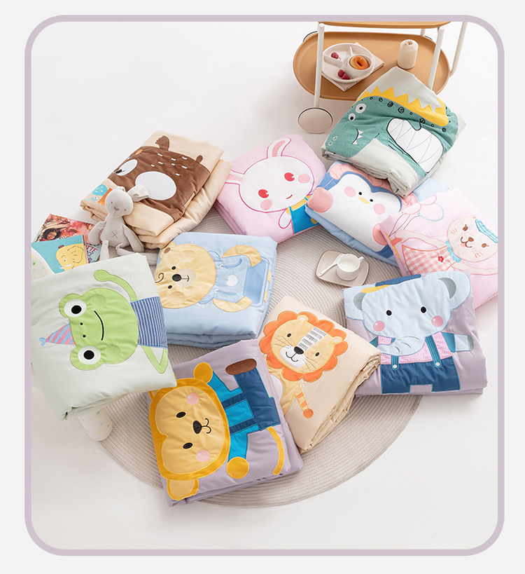 (总)喜多兔儿童家纺 2025春夏新款小软萌贴布绣纱布被,粉色软萌小兔,卡其色软萌小熊,蓝色软萌小象,绿色软萌恐龙,组合图仅供展示