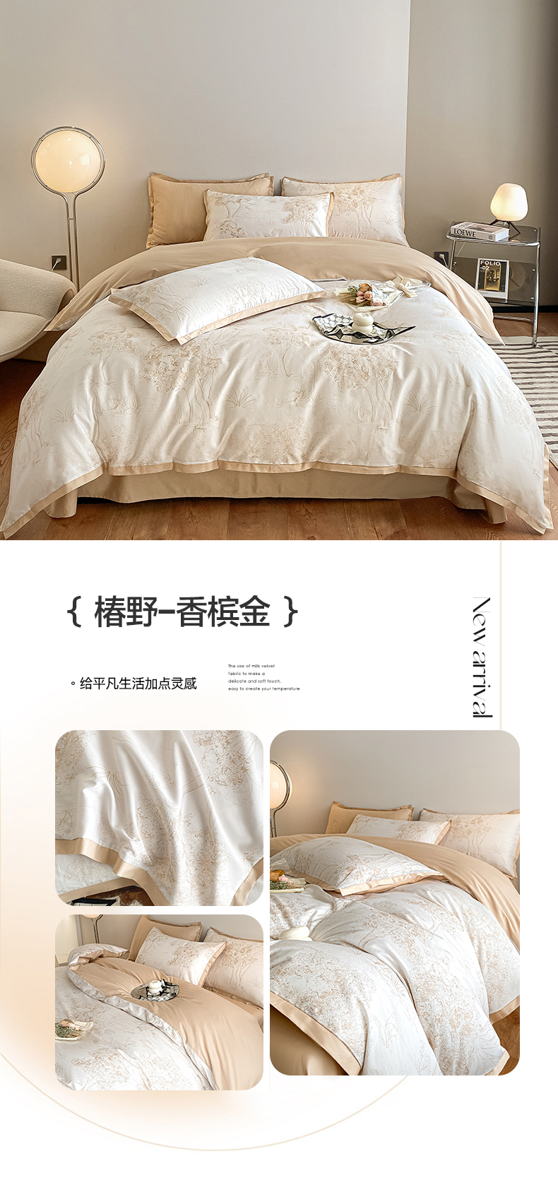 商品名称:(总)秀色 2025新款50支贡缎长绒棉床上四件套数码印花被套轻奢高级感床品 椿野-香槟金