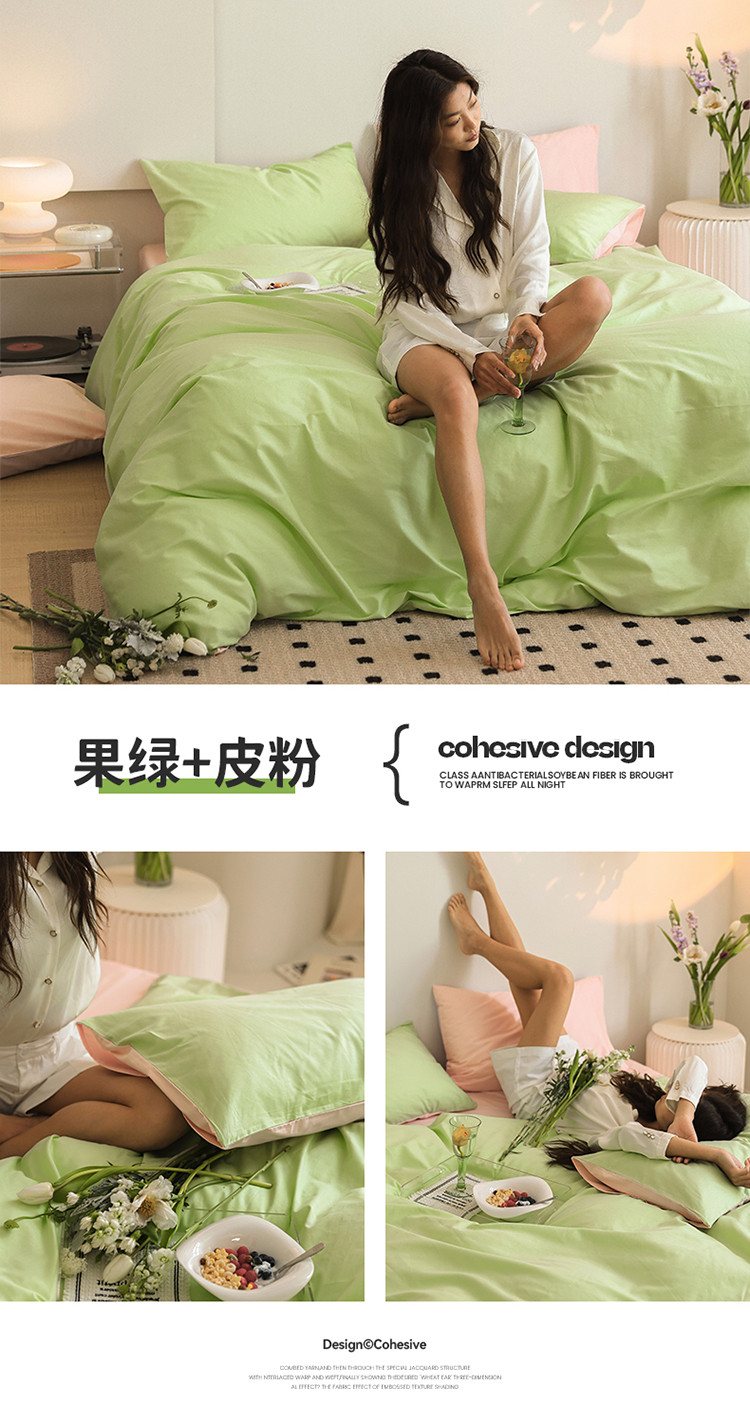 当前位置: 91家纺网 > 商品网购 > 床品套件 > 四件套 > 全棉普通四件套 > 寐眠 2023新款40支长绒棉全棉纯棉纯色双拼四件套 果绿+皮粉
