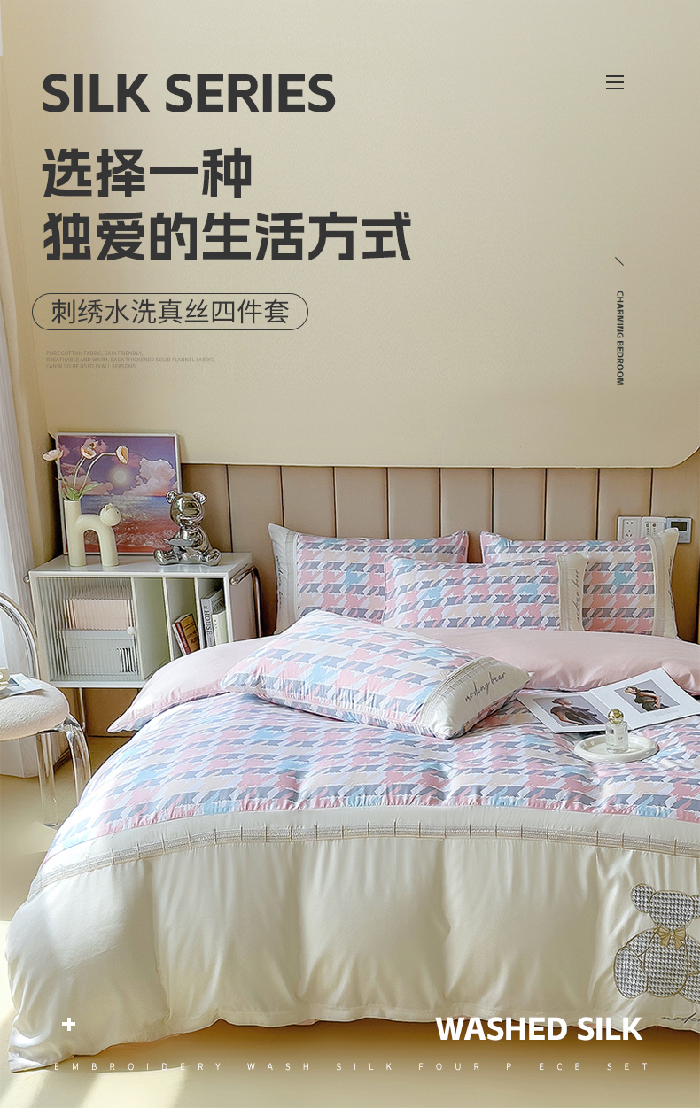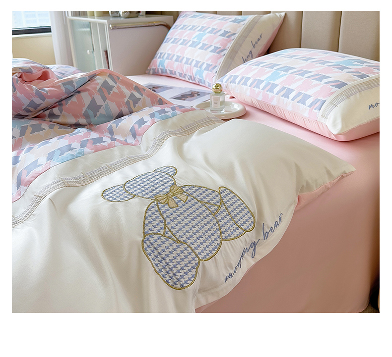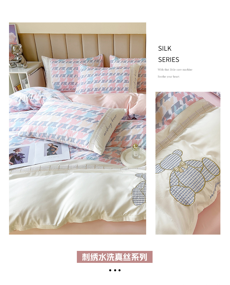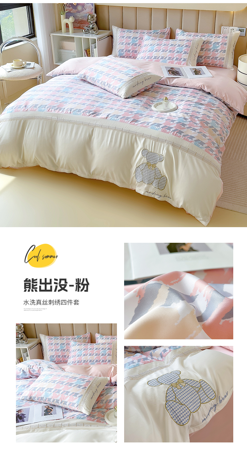 当前位置: 91家纺网 > 商品网购 > 床品套件 > 四件套 > 水洗真丝四件套 > (总)芃成家纺 2023新款刺绣水洗真丝四件套-刺绣小熊