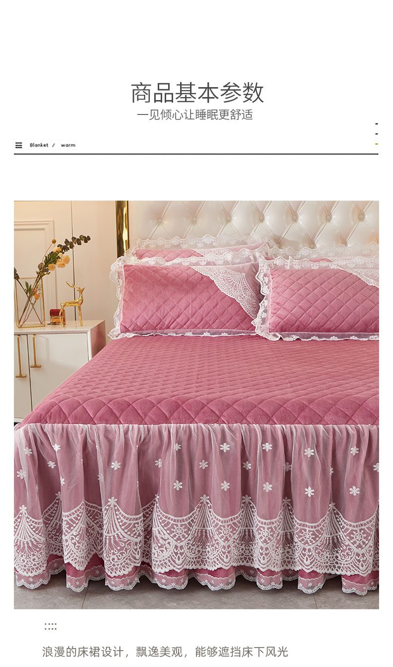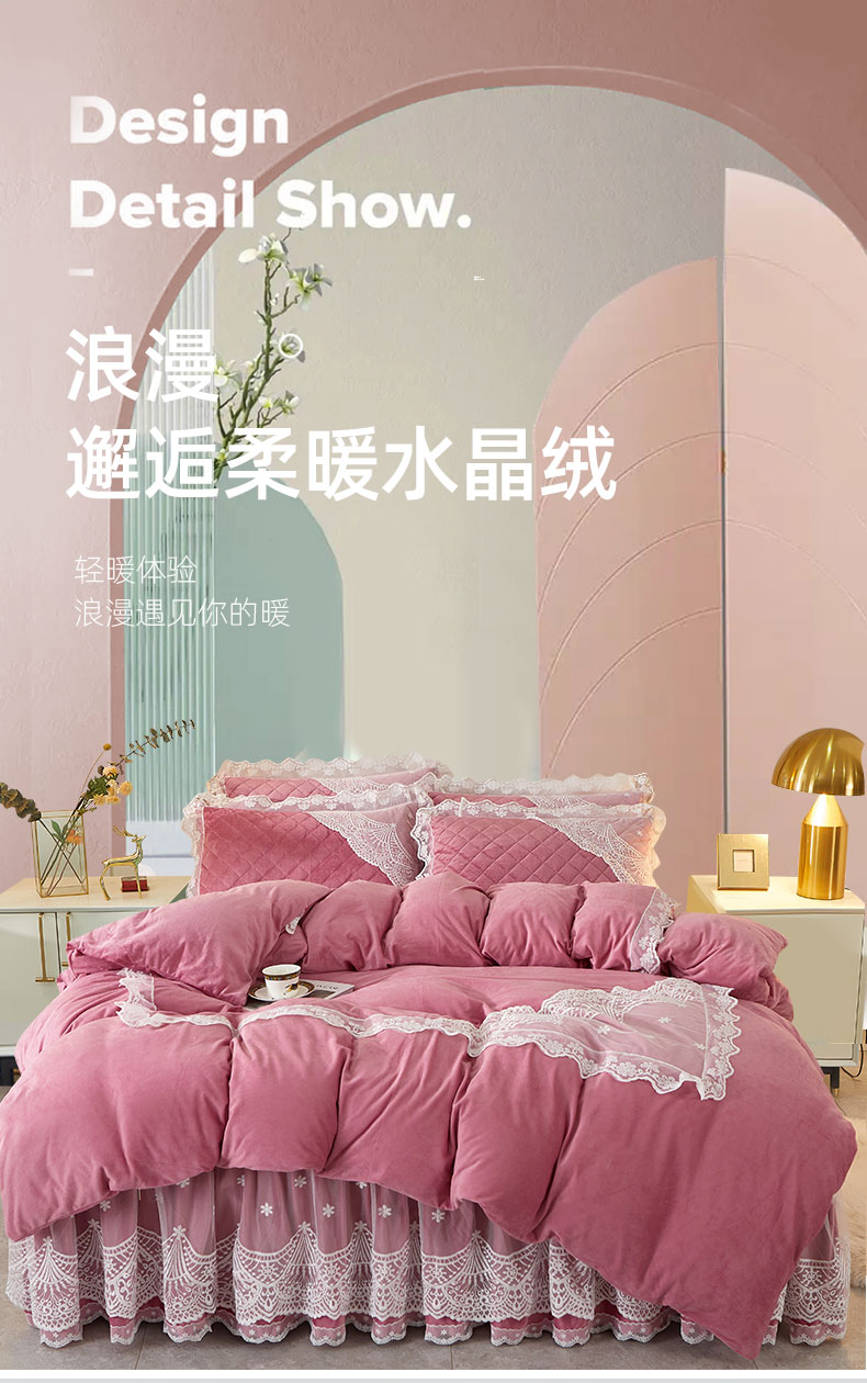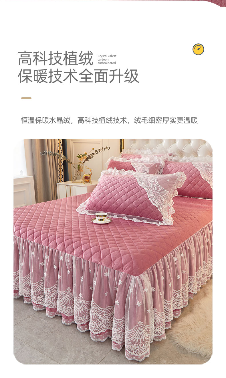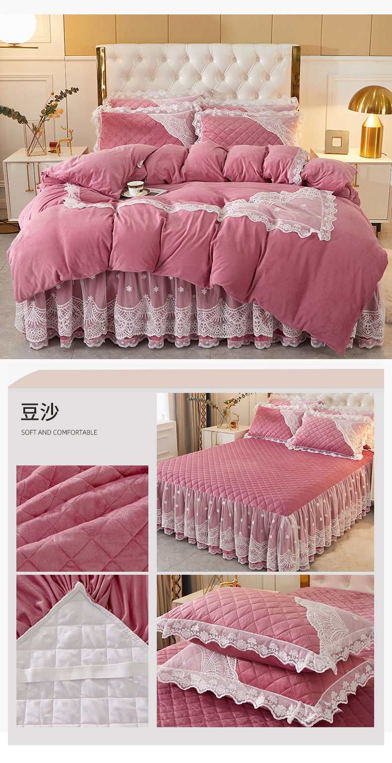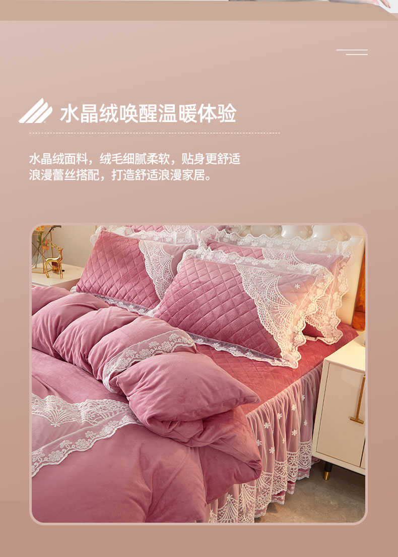 当前位置: 91家纺网 > 商品网购 > 床品套件 > 四件套 > 全棉普通四件套 > 2023新款水晶绒保暖床裙四件套爱妮系列 豆沙