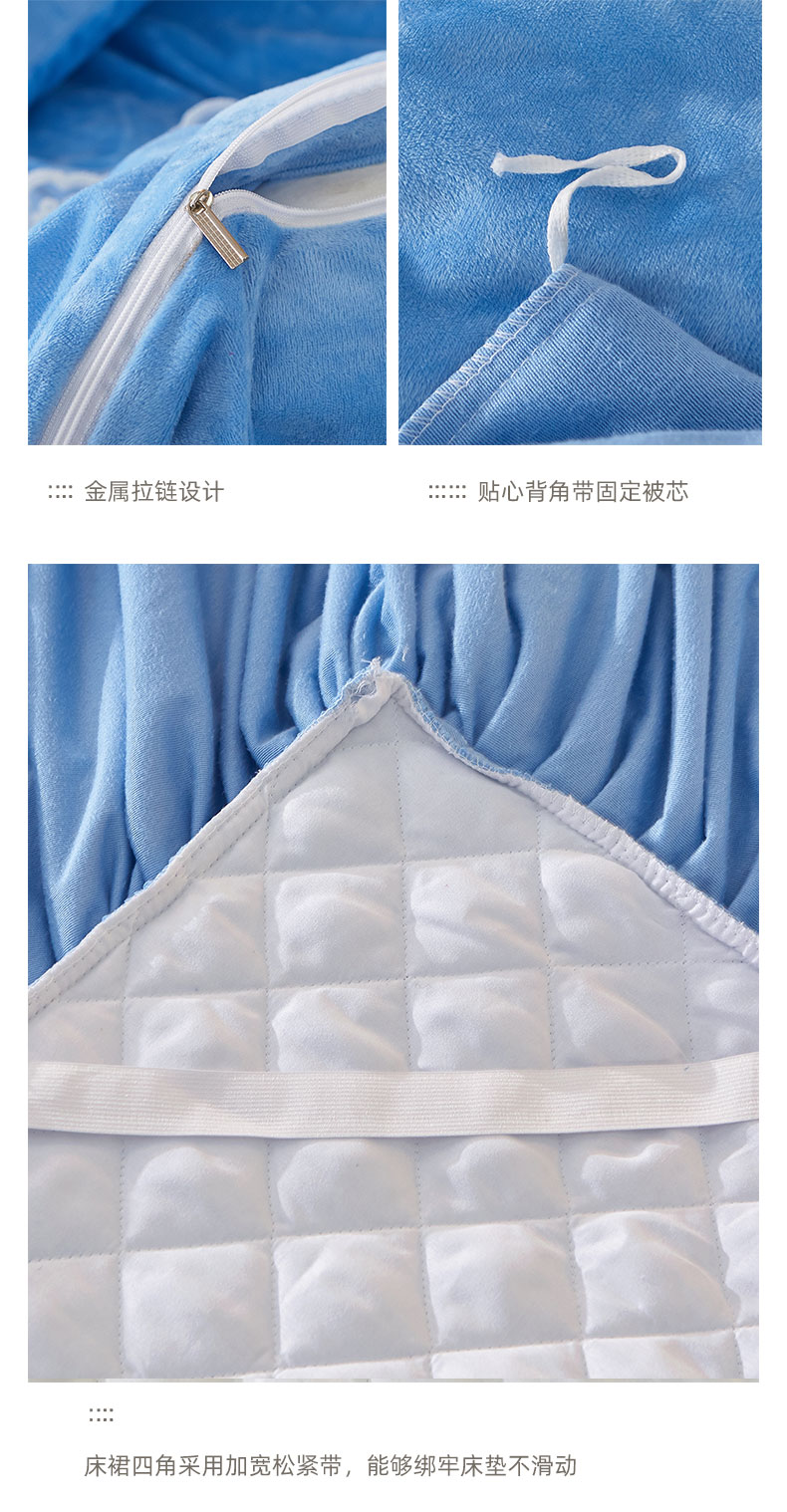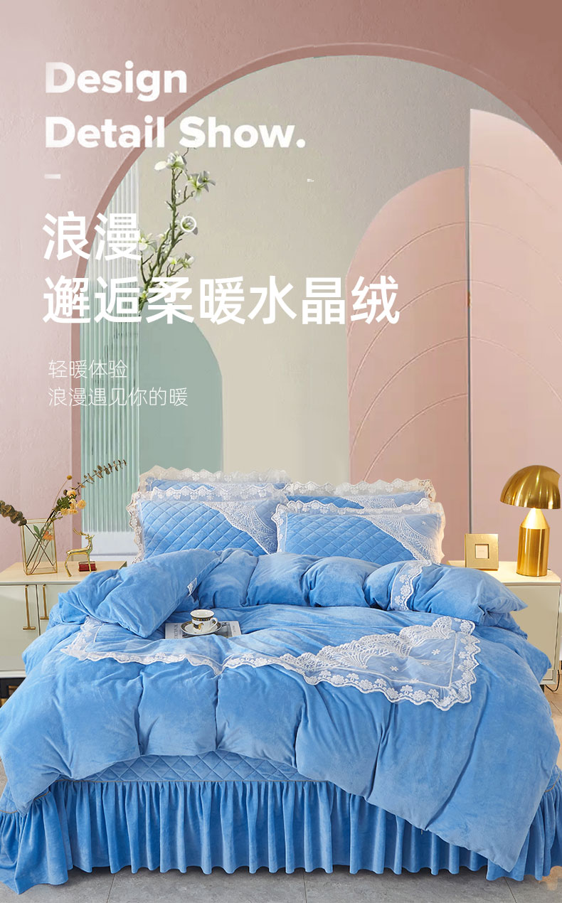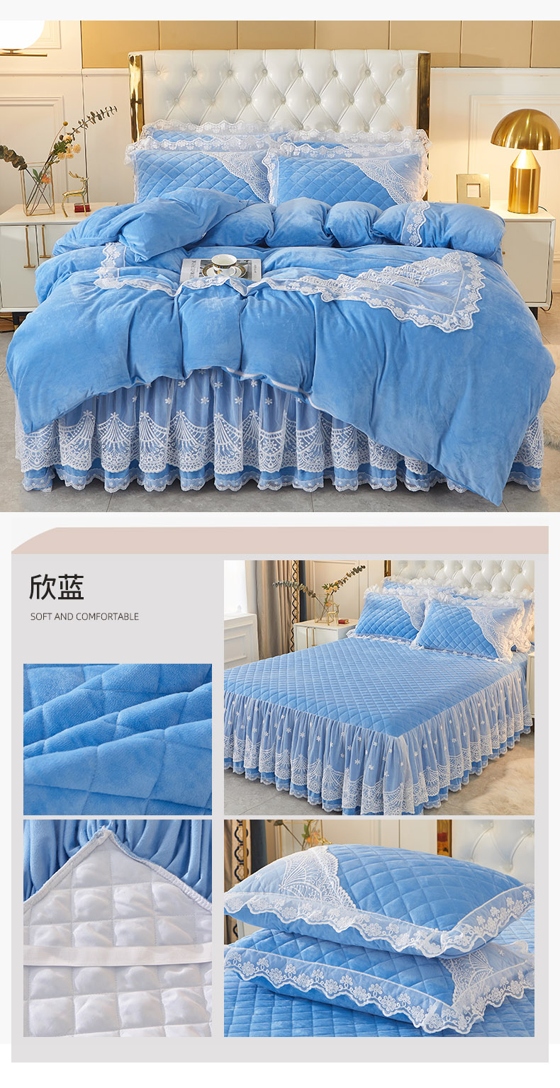当前位置: 91家纺网 > 商品网购 > 床品套件 > 四件套 > 全棉普通四件套 > 2023新款水晶绒保暖床裙四件套爱妮系列 欣蓝