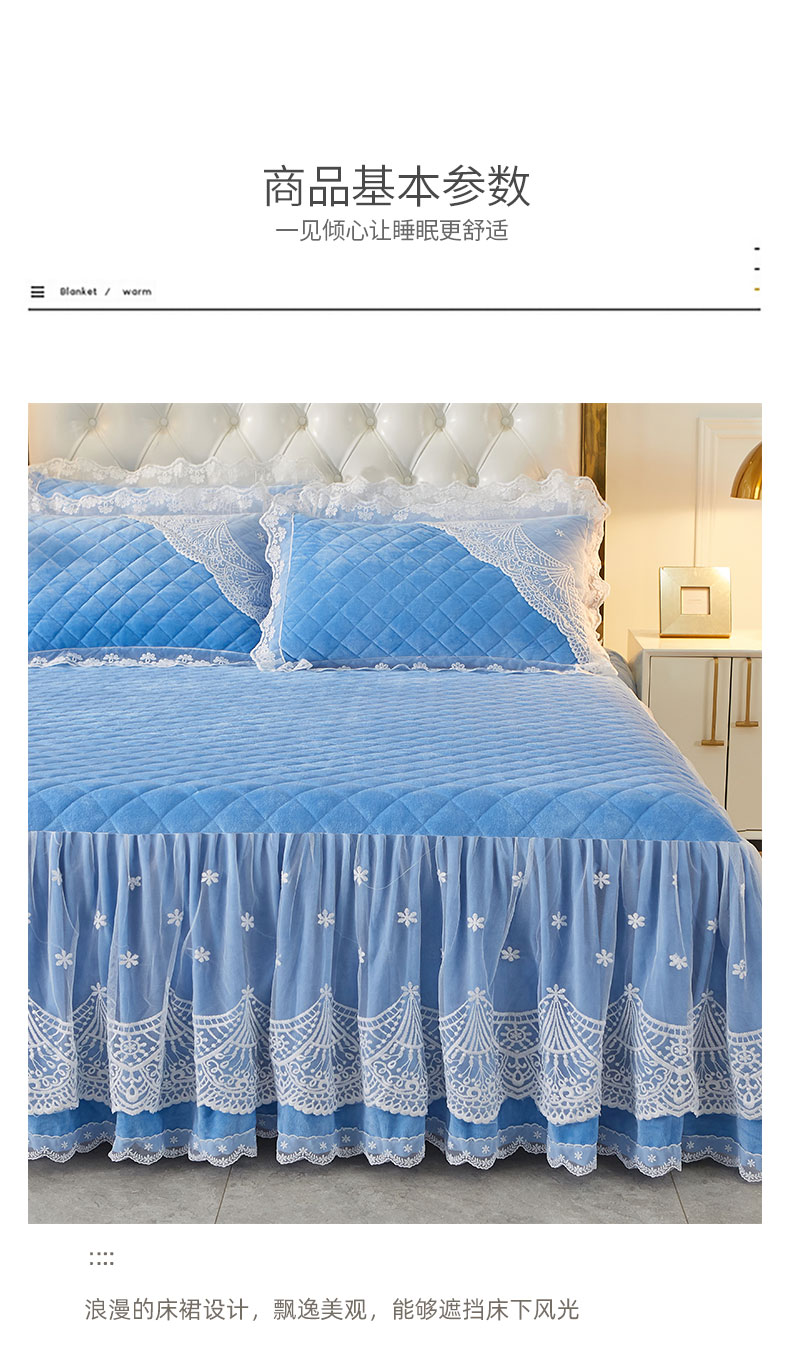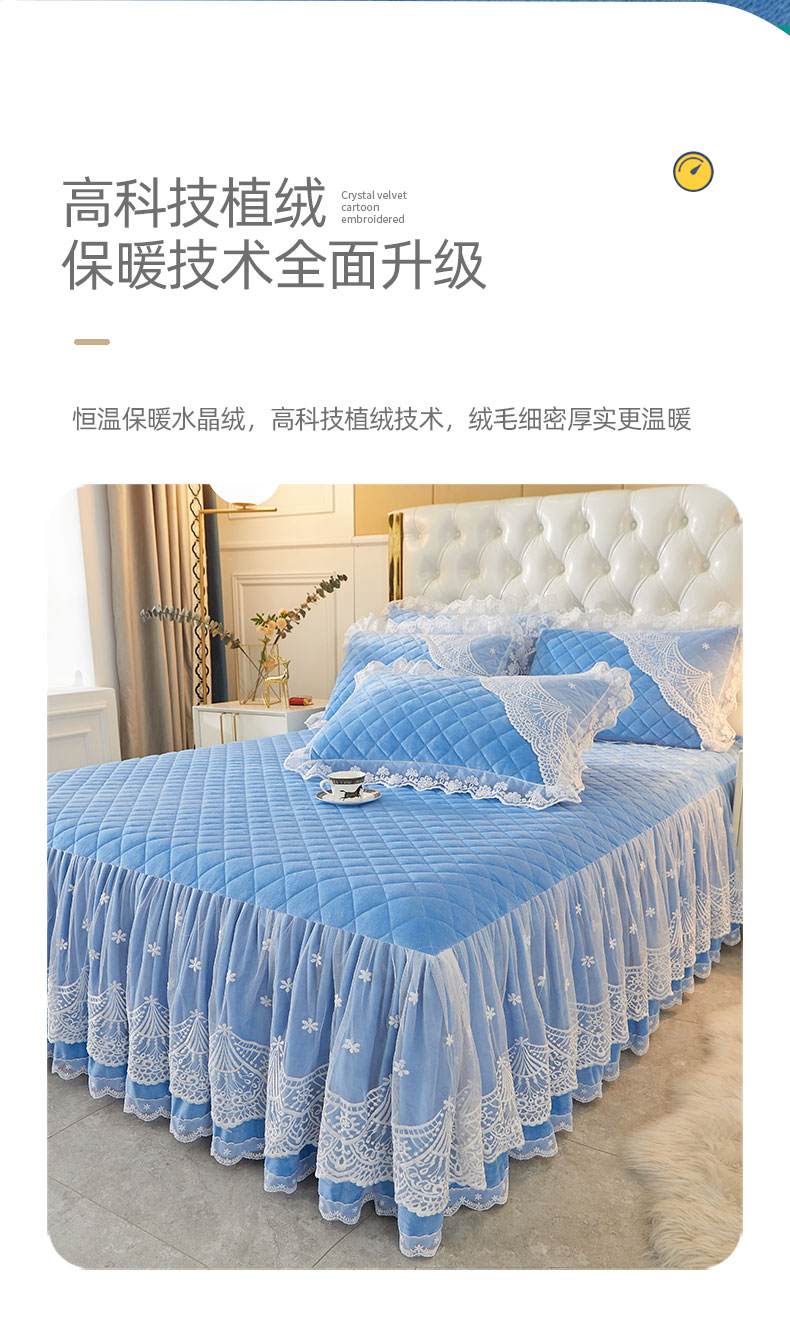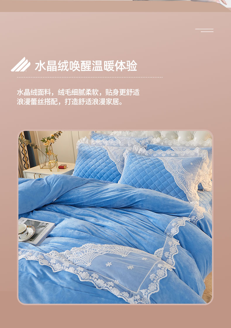 当前位置: 91家纺网 > 商品网购 > 床品套件 > 四件套 > 全棉普通四件套 > 2023新款水晶绒保暖床裙四件套爱妮系列 欣蓝