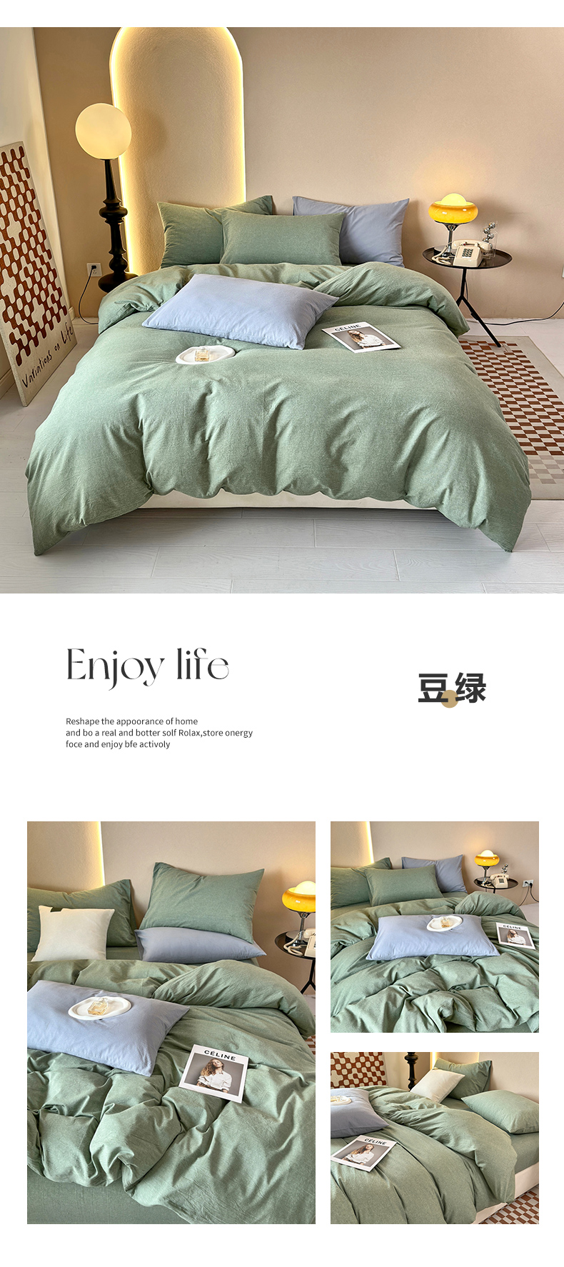 三沁 2023新款直播爆款A类全棉纯棉水洗棉简约无印风纯色四件套 豆绿