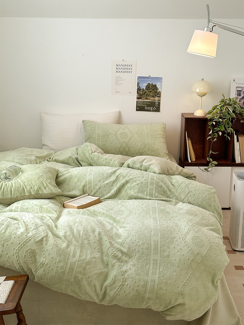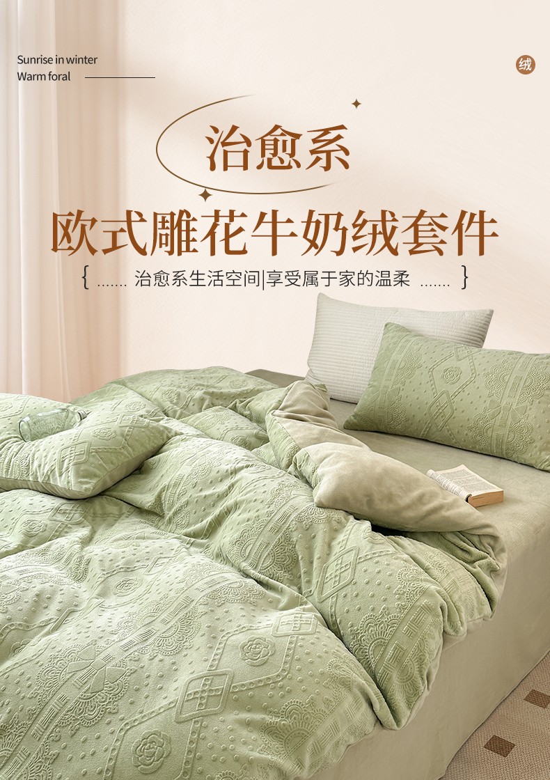 优彩 2023新款高克重烂花牛奶绒剪花立体雕花牛奶绒四件套 米兰-森绿