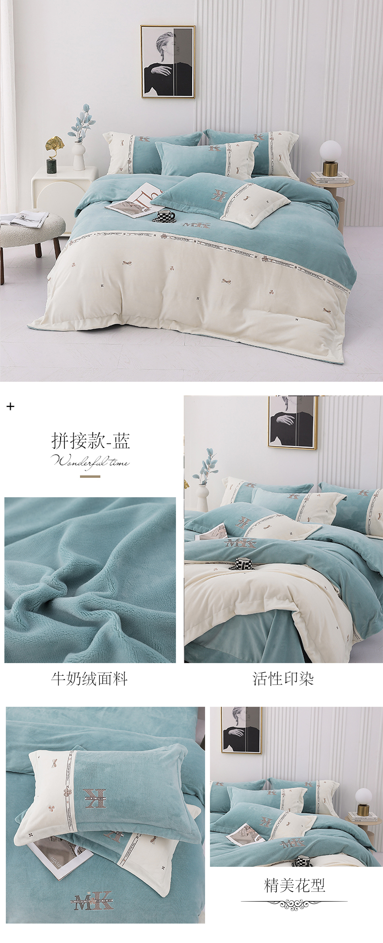 商品名称:寐时代 2023新款全消光A类牛奶绒工艺款四件套 马克-蓝