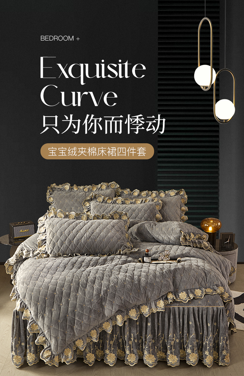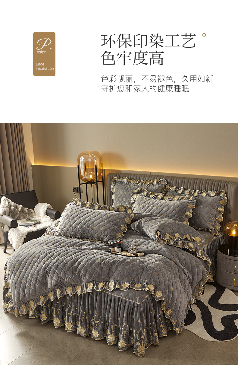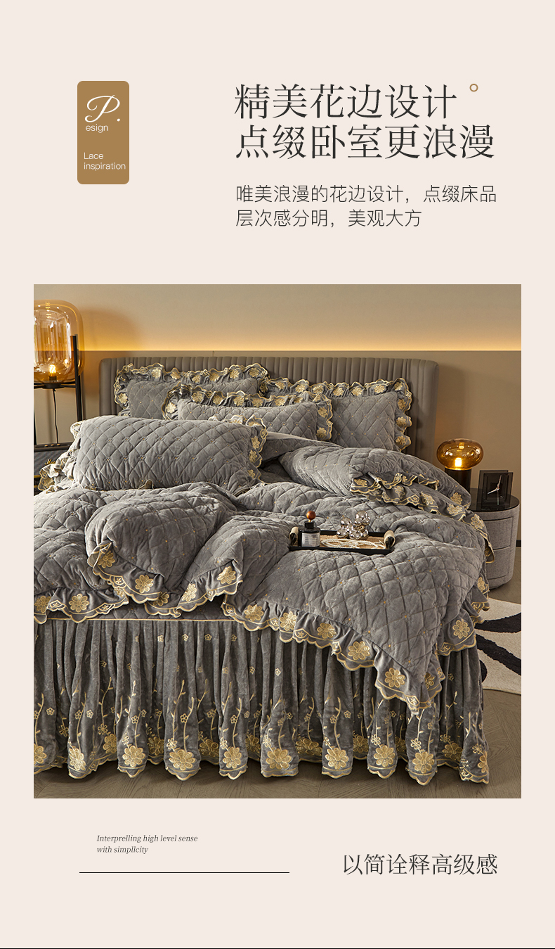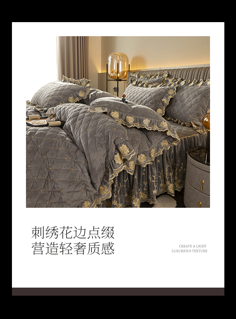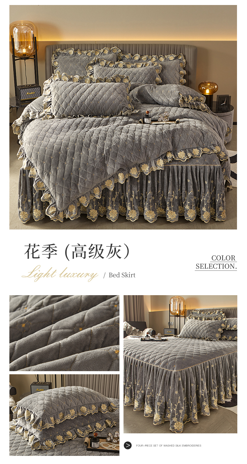 当前位置: 91家纺网 > 商品网购 > 床品套件 > 四件套 > 宝宝绒四件套 > 罗艺轩 2024新款花季宝宝绒全套夹棉絎缝加厚系列床裙套件 高级灰