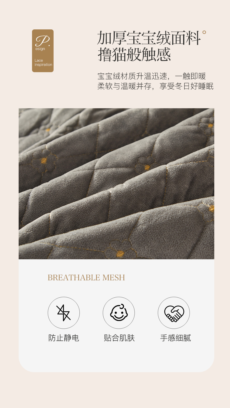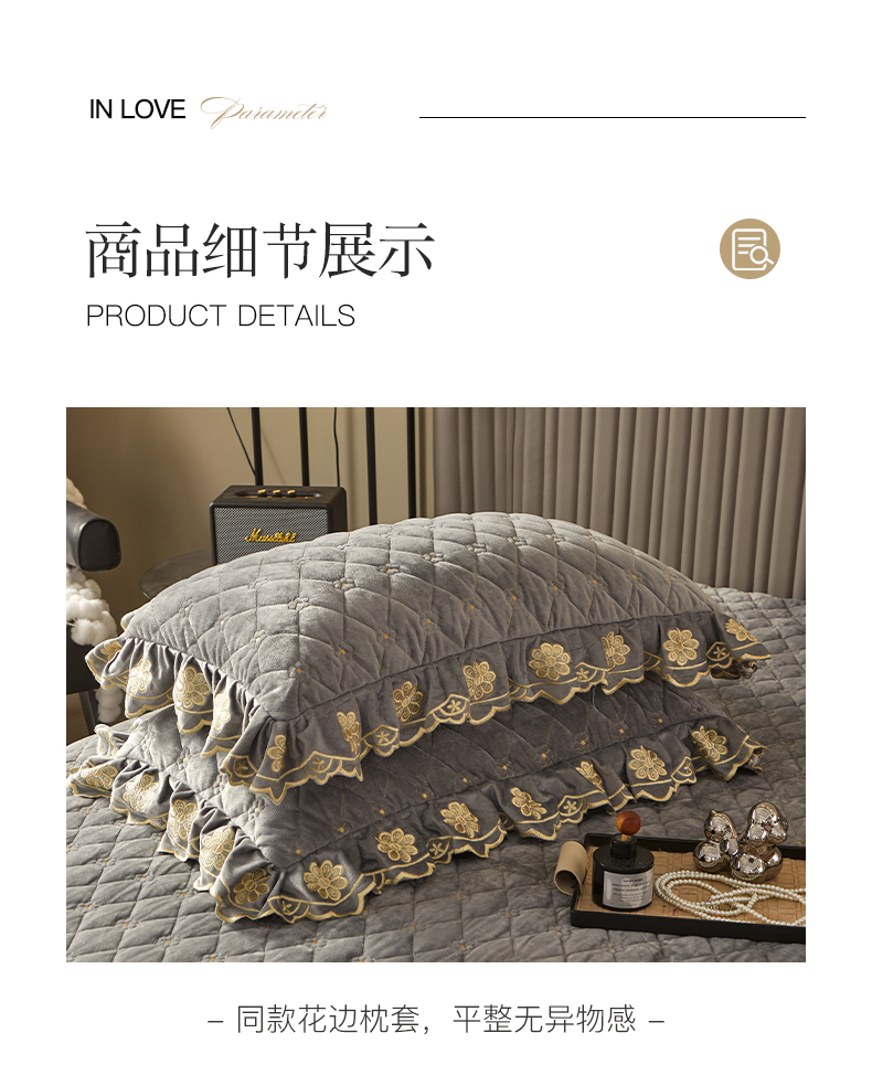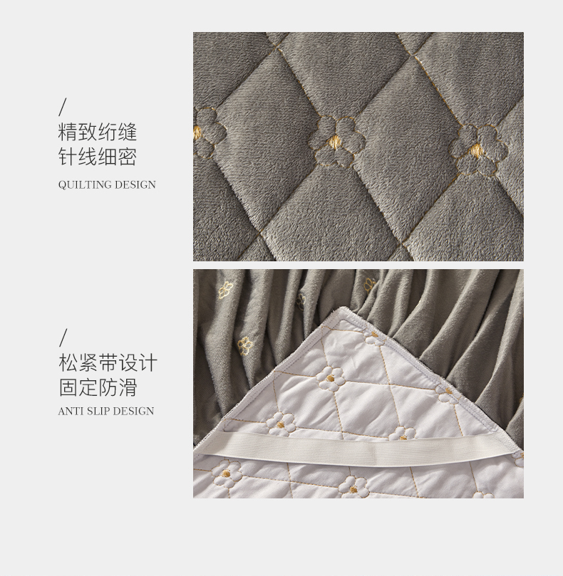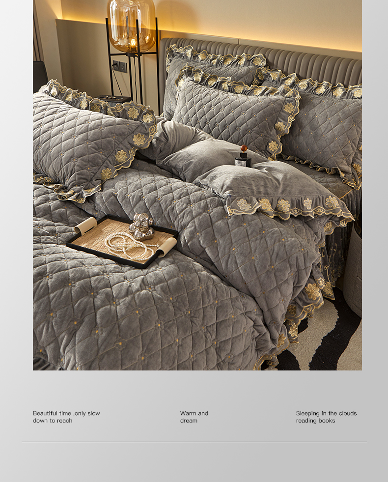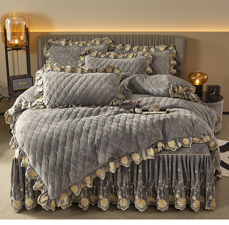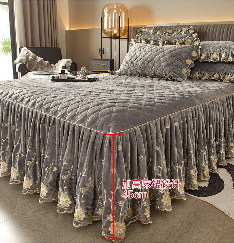 当前位置: 91家纺网 > 商品网购 > 床品套件 > 四件套 > 宝宝绒四件套 > 罗艺轩 2024新款花季宝宝绒全套夹棉絎缝加厚系列床裙套件 高级灰