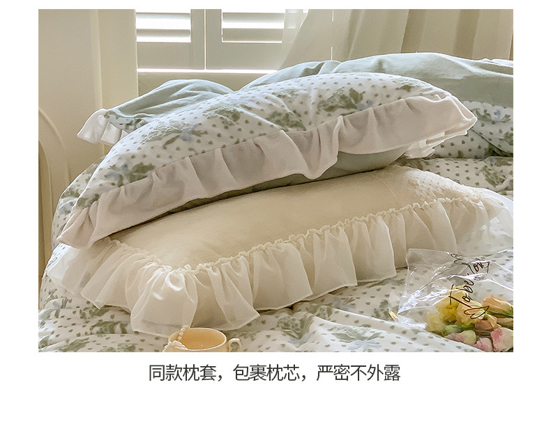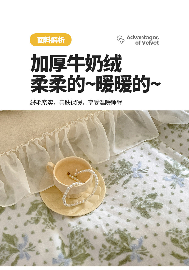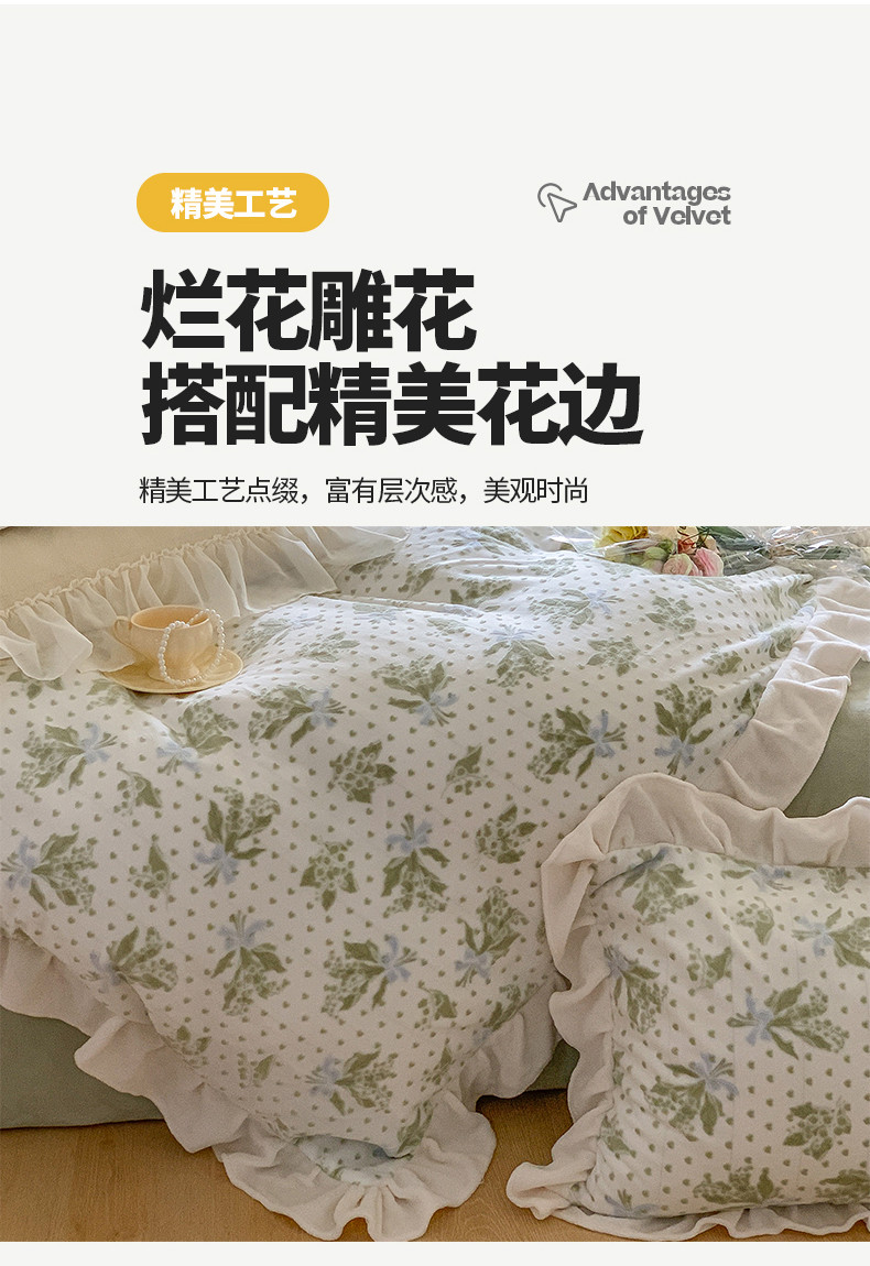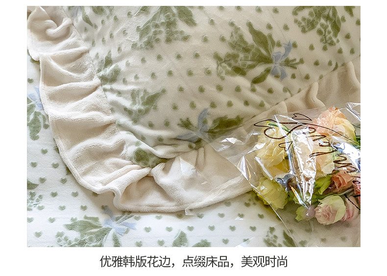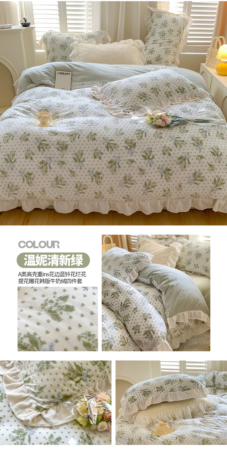 商品名称:桃子家居 2023新款A类高克重ins花边3D立体韩版牛奶绒四件套 绒烂花-温妮清新绿