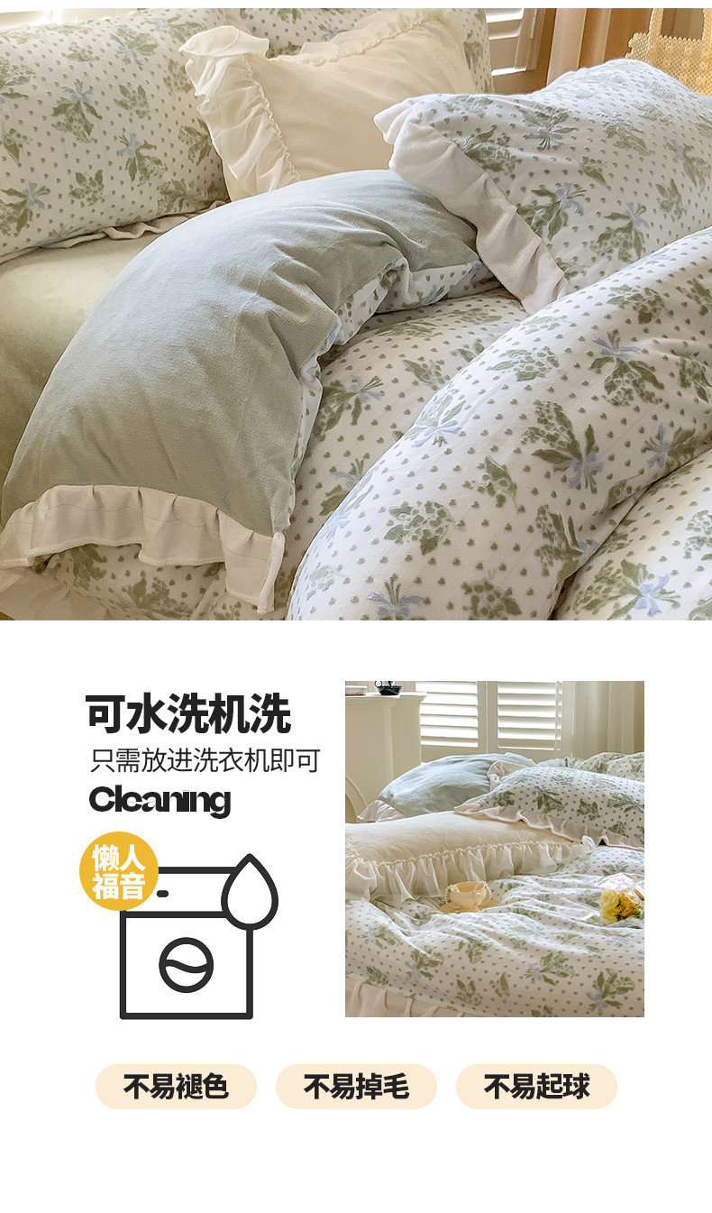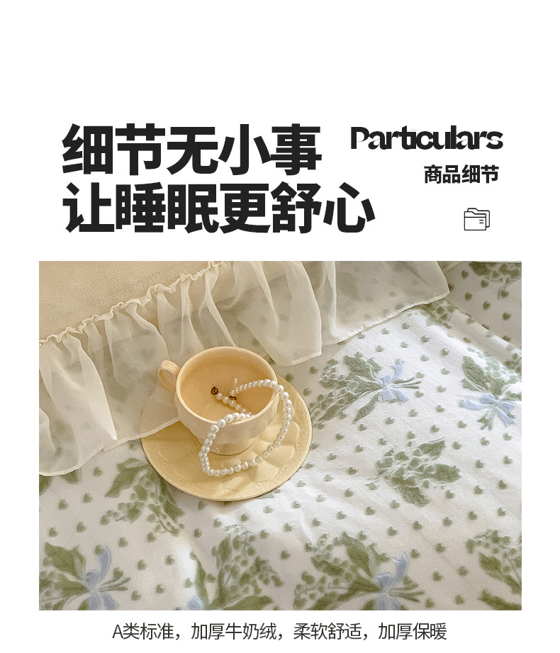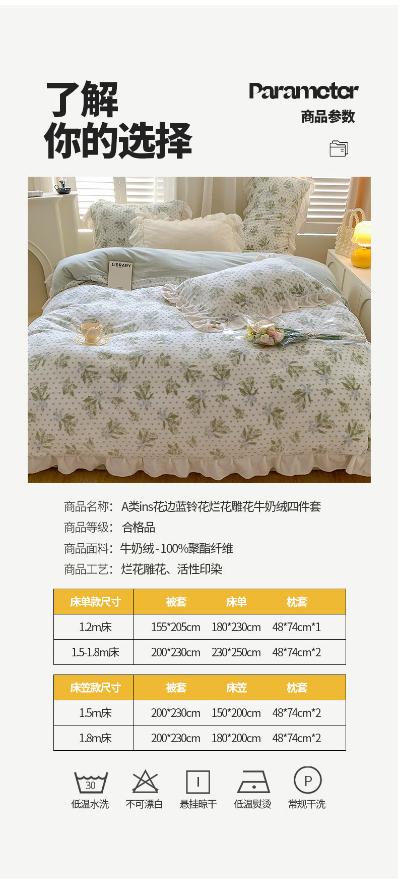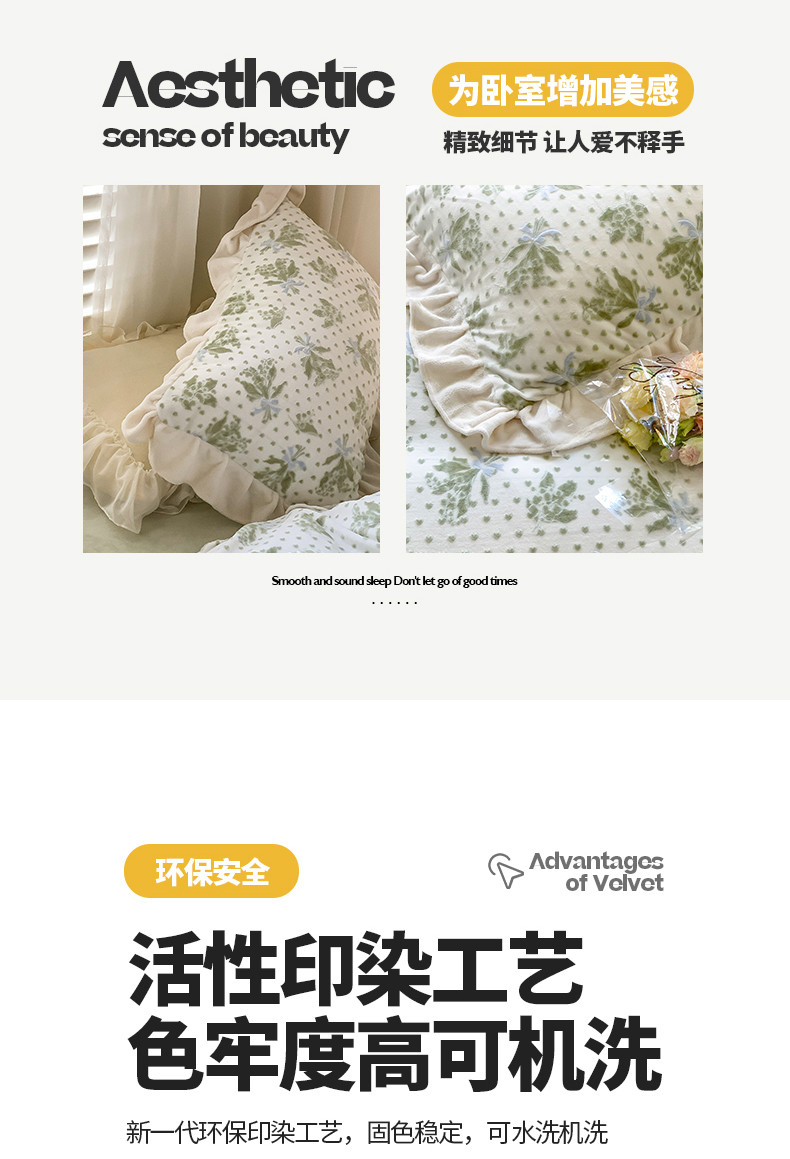商品名称:桃子家居 2023新款A类高克重ins花边3D立体韩版牛奶绒四件套 绒烂花-温妮清新绿
