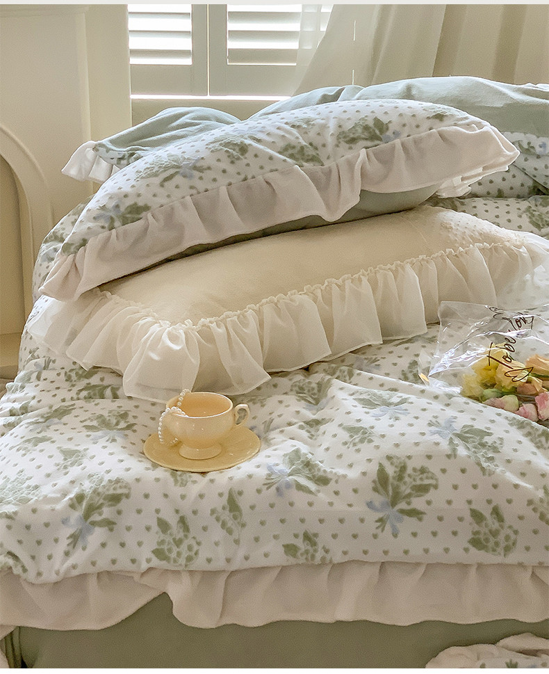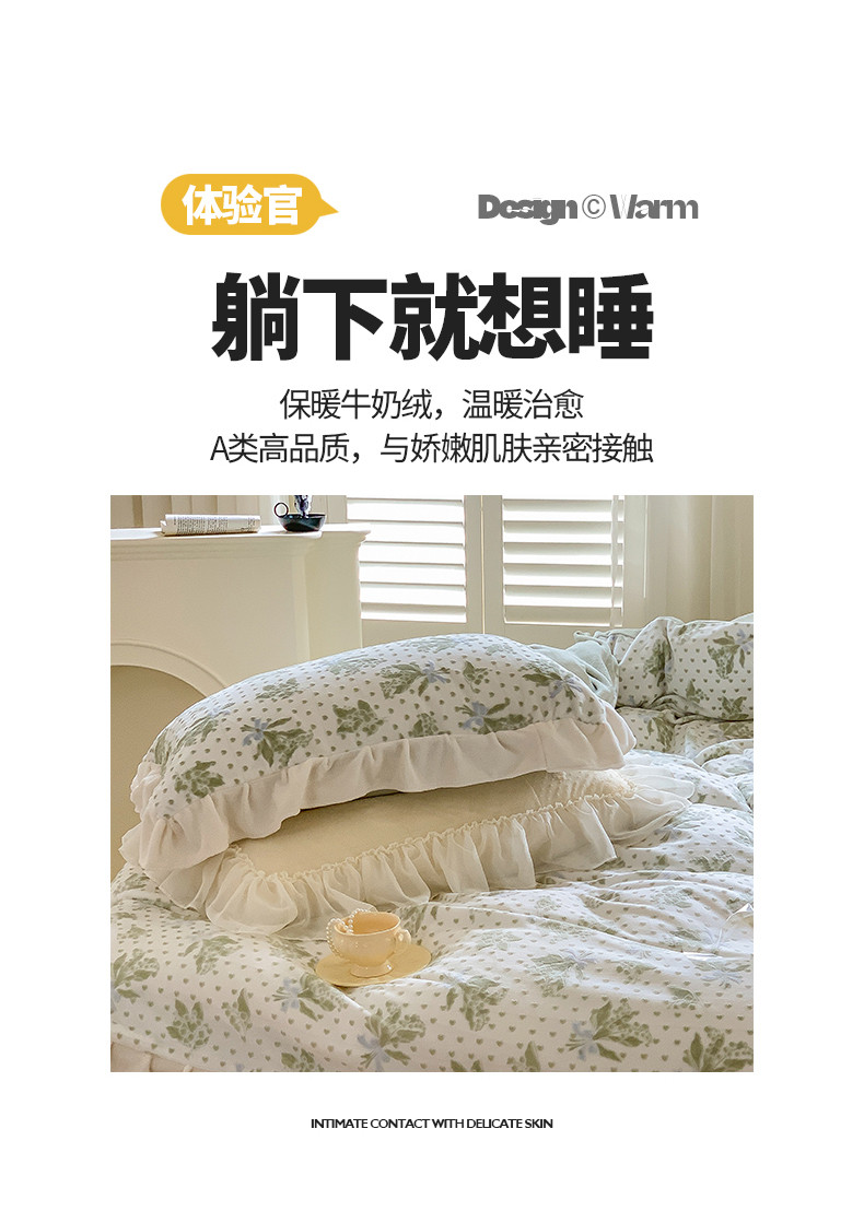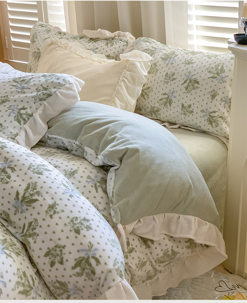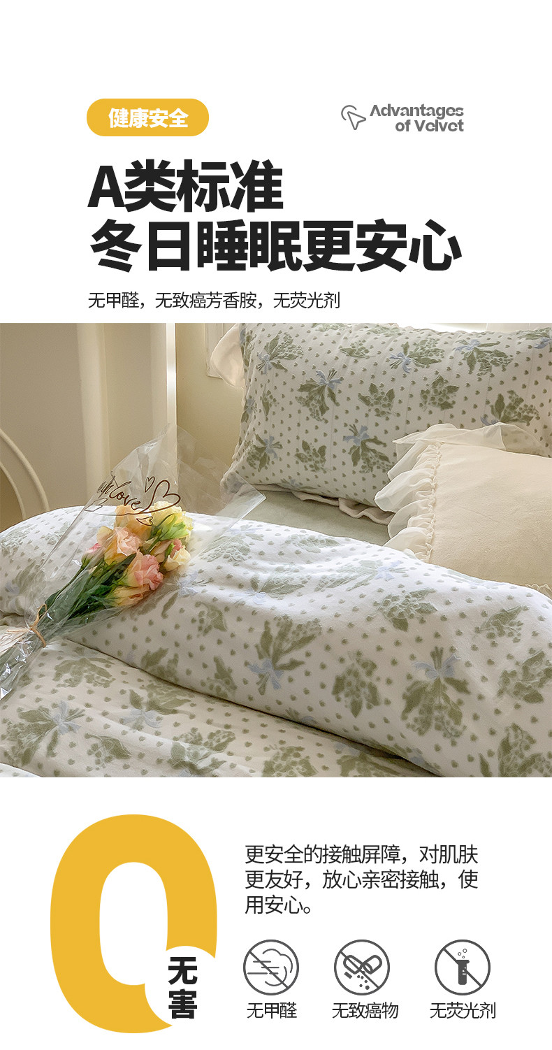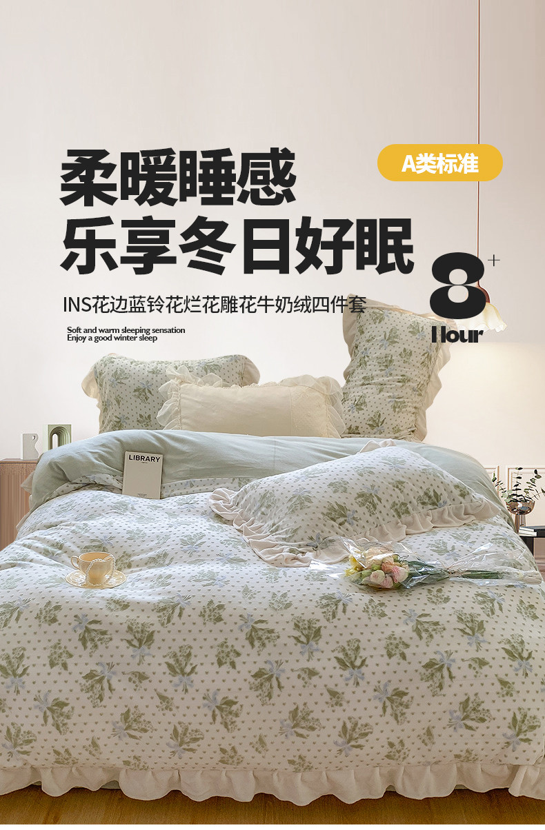 商品名称:桃子家居 2023新款A类高克重ins花边3D立体韩版牛奶绒四件套 绒烂花-温妮清新绿