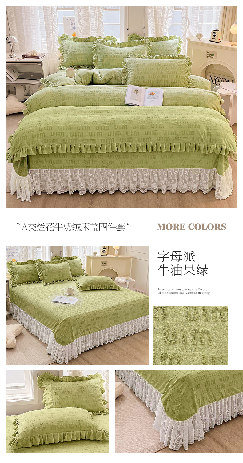 商品名称:宜凡 2023新款烂花牛奶绒床盖四件套 字母派-牛油果绿