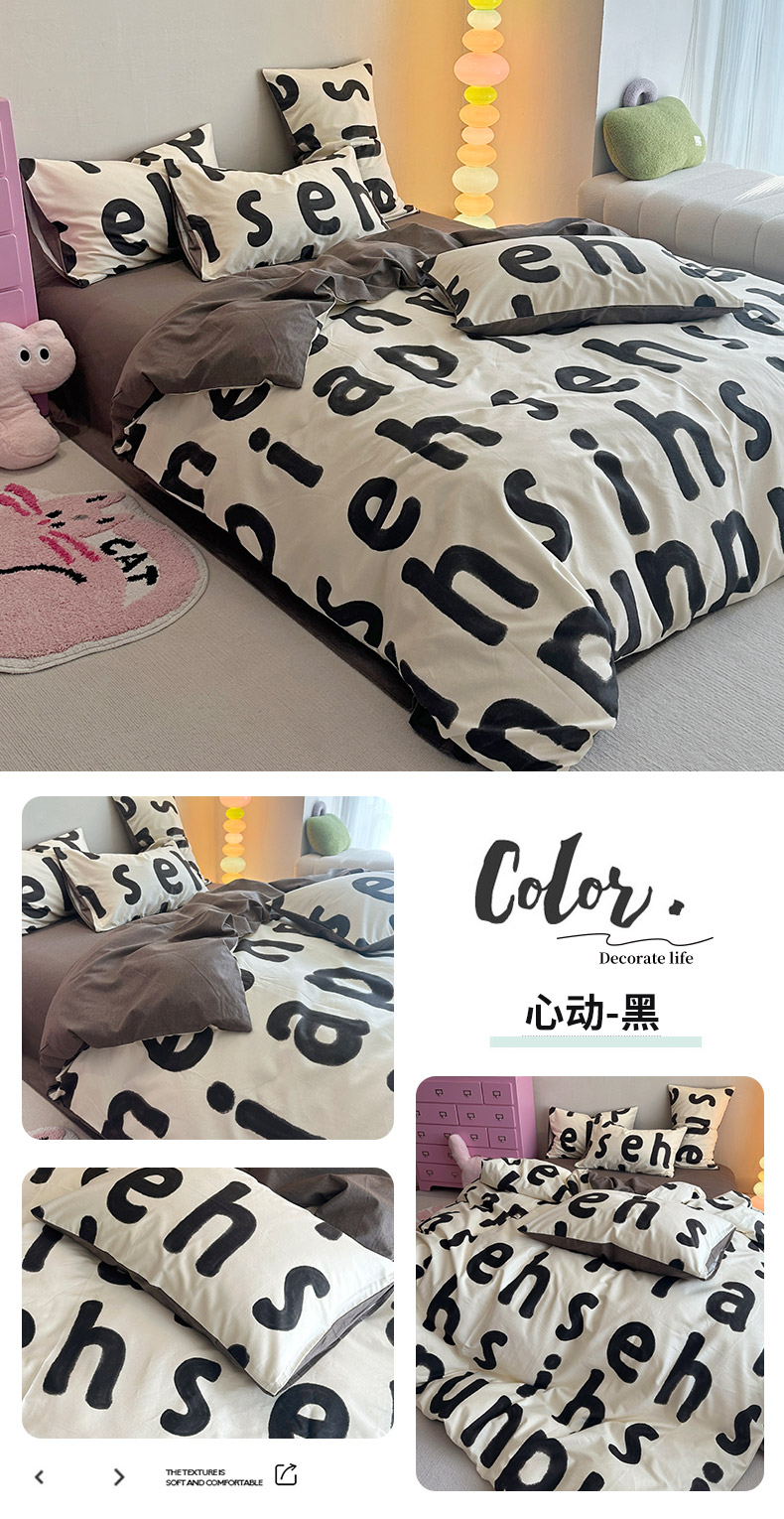 商品名称:千朵 2023新款全棉生态磨毛四件套 心动-黑