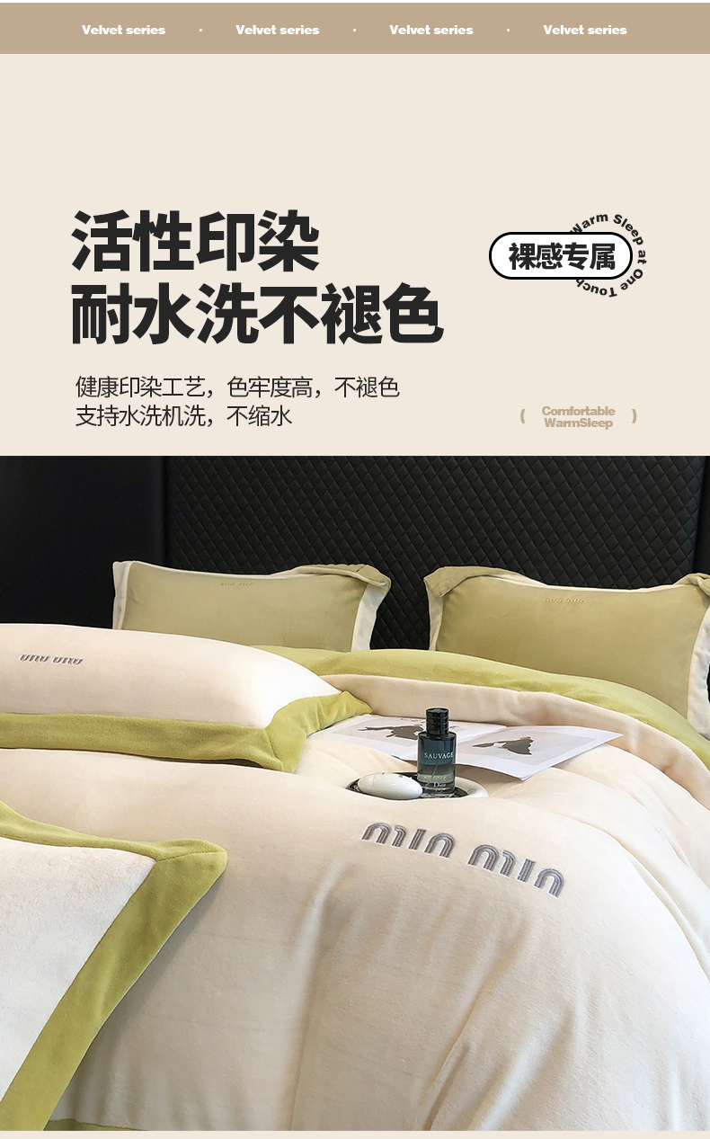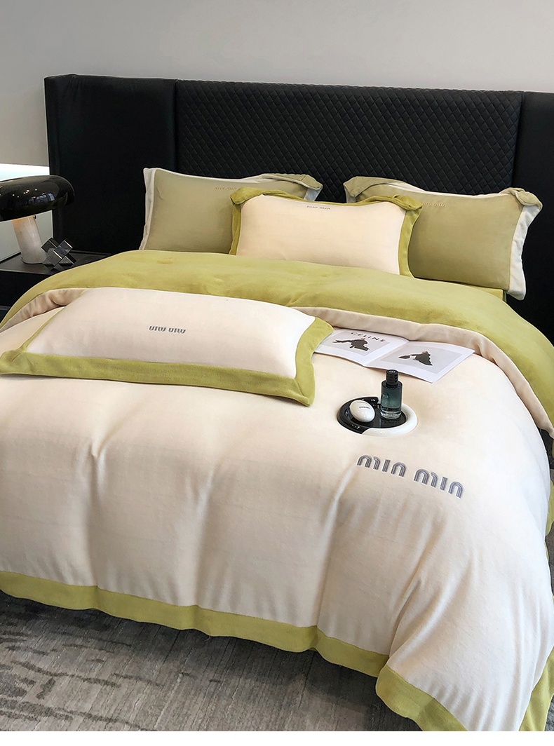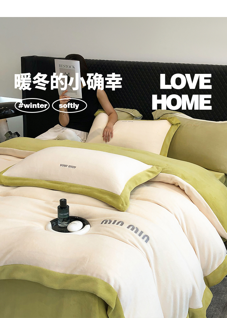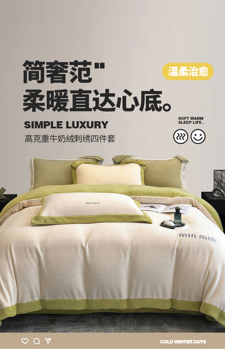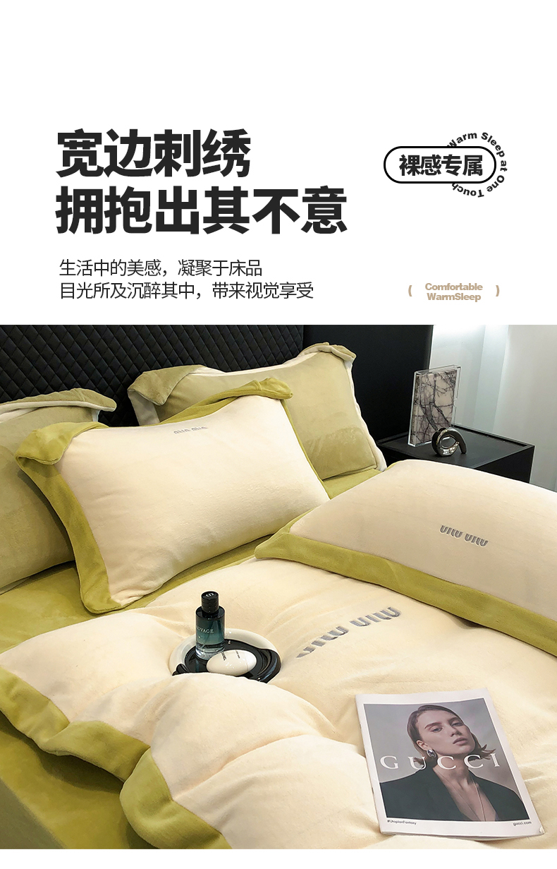 商品名称:懒猫家纺 2024新款贝利刺绣牛奶绒四件套 贝利-奶昔白绿