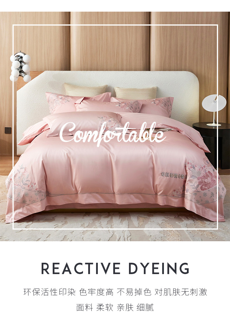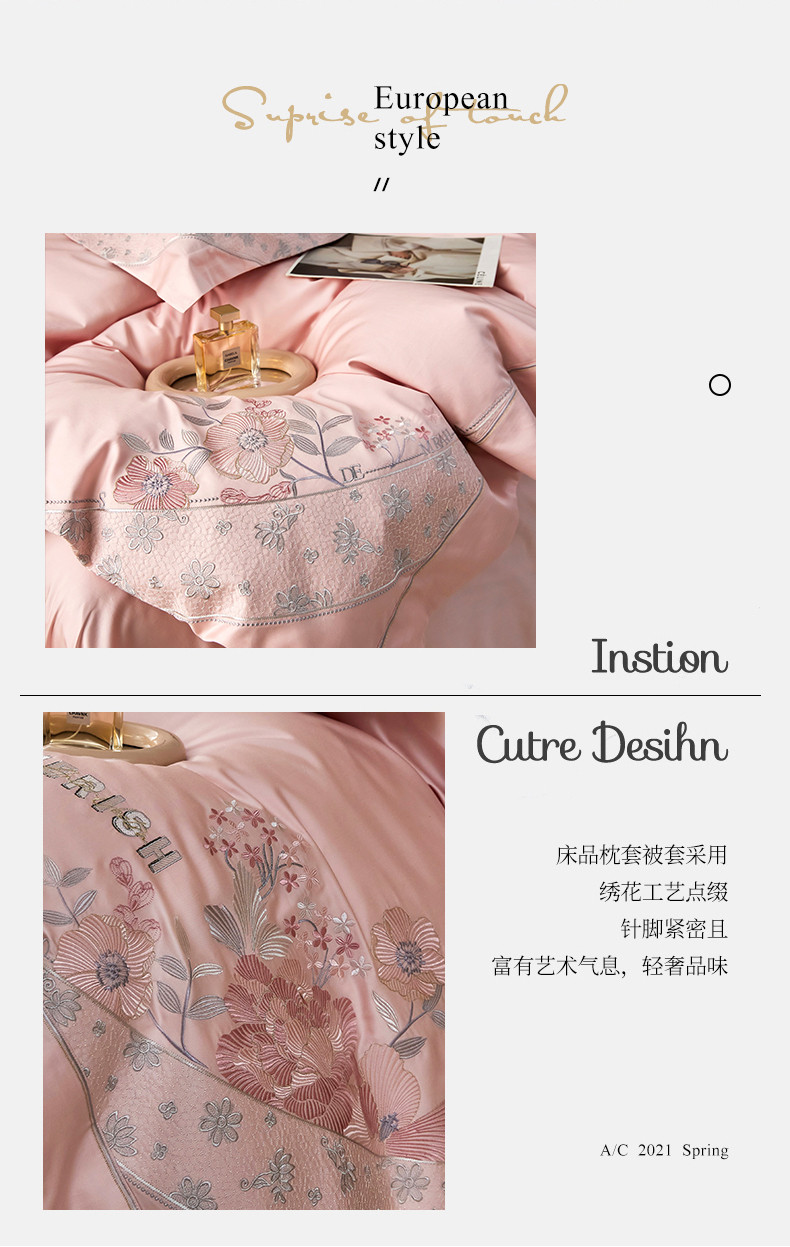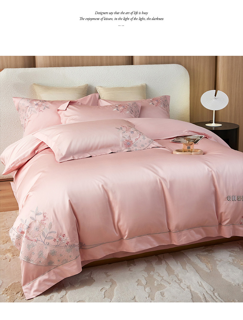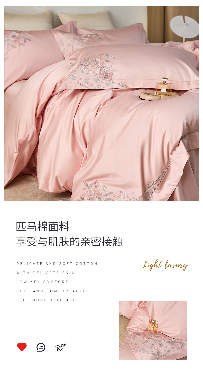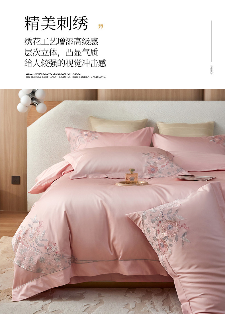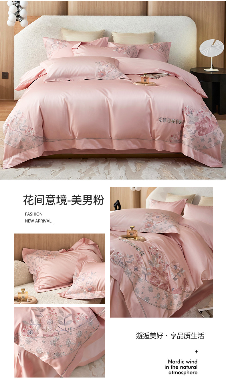宏羽纺 2023新款高支高密全棉绣花四件套--花间意境 美男粉