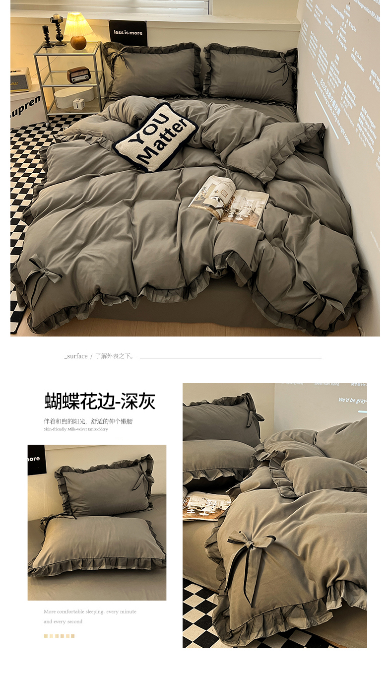 当前位置: 91家纺网 > 商品网购 > 床品套件 > 四件套 > 磨毛活性四件套 > 春光里 2024新款蝴蝶结花边磨毛四件套 蝴蝶花边-深灰