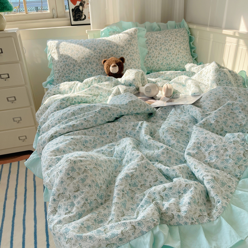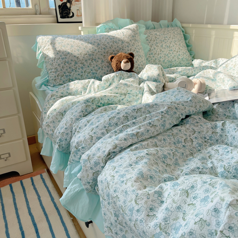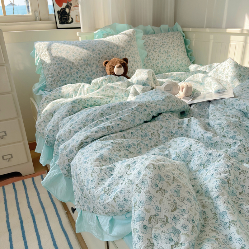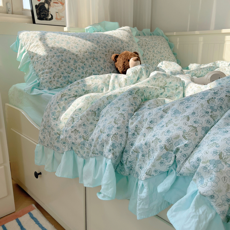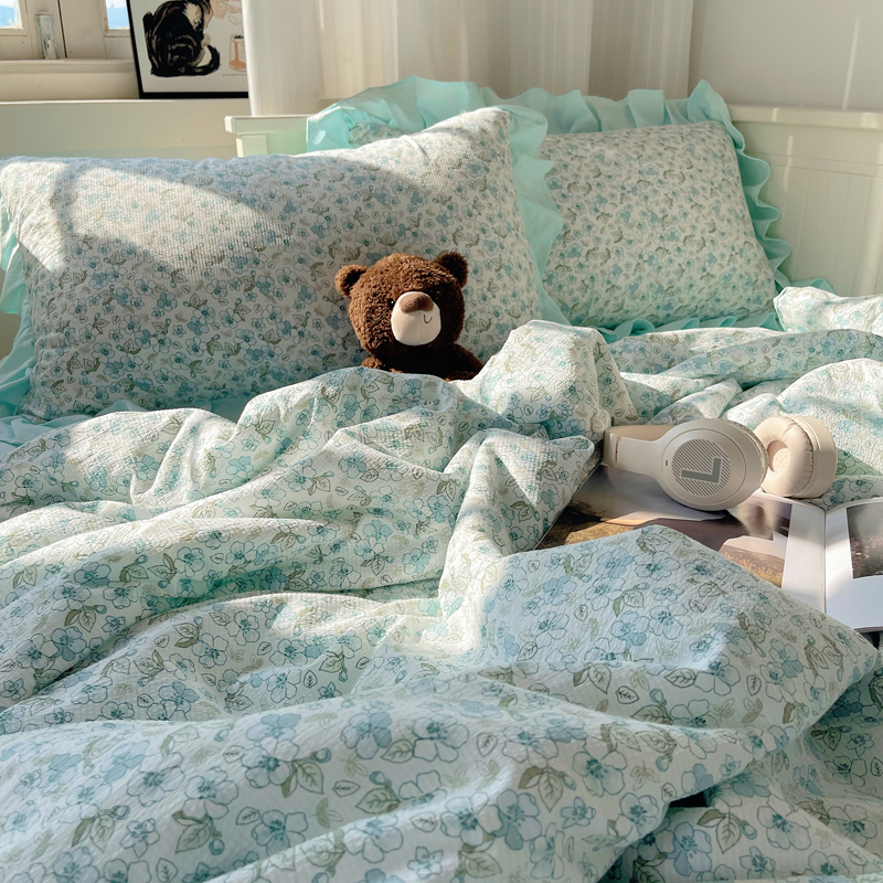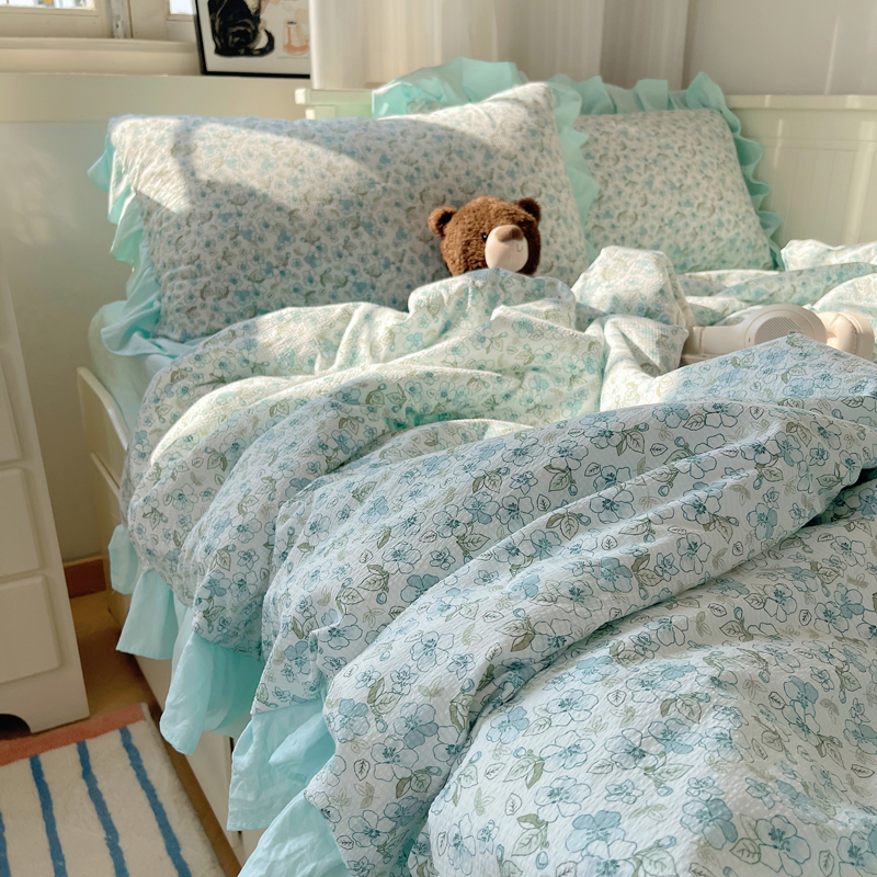 顾里家纺 2024新款韩系治愈小清新花边氧气泡泡棉夏被四件套 蓝海之恋