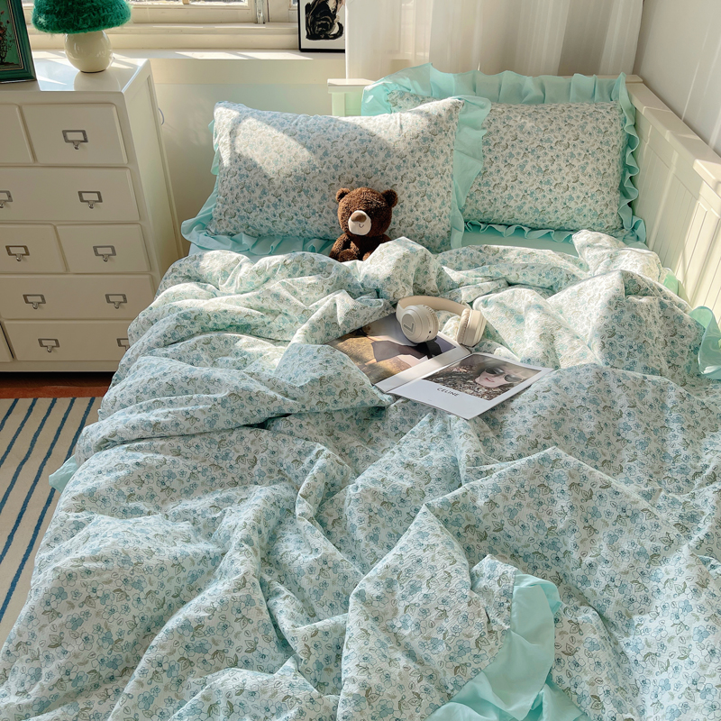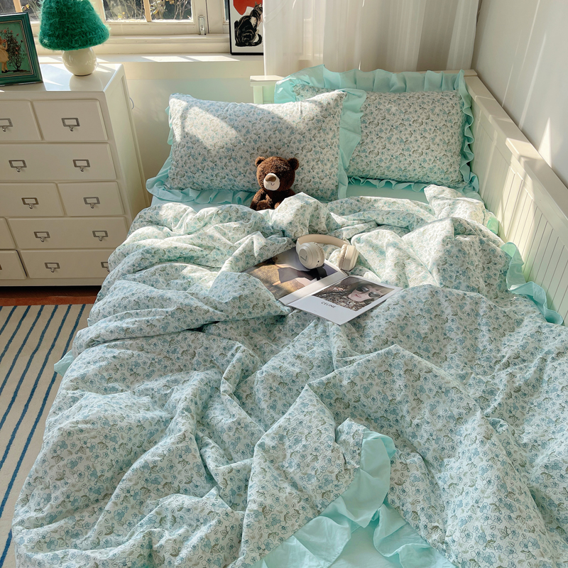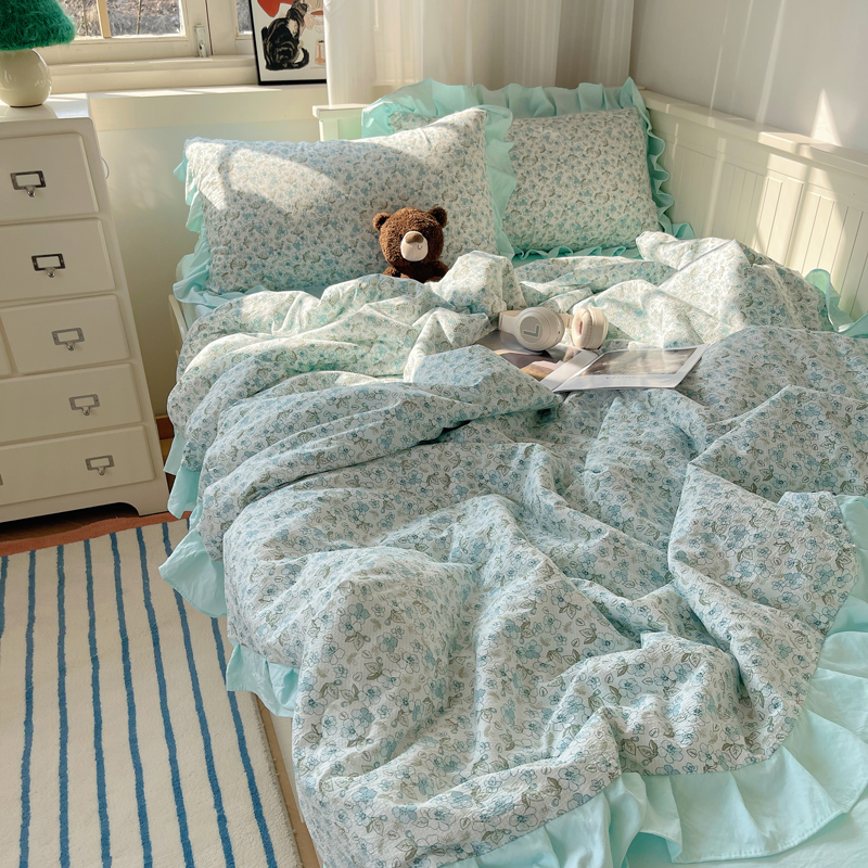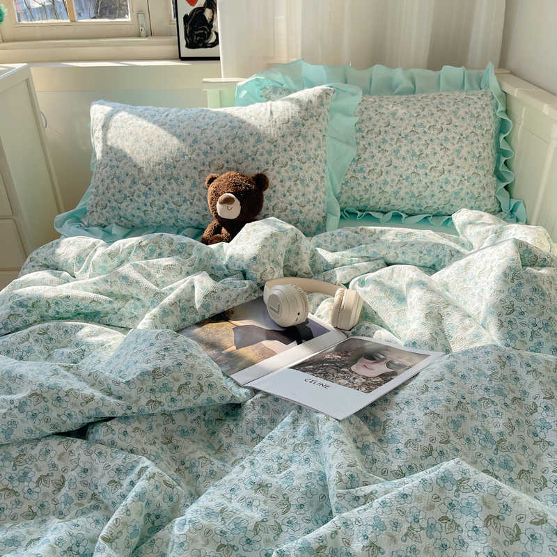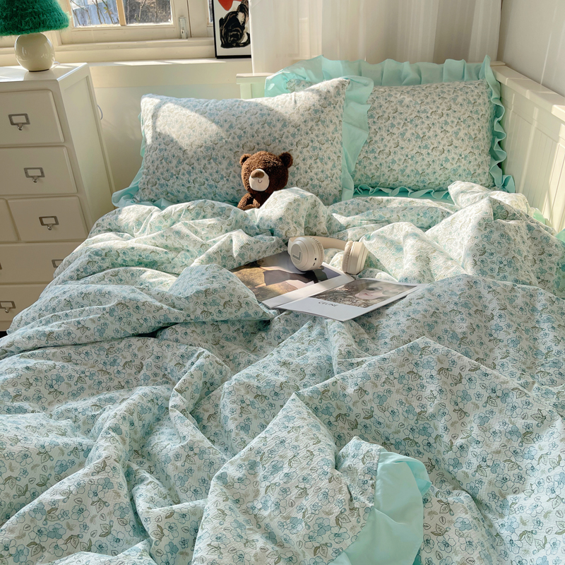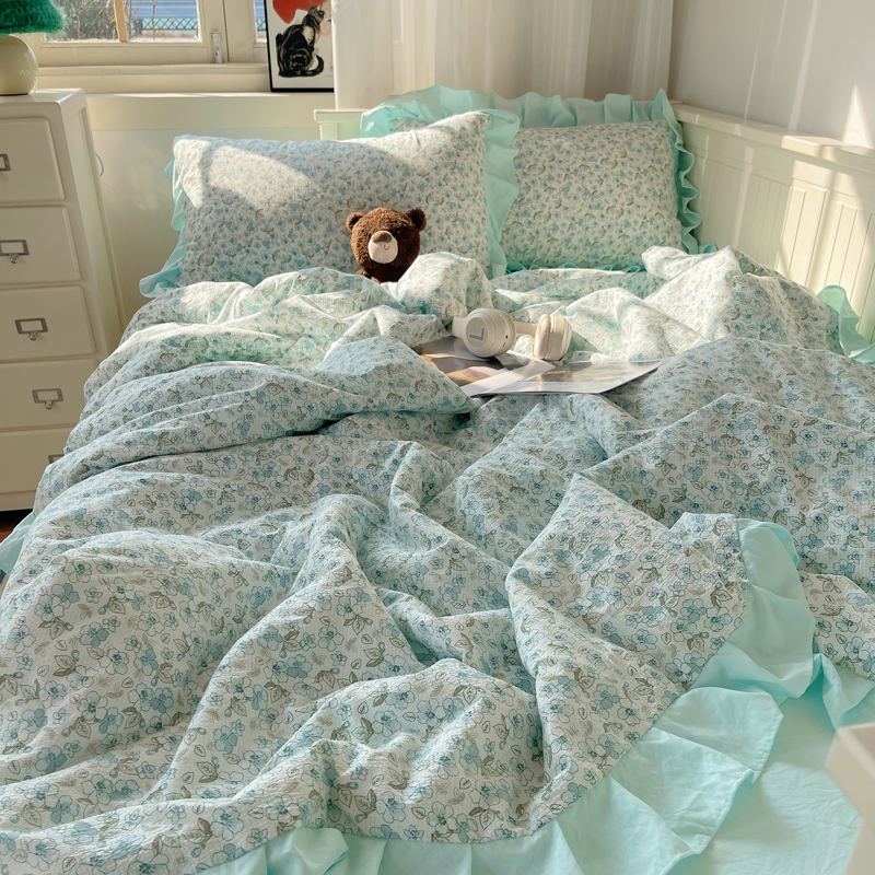 顾里家纺 2024新款韩系治愈小清新花边氧气泡泡棉夏被四件套 蓝海之恋