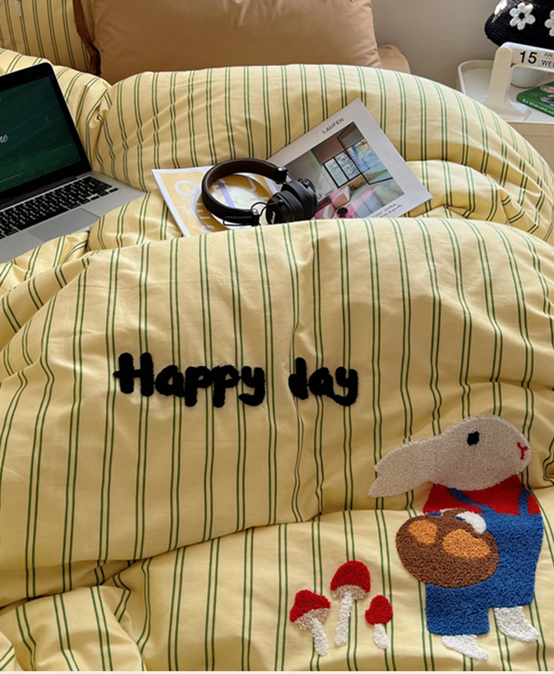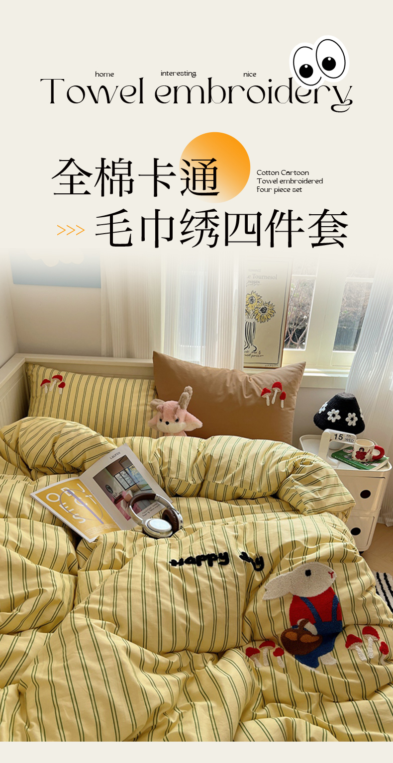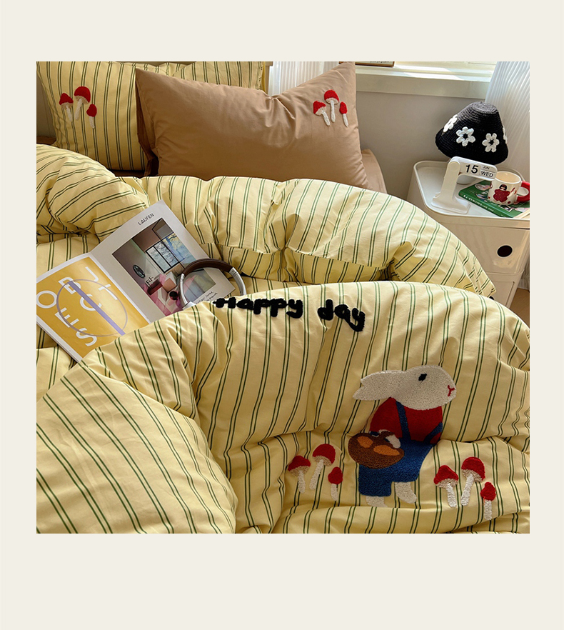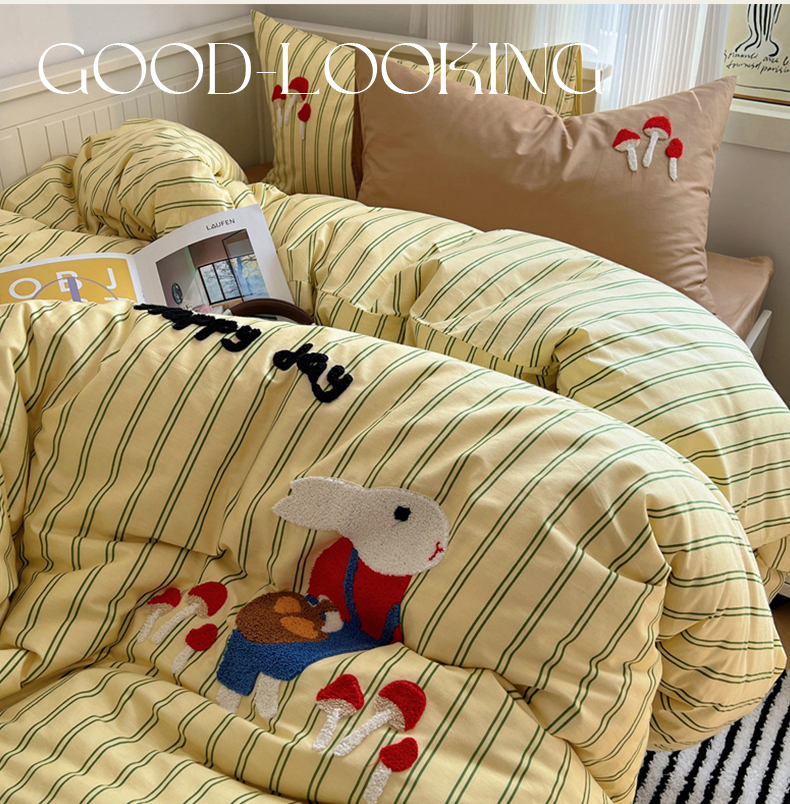 呗旺鹿 2024新款小清新全棉四件套毛巾绣四件套纯棉四件套 蘑菇小兔