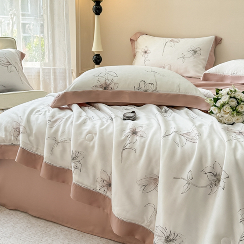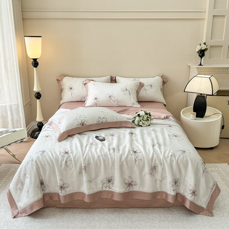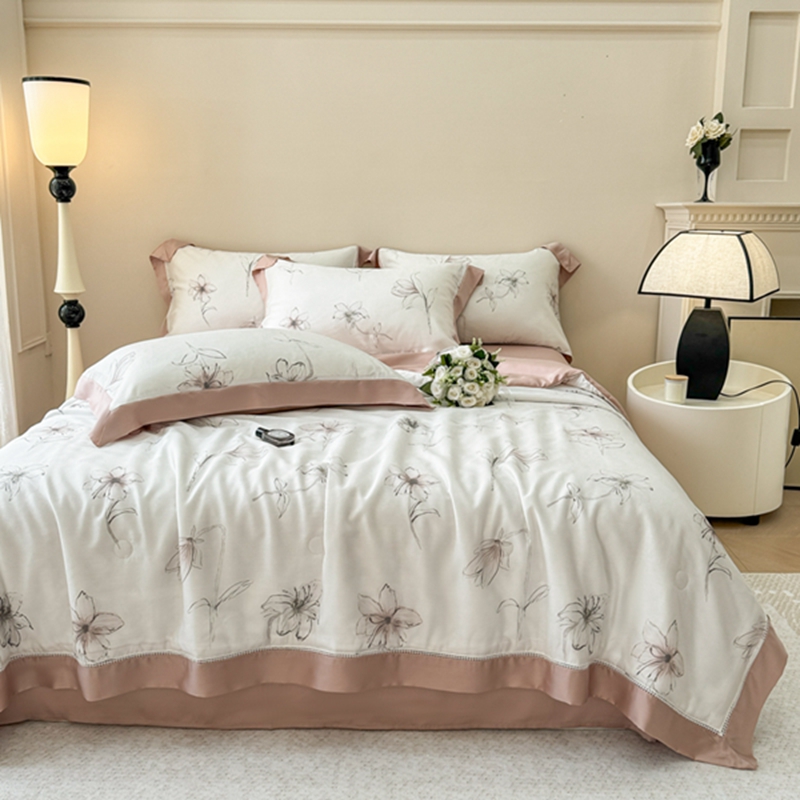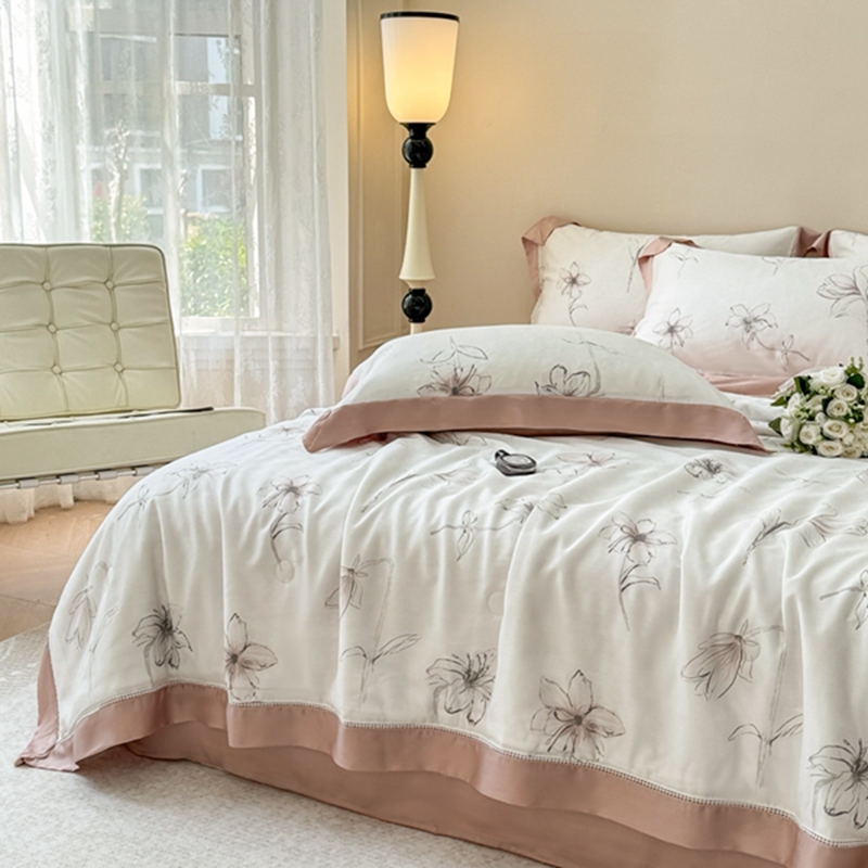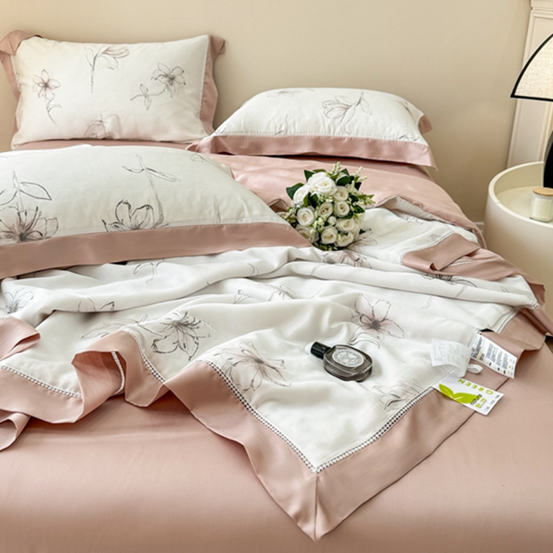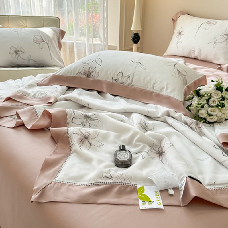 若未2025新款法式莱赛尔天丝印花镂空夏被和夏被四件套 枝叶诗韵