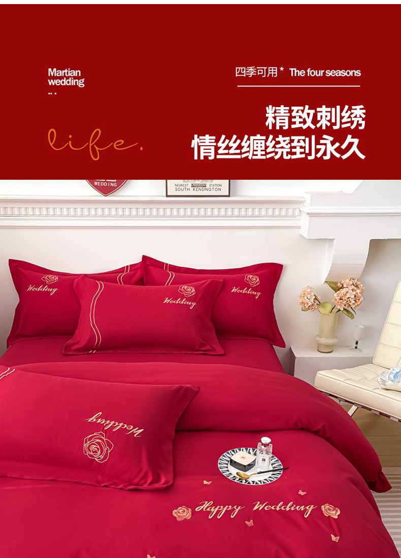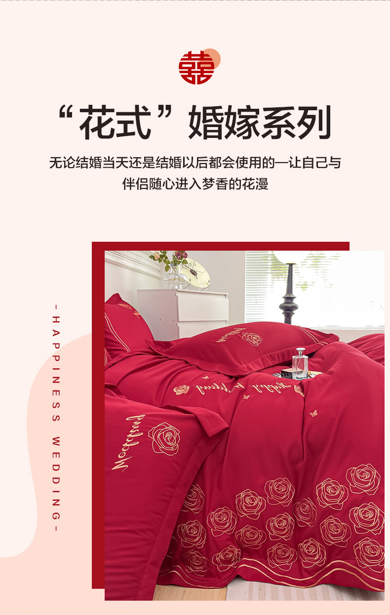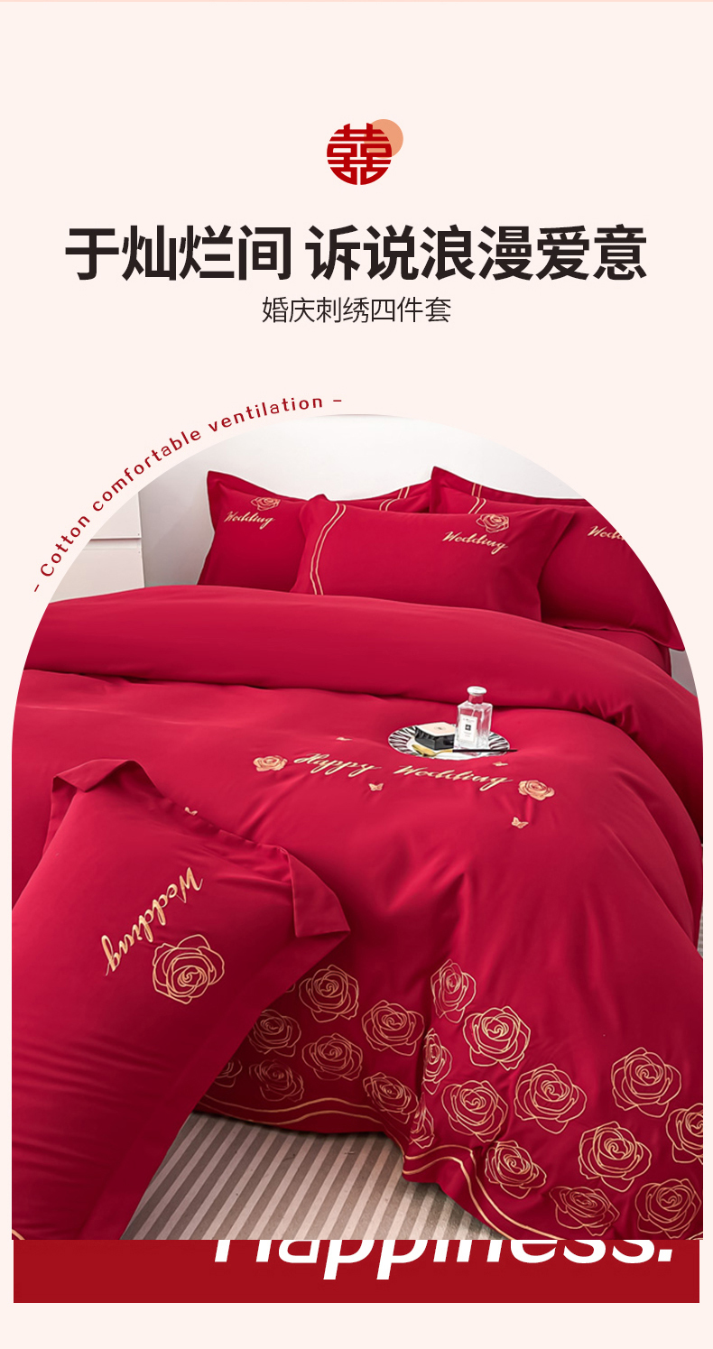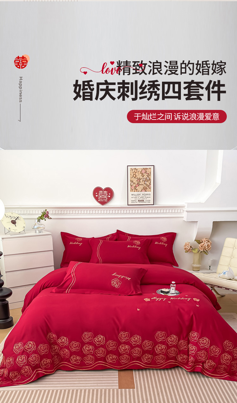 栩裕纺织 2025新款亲肤刺绣绣花婚庆四件套 十里红妆