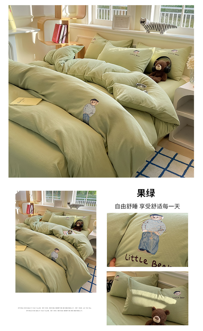 当前位置: 91家纺网 > 商品网购 > 床品套件 > 四件套 > 水洗棉四件套 > 眠帛家居 2024新款水洗棉提花刺绣四件套熊先生-风格二 熊先生-果绿