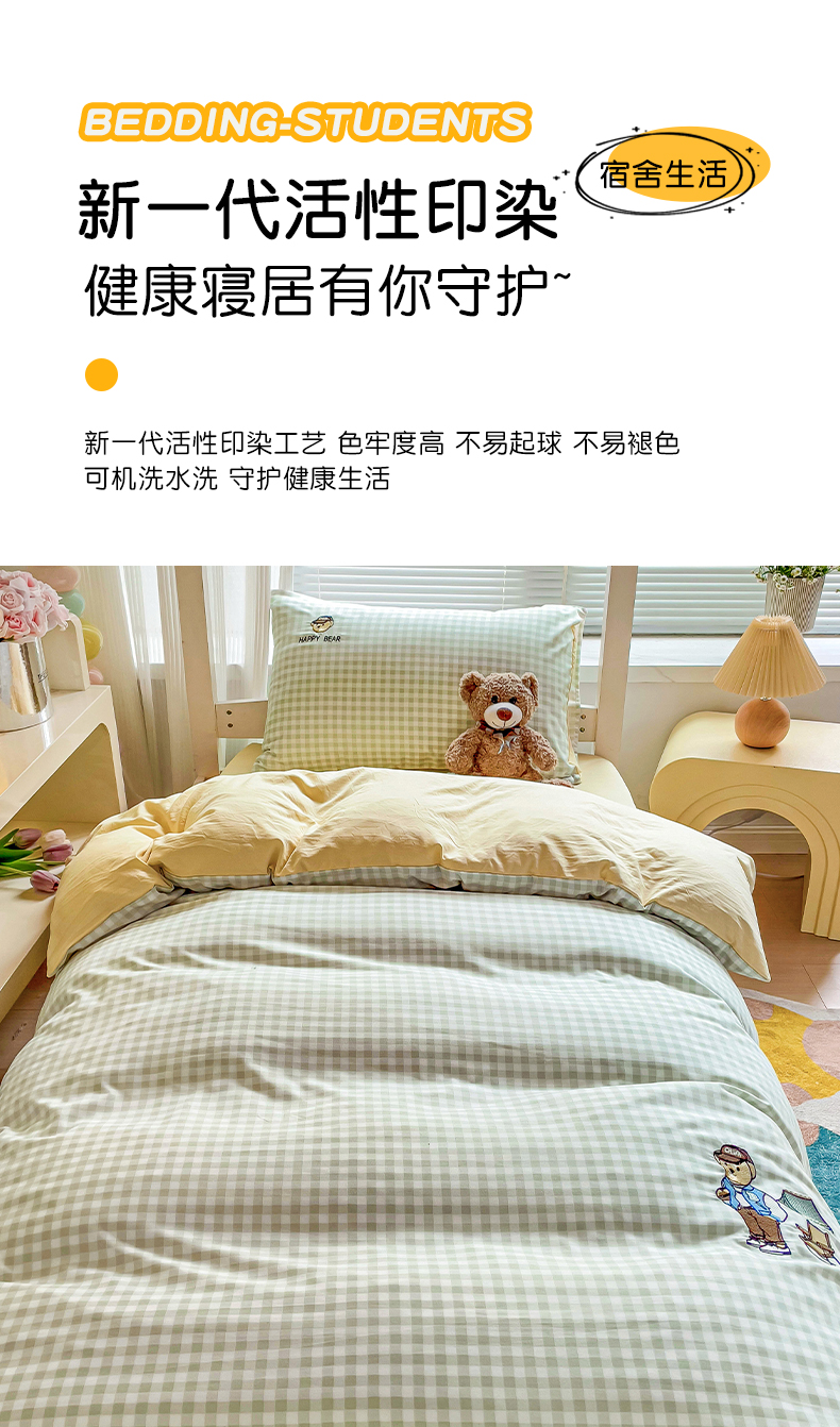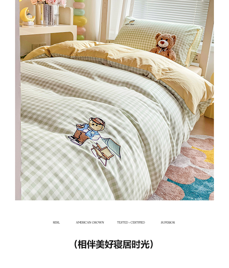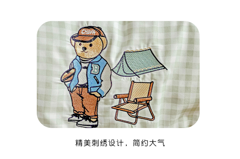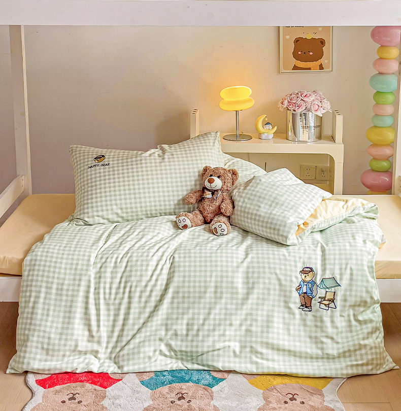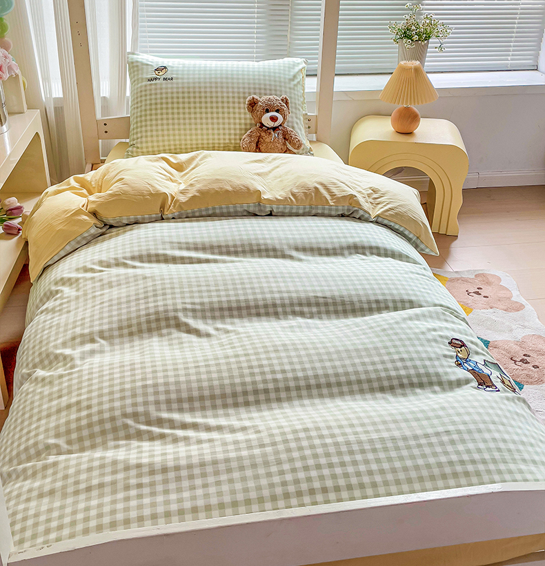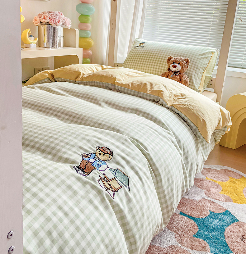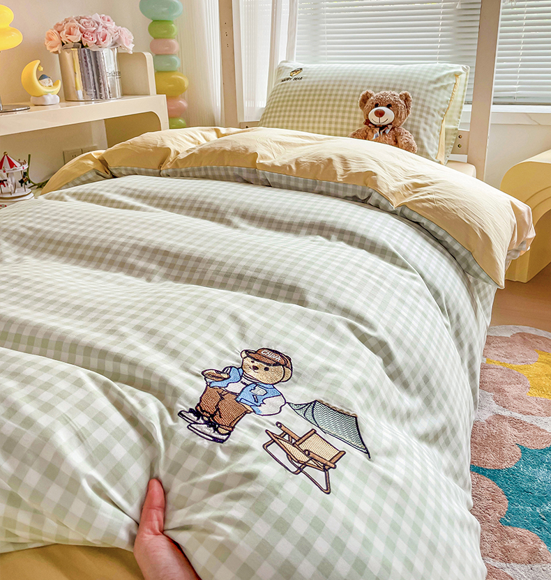 商品名称:2024新款磨毛水洗棉学生宿舍精美刺绣时尚格子四件套--小熊老师系列 小熊老师-浅绿