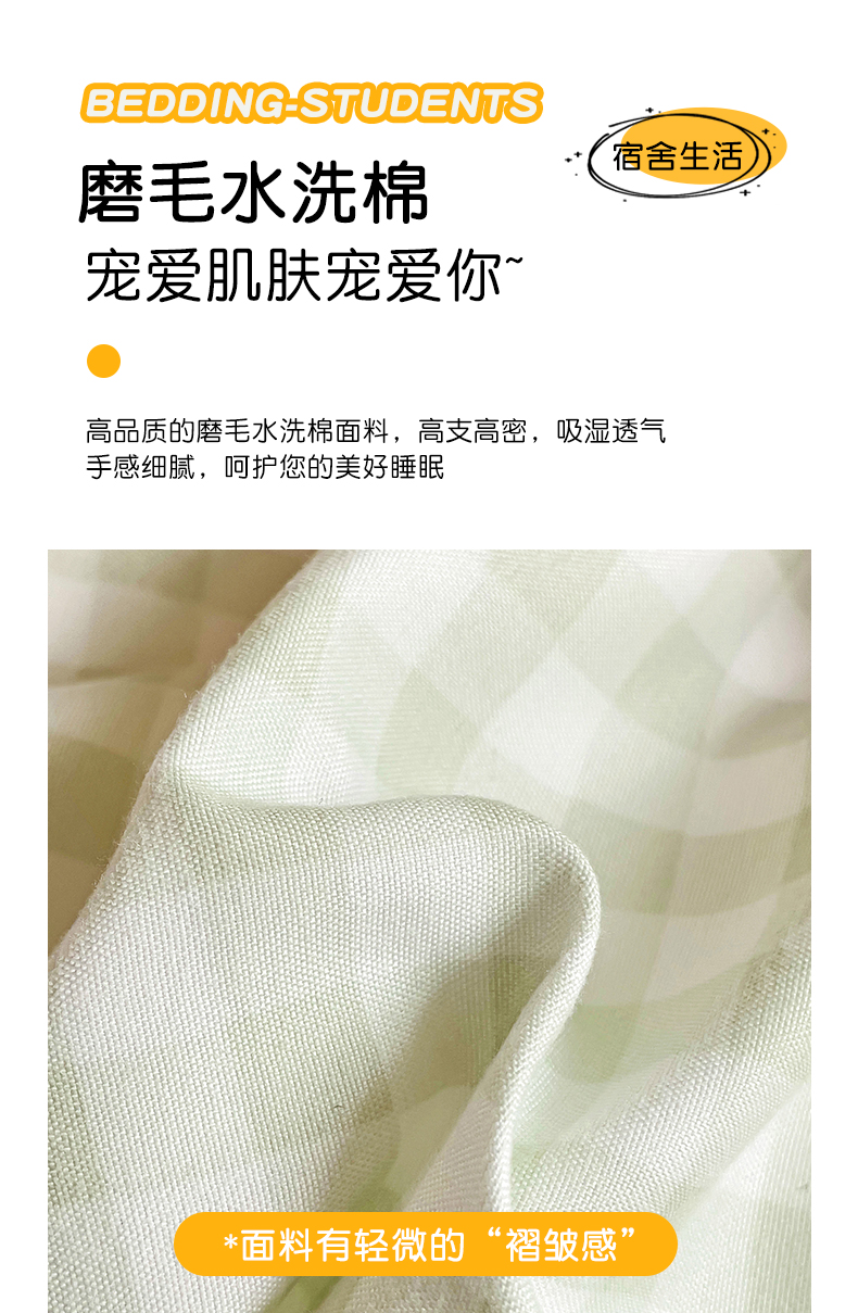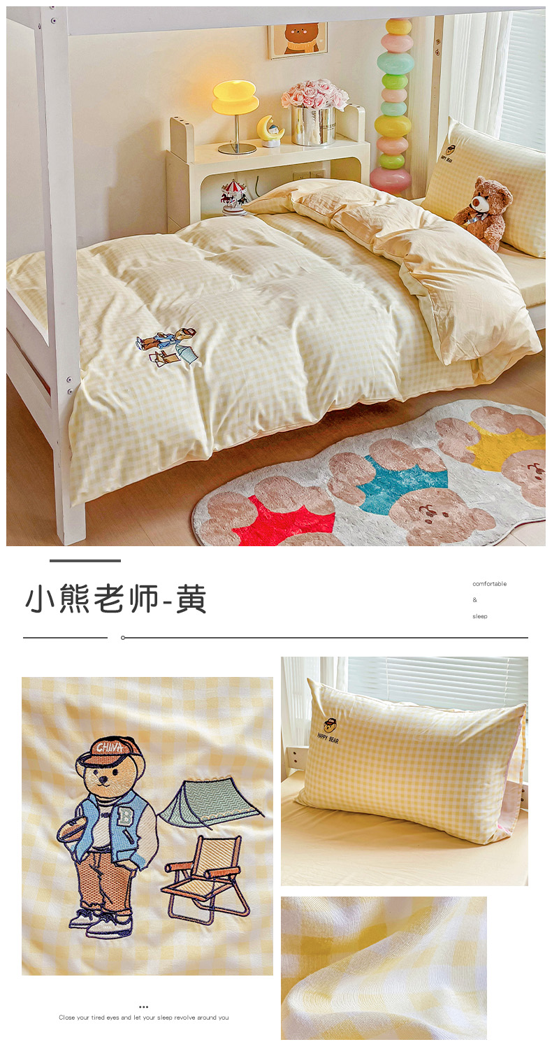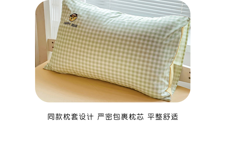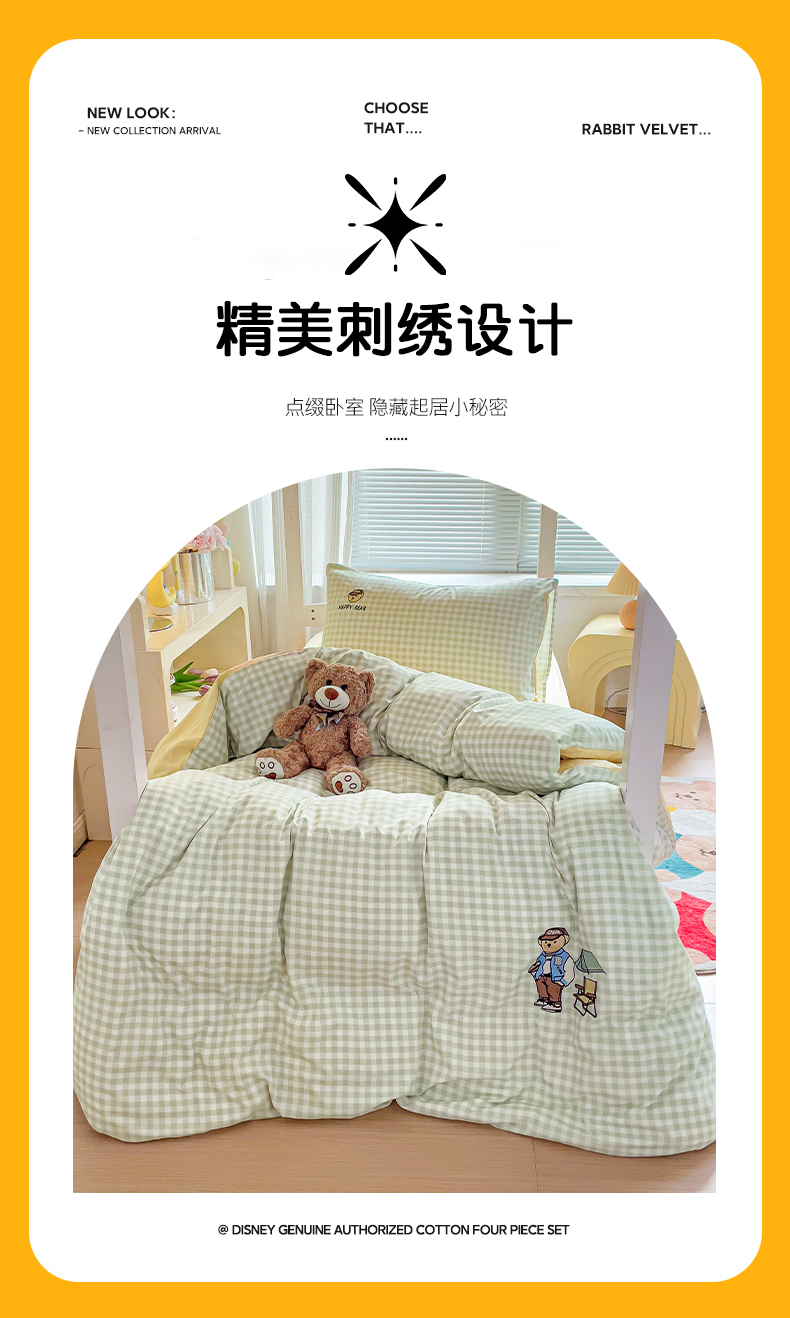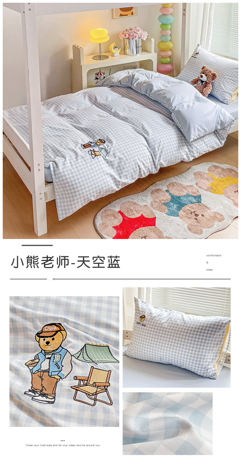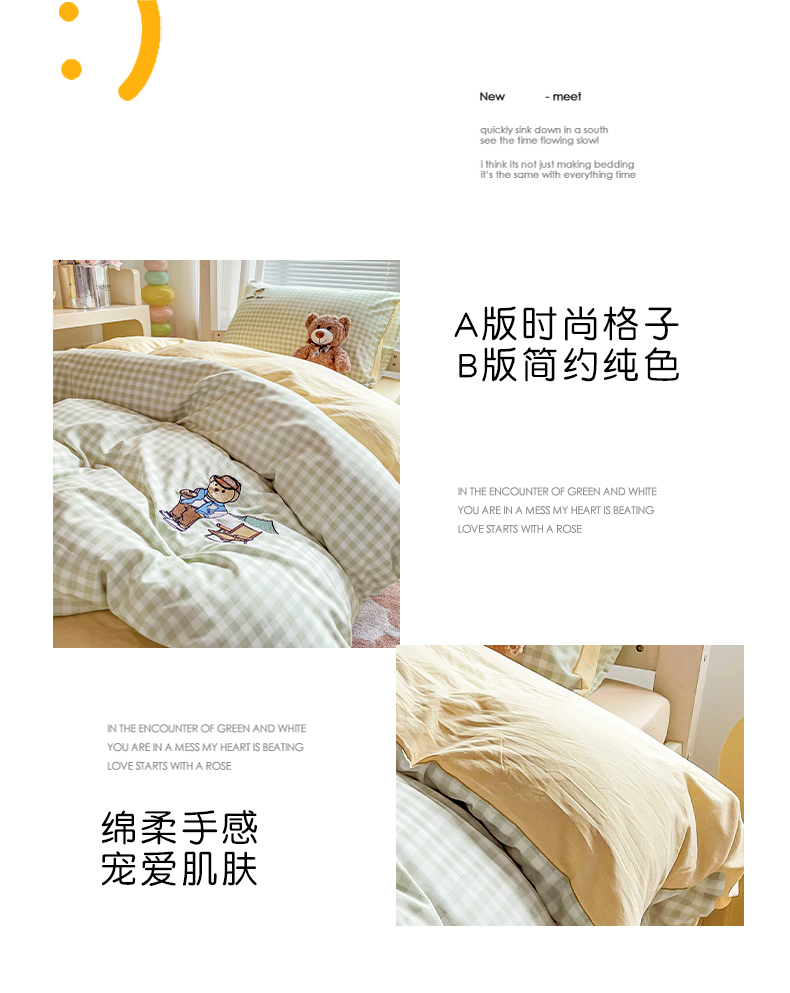 商品名称:2024新款磨毛水洗棉学生宿舍精美刺绣时尚格子四件套--小熊老师系列 小熊老师-浅绿