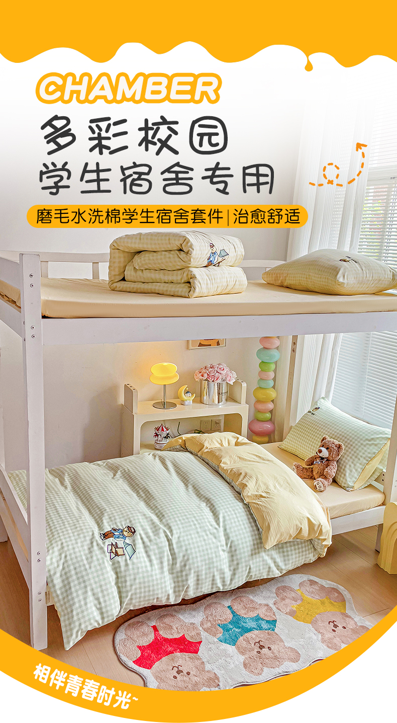 2024新款磨毛水洗棉学生宿舍精美刺绣时尚格子四件套--小熊老师系列 小熊老师-浅绿