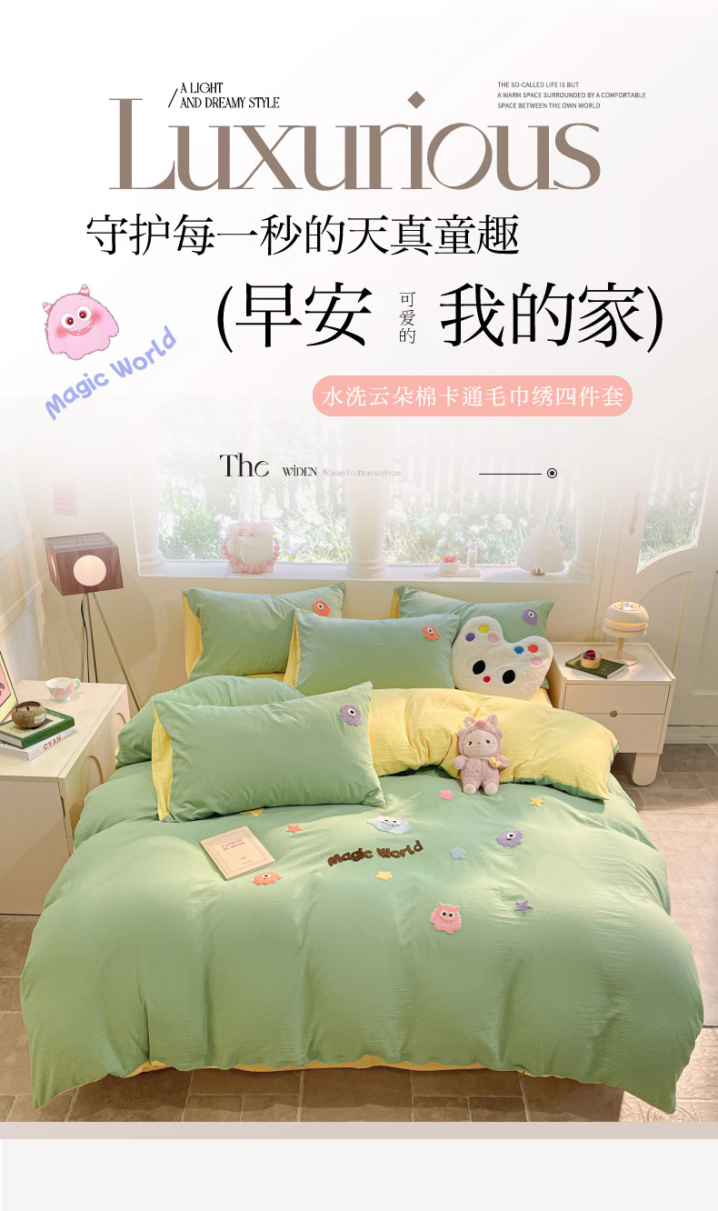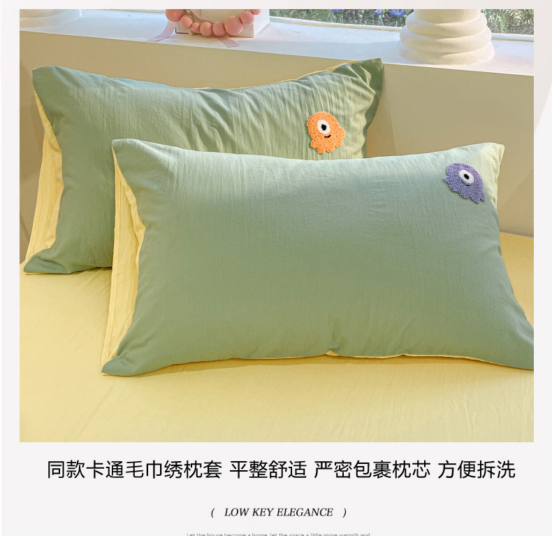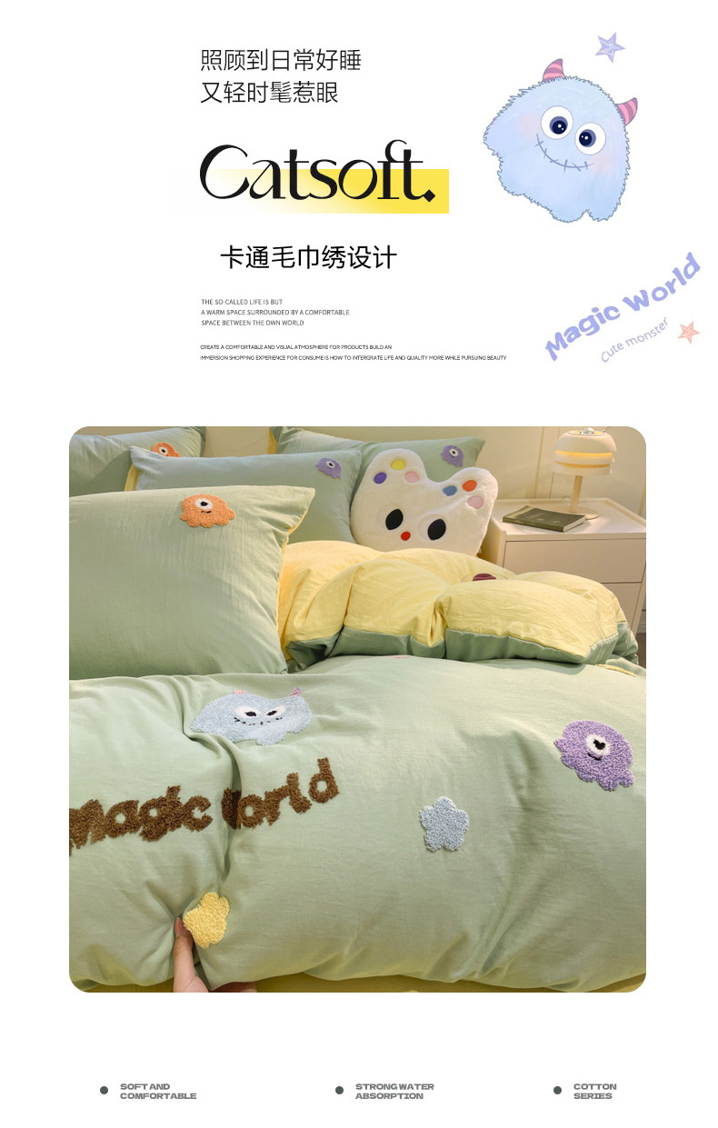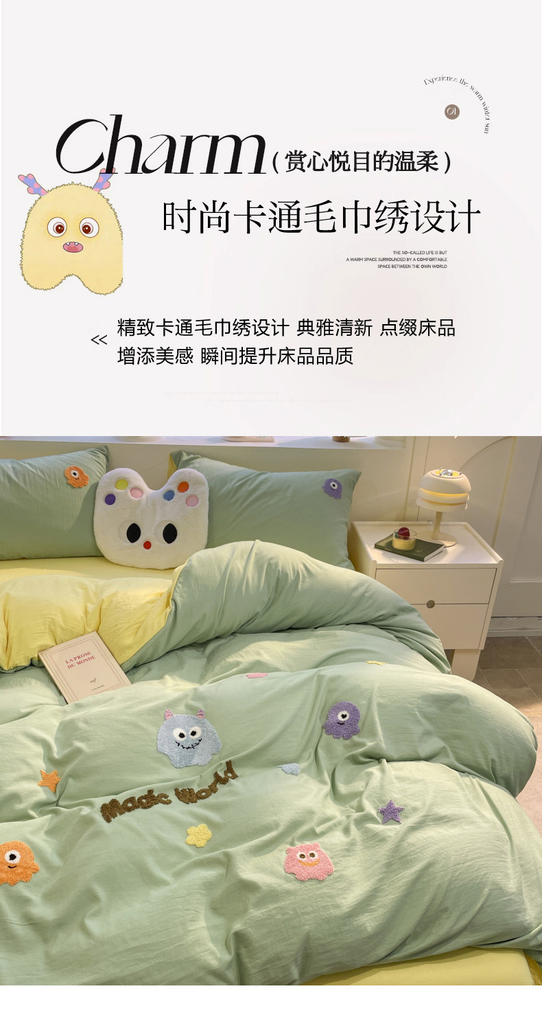 当前位置: 91家纺网 > 商品网购 > 床品套件 > 四件套 > 毛巾绣四件套 > 葡萄家 2024新款毛巾绣水洗云朵棉萌系小怪兽四件套 小怪兽-黄绿