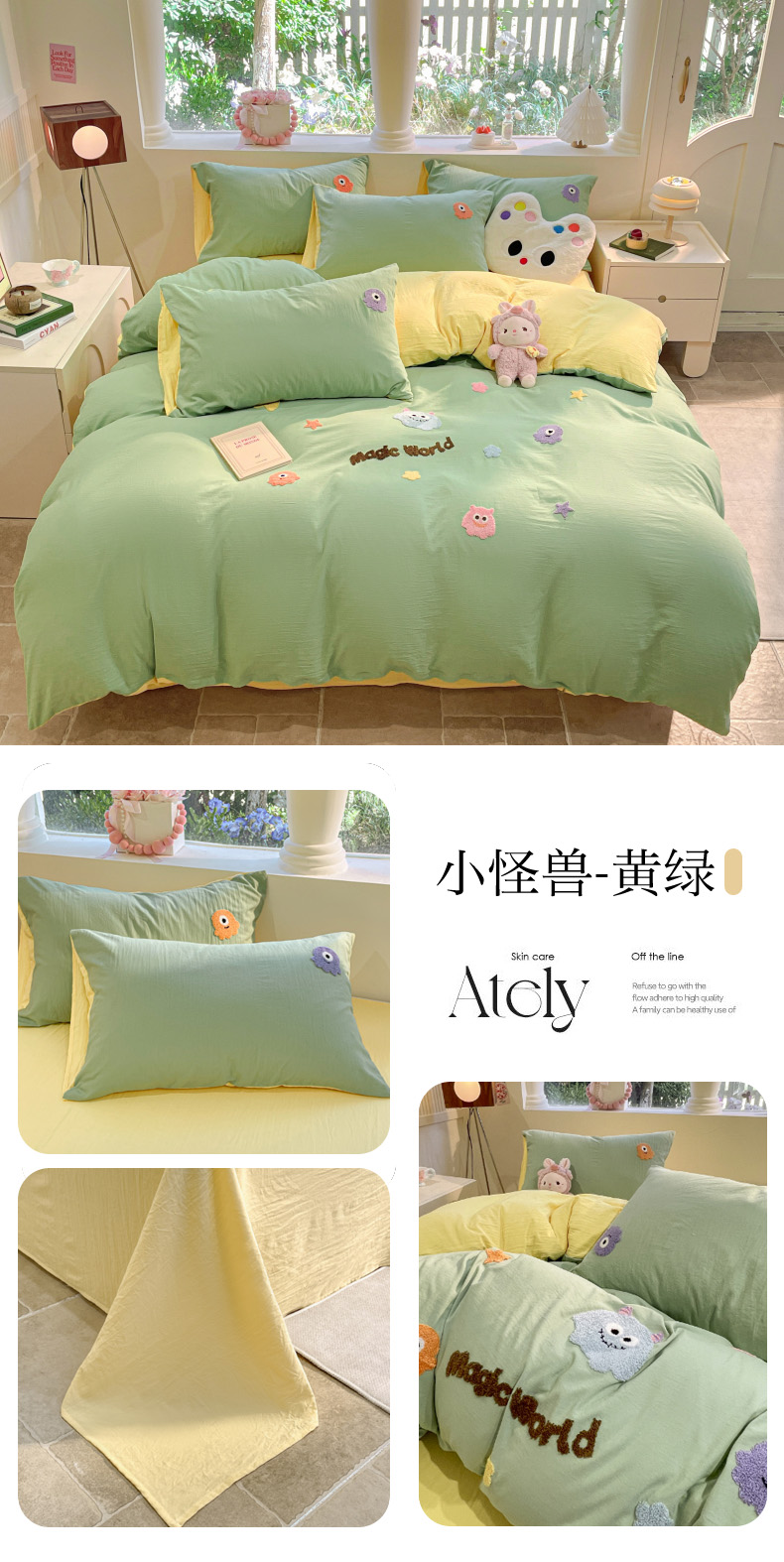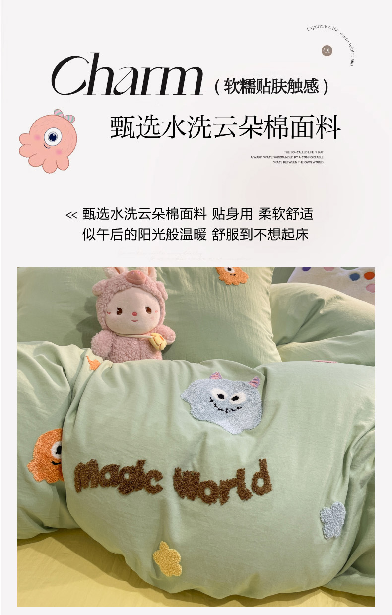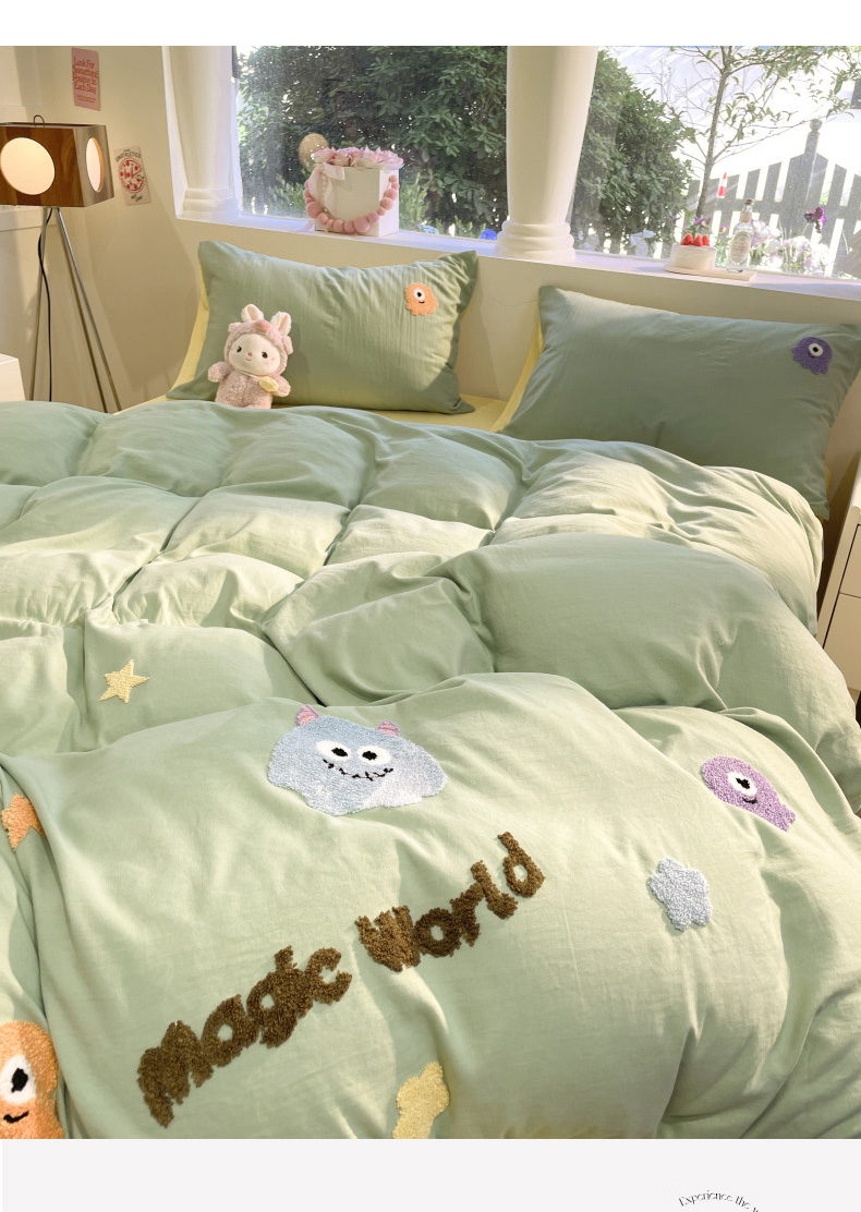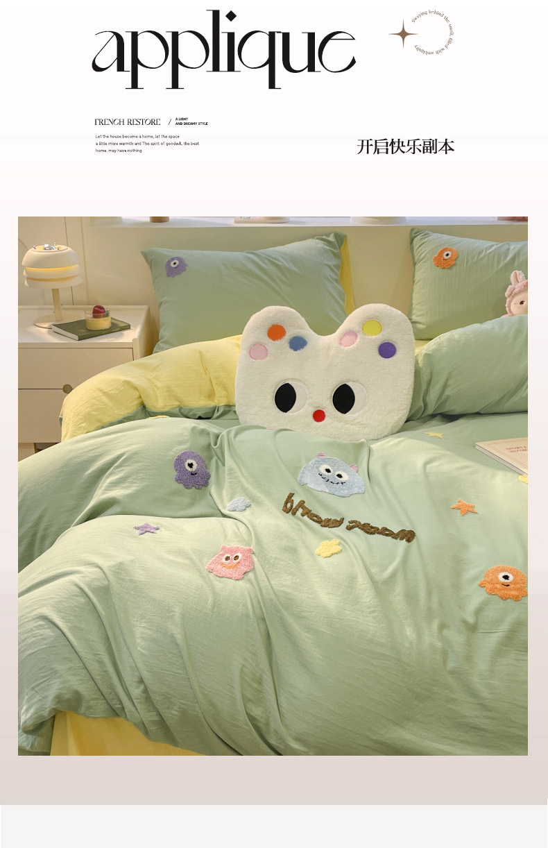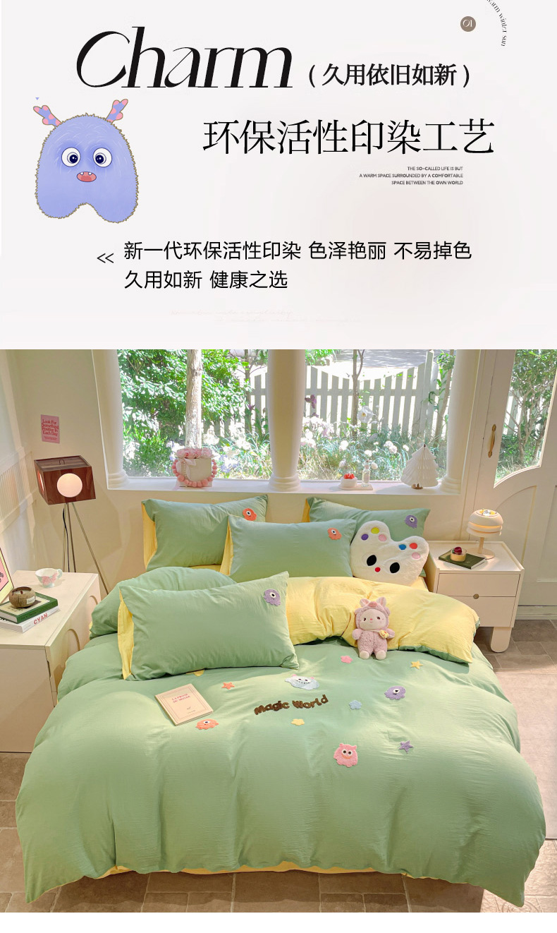 当前位置: 91家纺网 > 商品网购 > 床品套件 > 四件套 > 毛巾绣四件套 > 葡萄家 2024新款毛巾绣水洗云朵棉萌系小怪兽四件套 小怪兽-黄绿