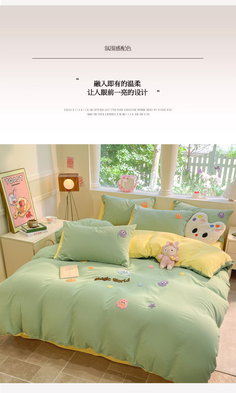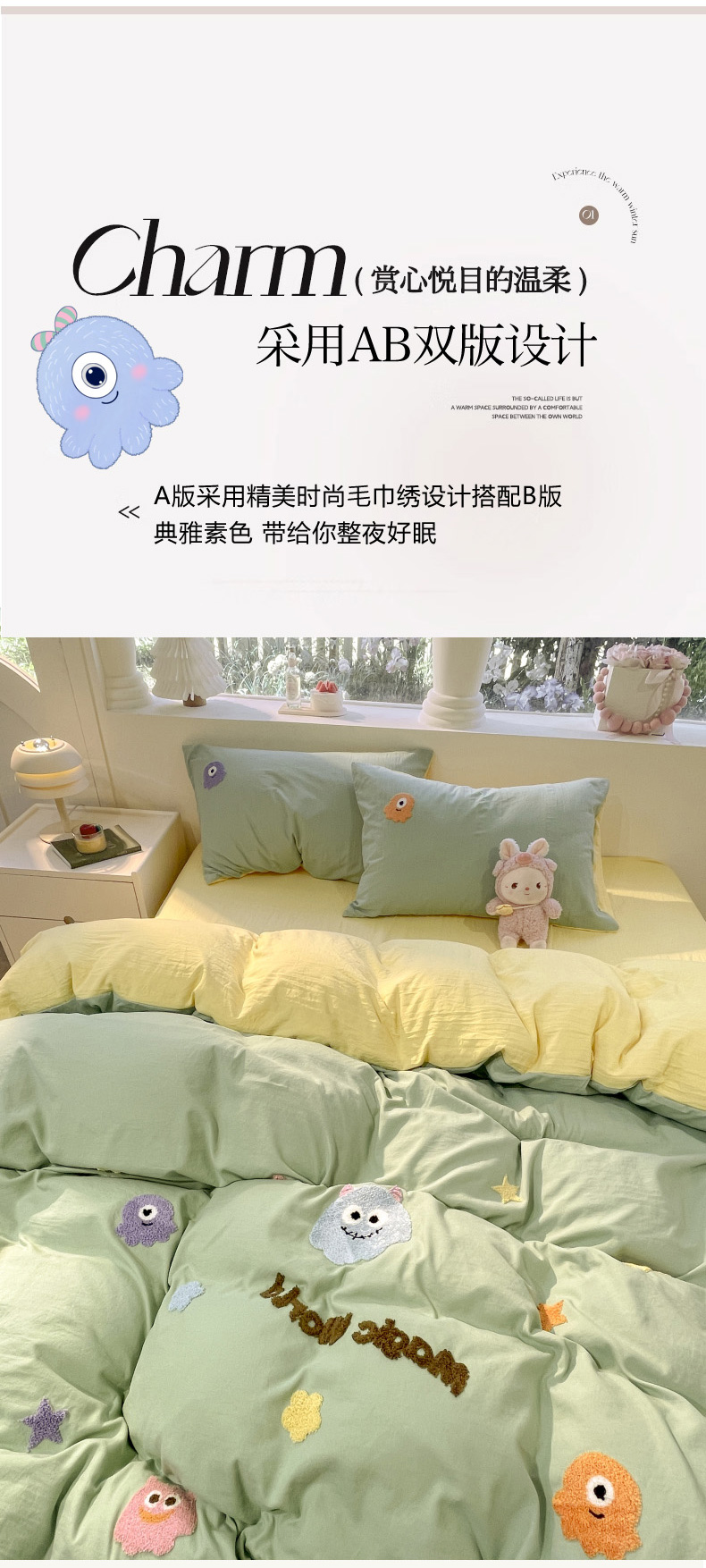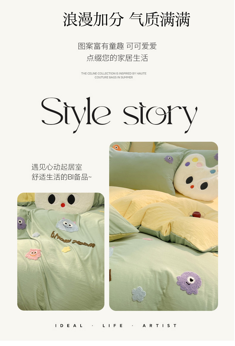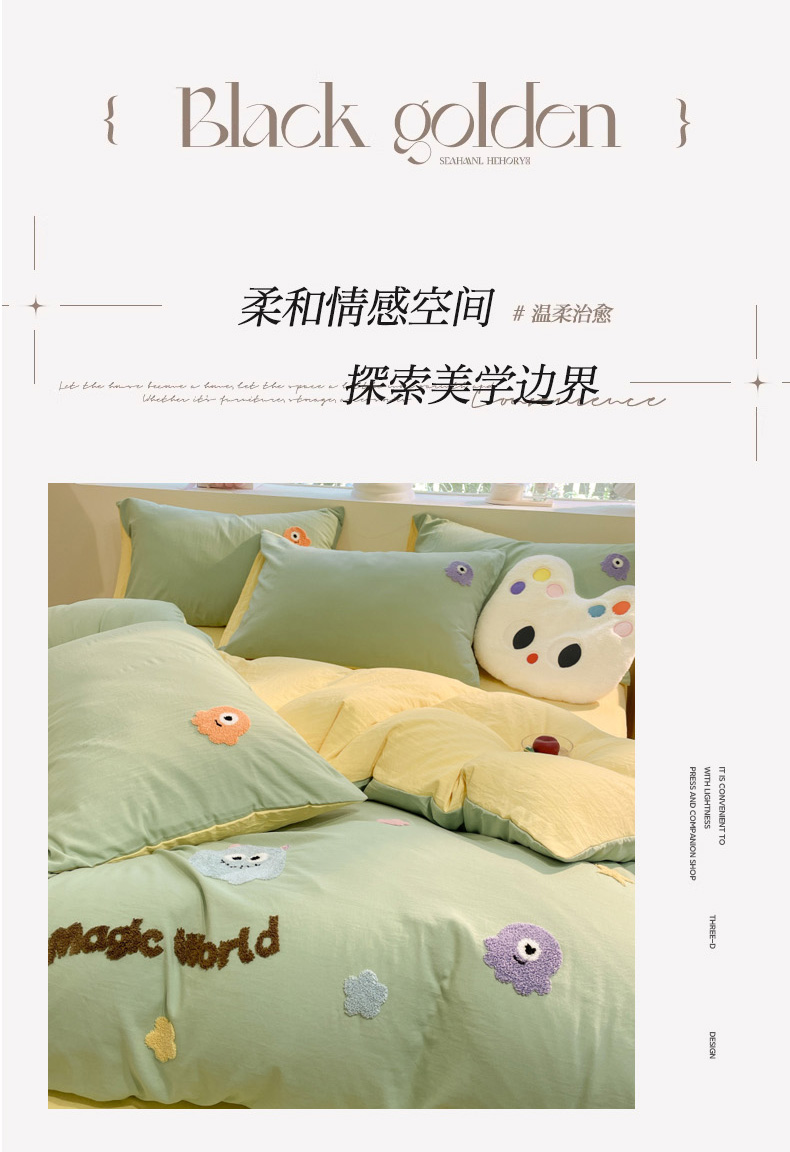 当前位置: 91家纺网 > 商品网购 > 床品套件 > 四件套 > 毛巾绣四件套 > 葡萄家 2024新款毛巾绣水洗云朵棉萌系小怪兽四件套 小怪兽-黄绿