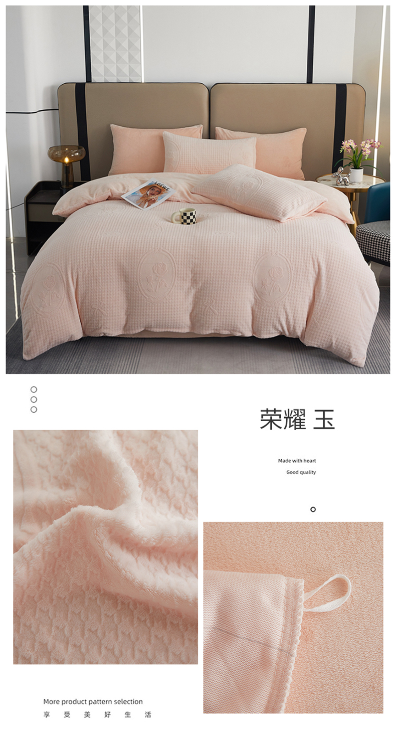 商品名称:青螺家纺 2024新款纯色雕花牛奶绒四件套婴儿级烂花立体牛奶绒四件套 荣耀-玉