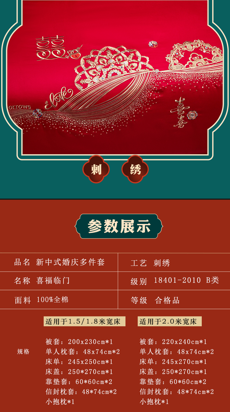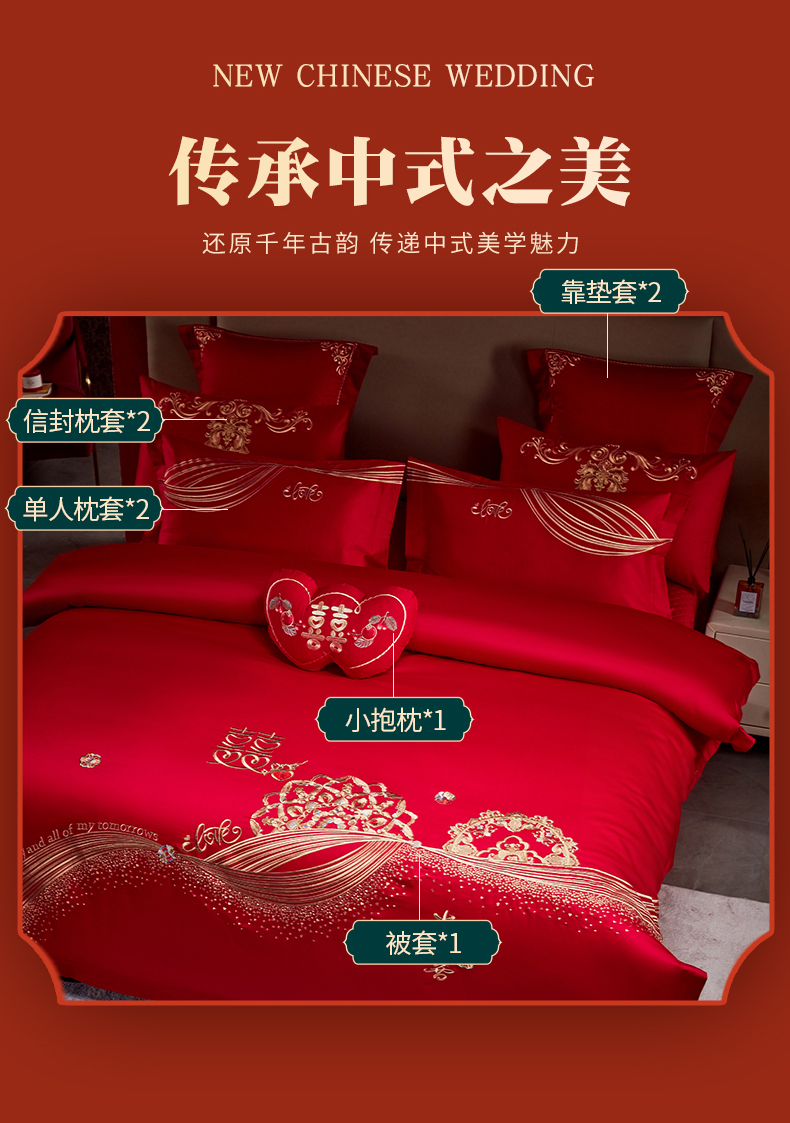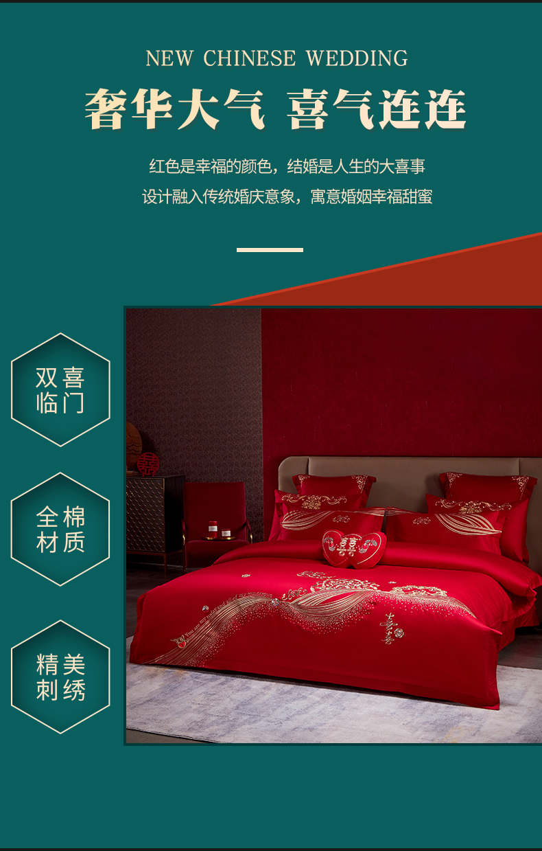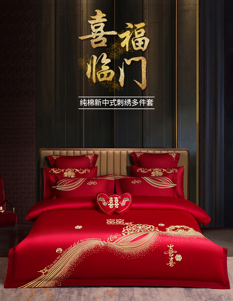 当前位置: 91家纺网 > 商品网购 > 床品套件 > 四件套 > 婚庆四件套 > 宏羽纺家纺 2024新款13372纯棉婚庆套件系列 喜福临门