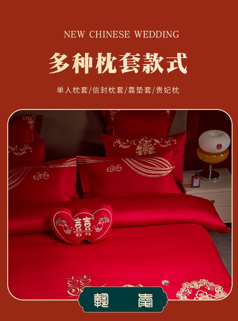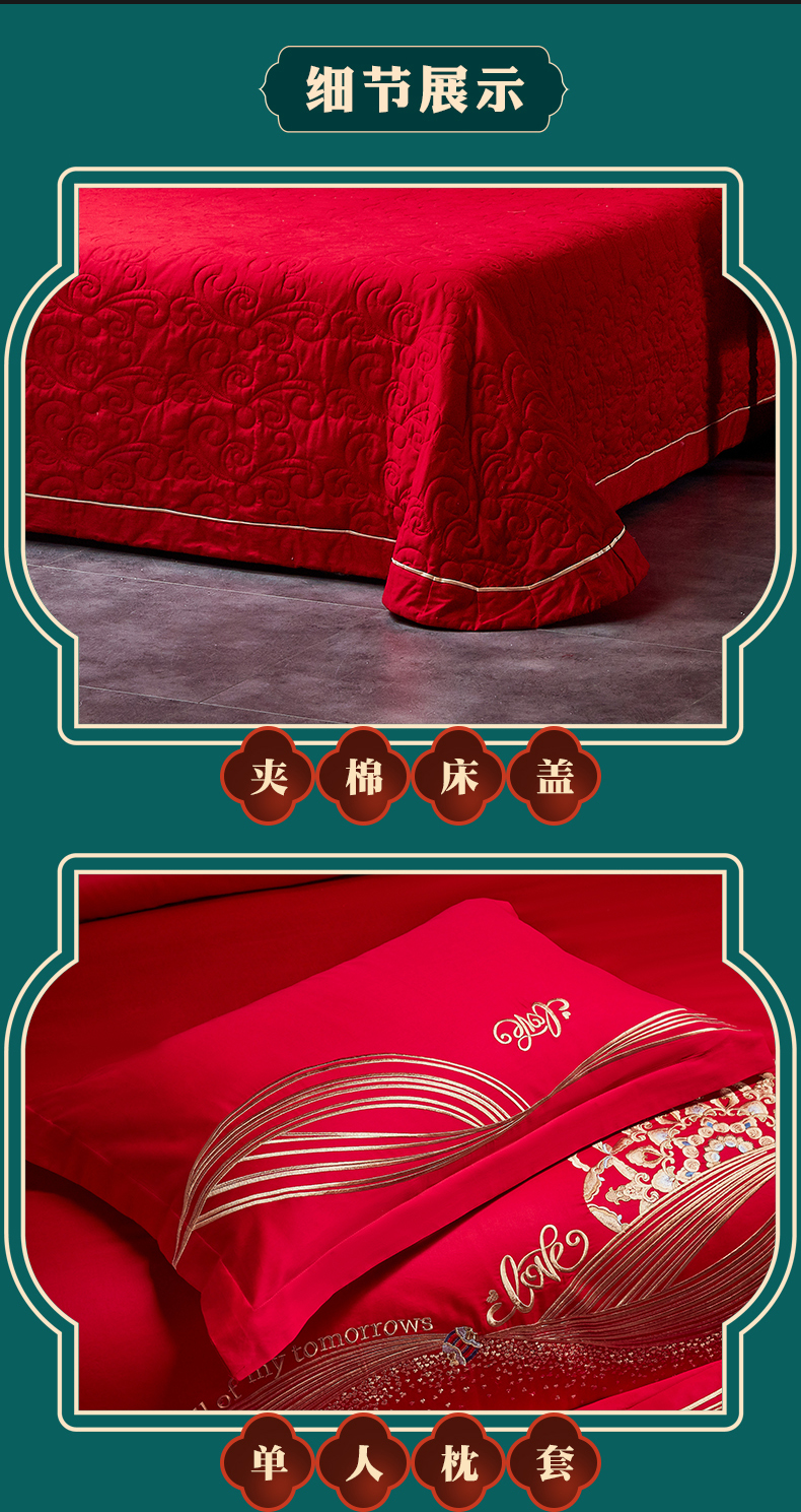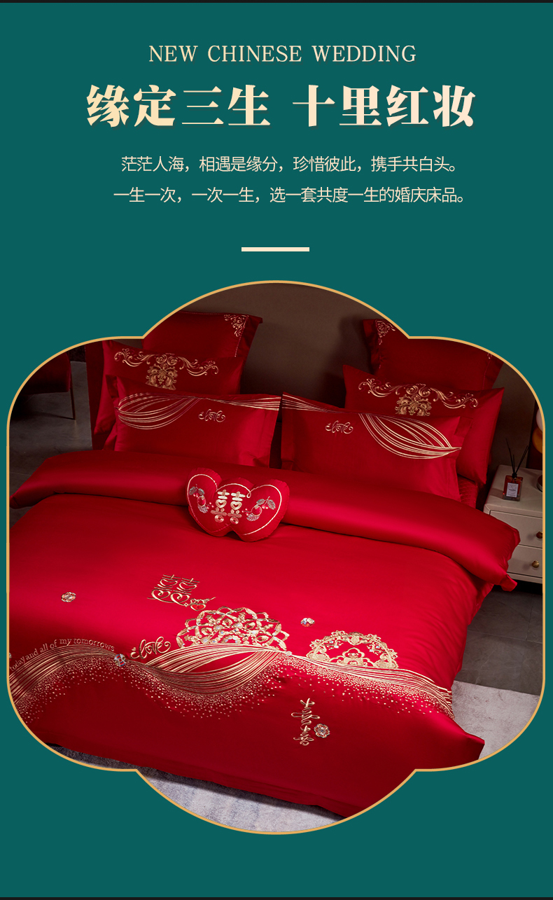 当前位置: 91家纺网 > 商品网购 > 床品套件 > 四件套 > 婚庆四件套 > 宏羽纺家纺 2024新款13372纯棉婚庆套件系列 喜福临门