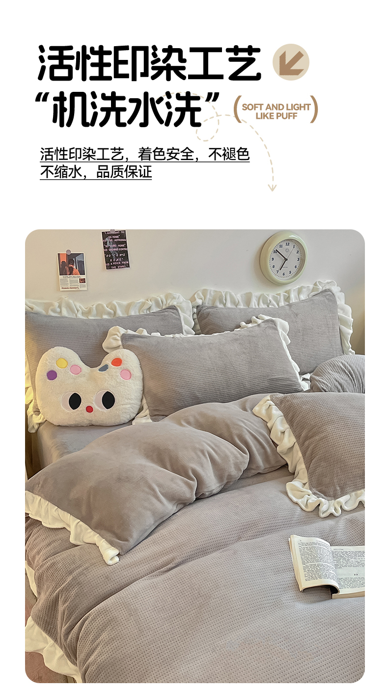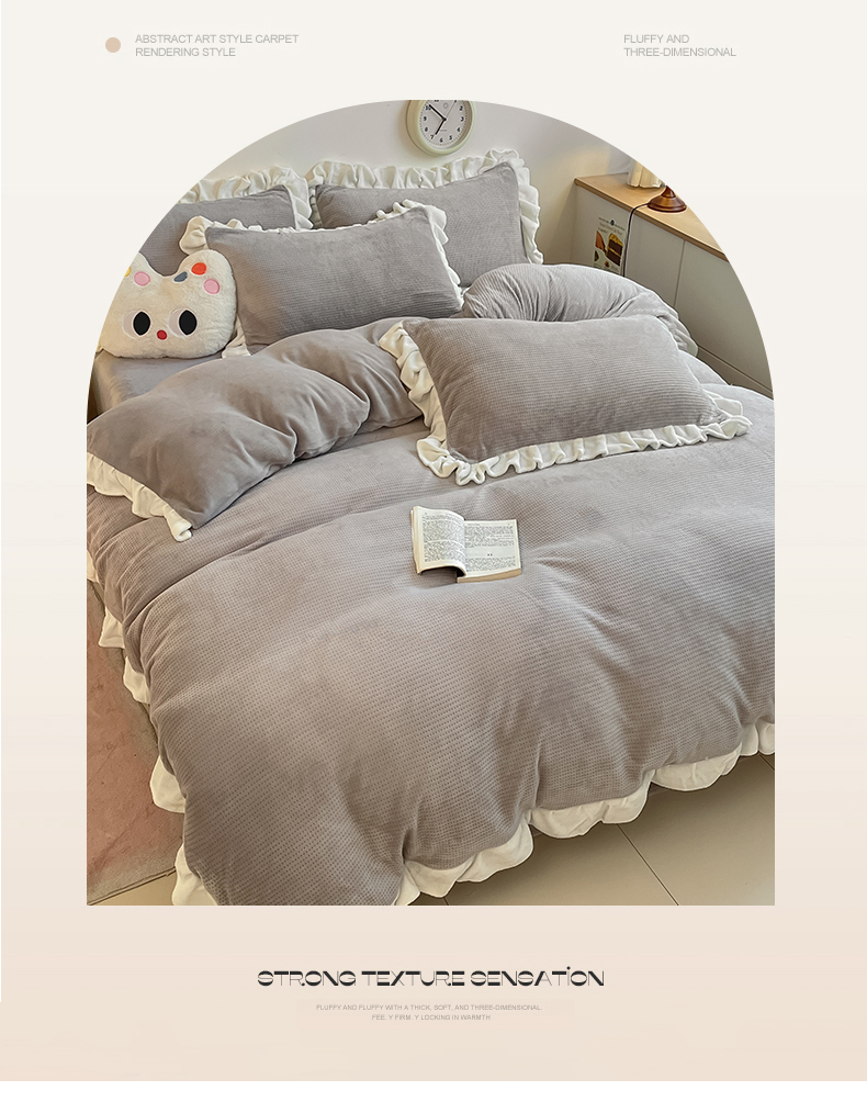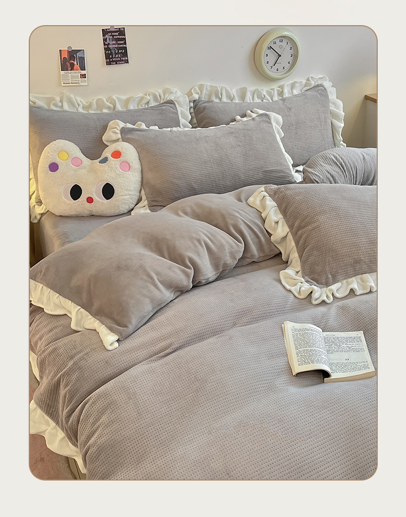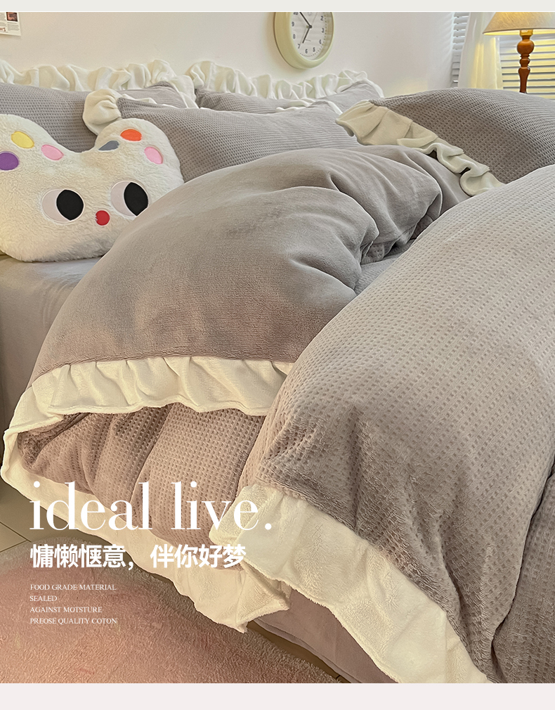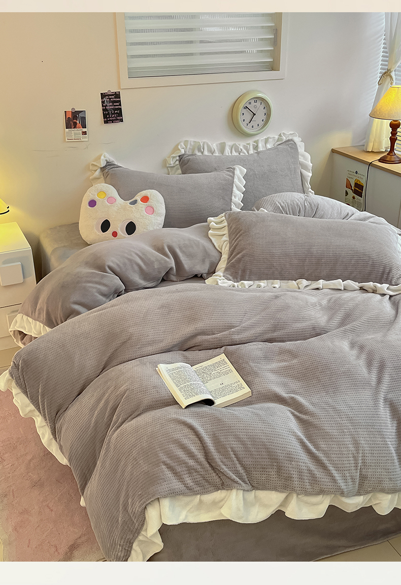 商品名称:星座家纺 2025新款华夫格花边款牛奶绒四件套 华夫格-火山灰