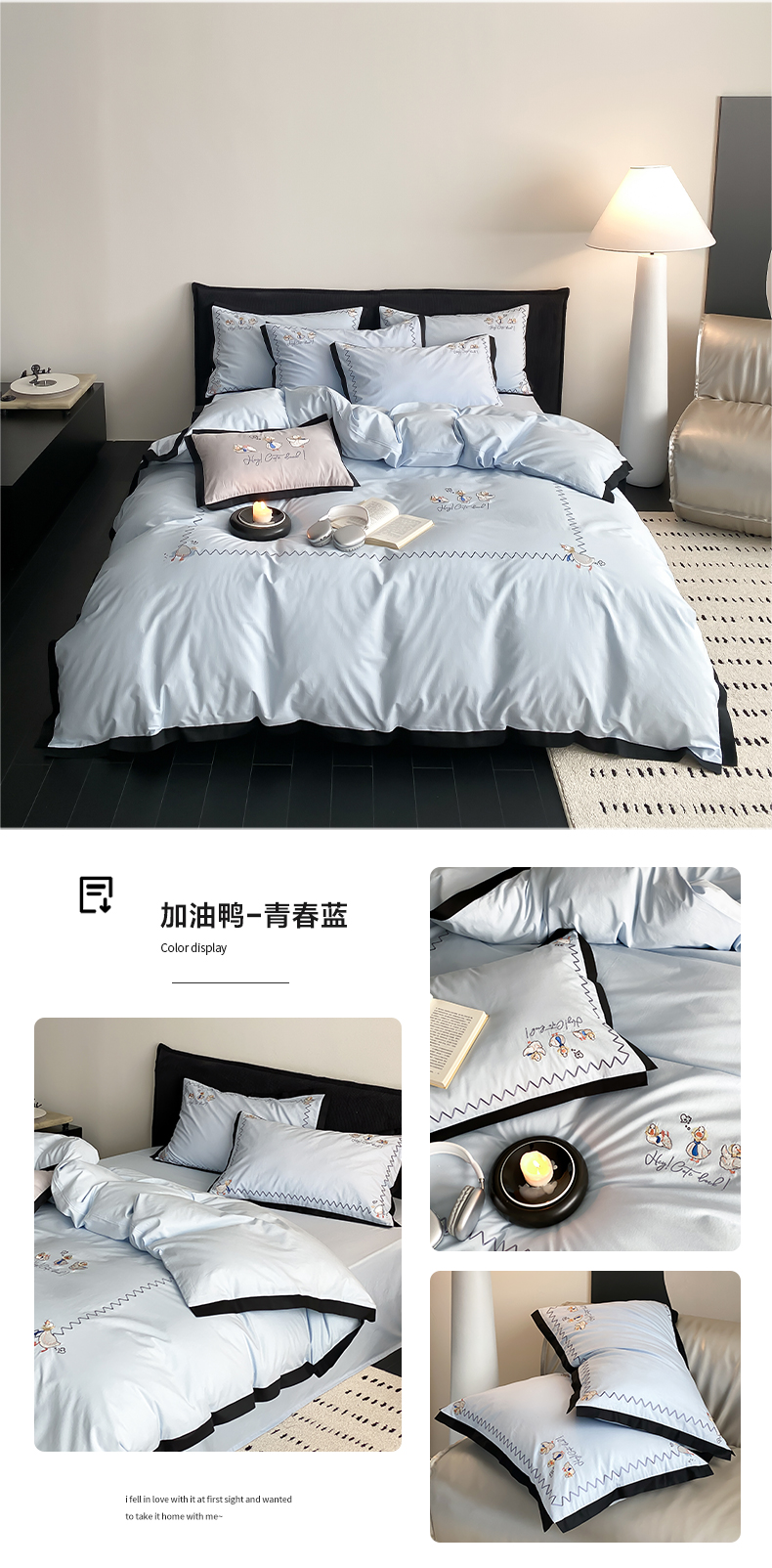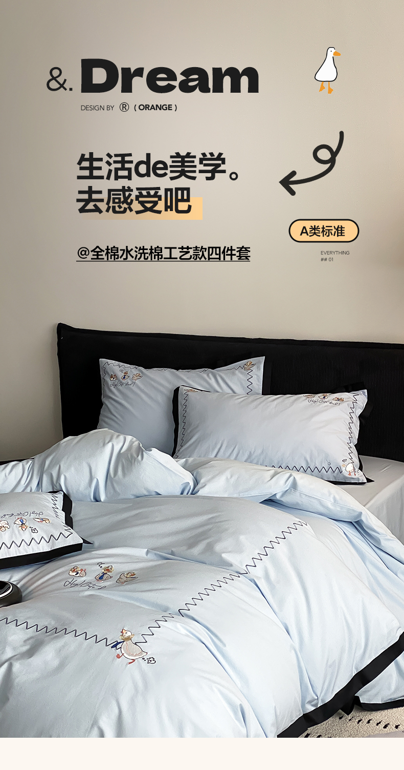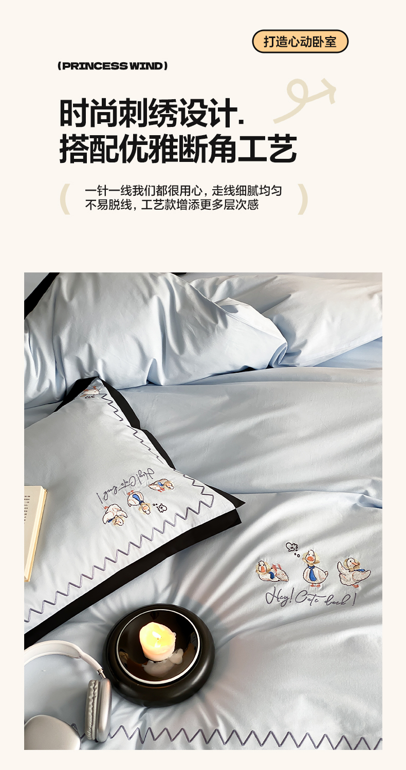 如一 2024新款A类全棉水洗棉工艺刺绣四件套-加油鸭系列 加油鸭-青春蓝