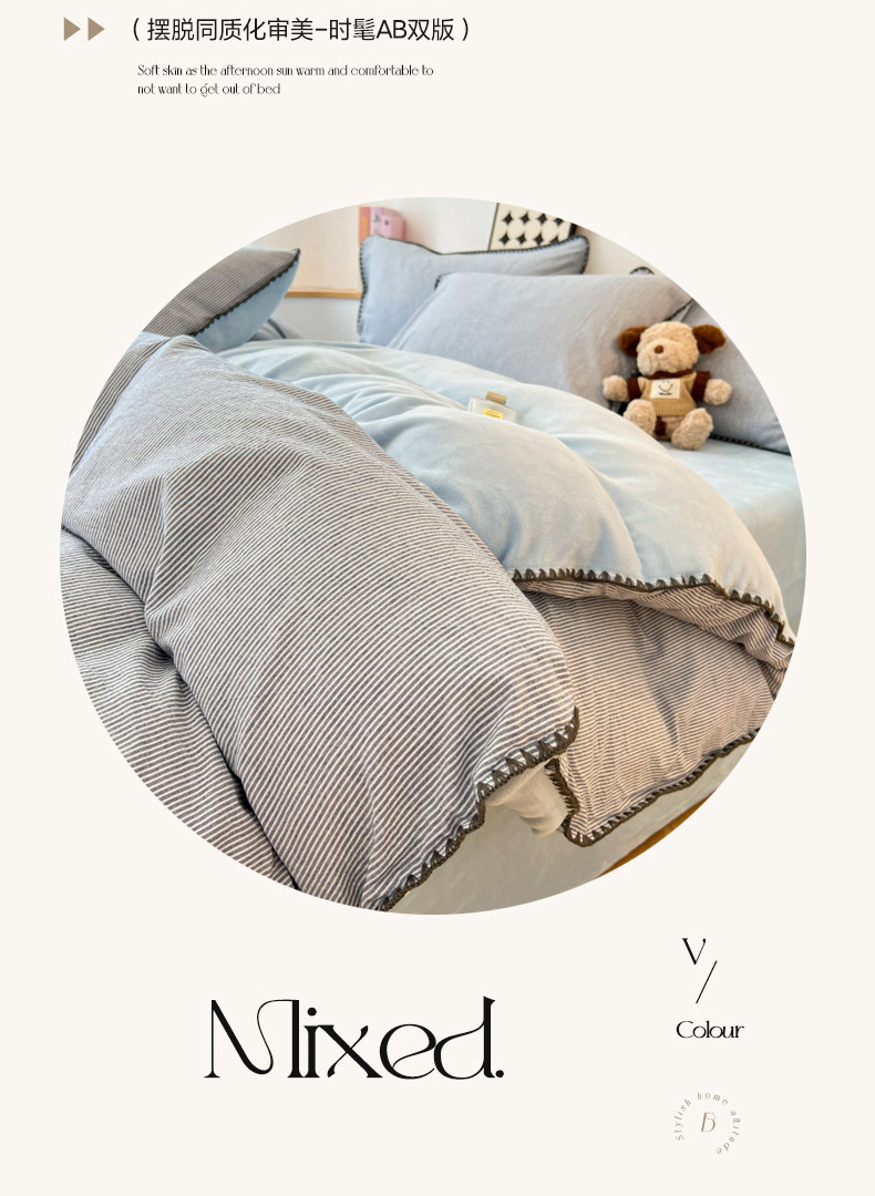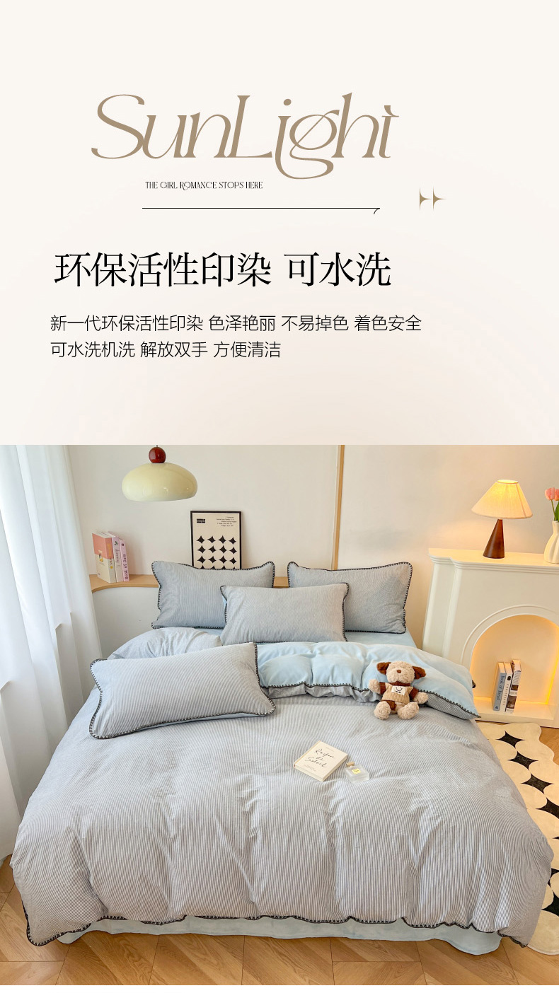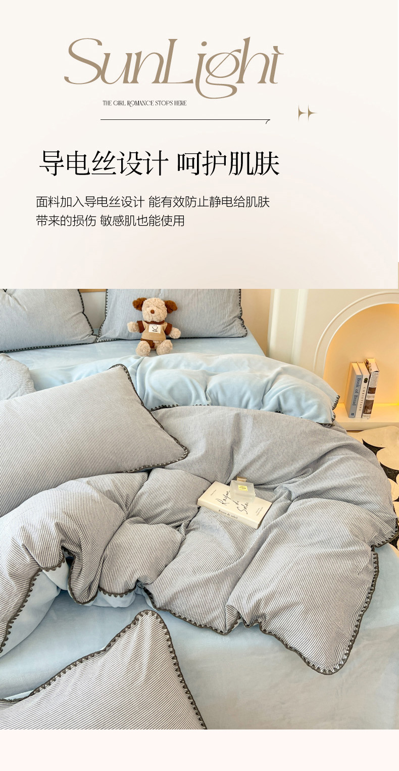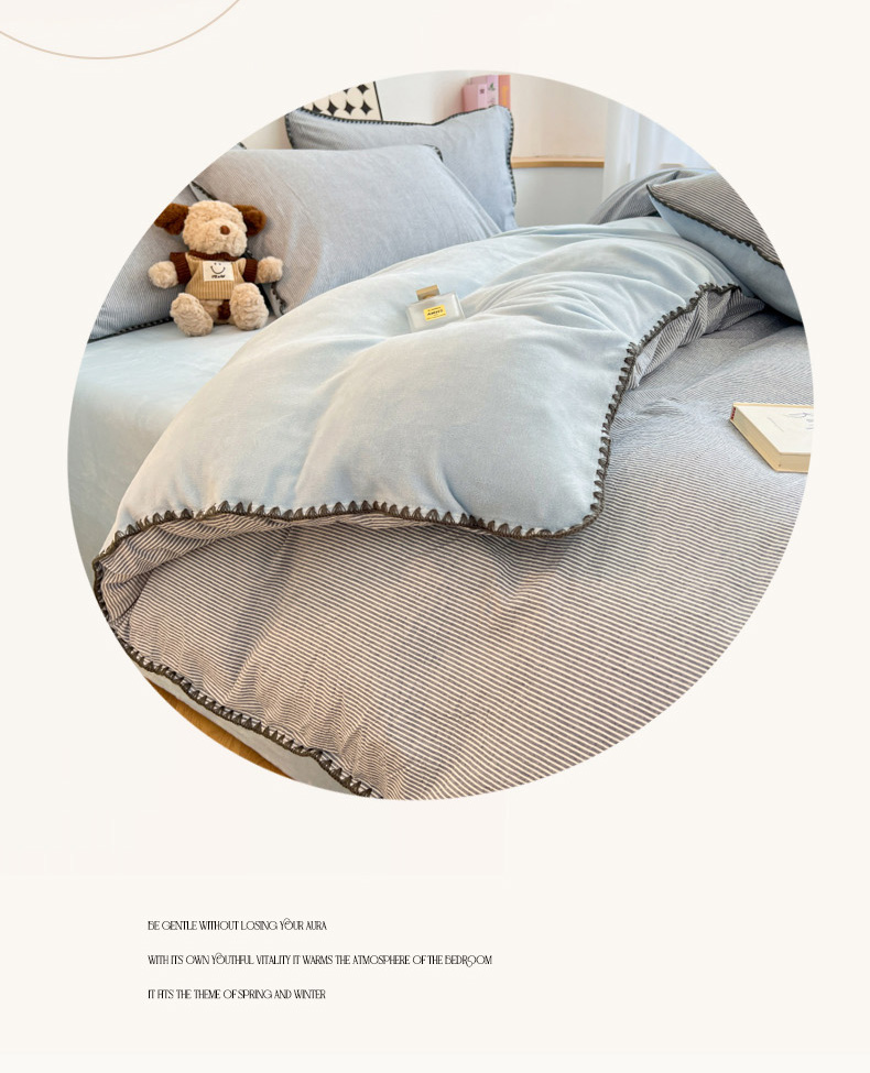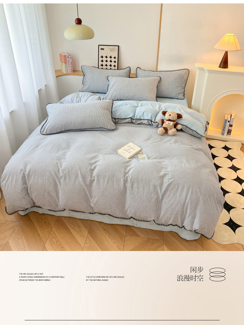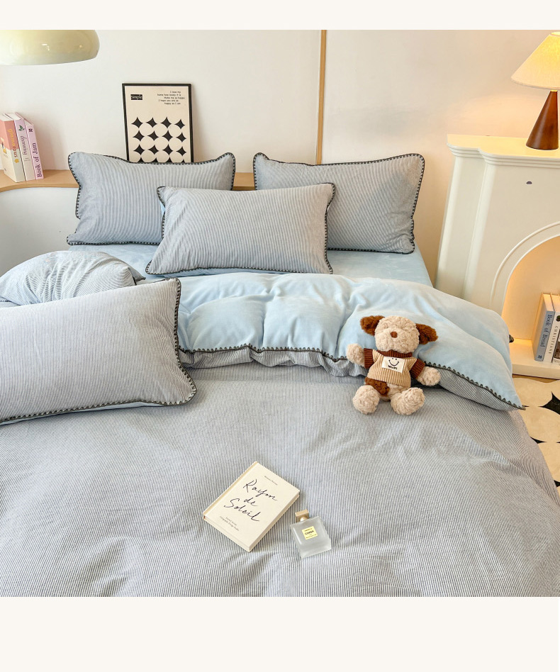 柠馨 2024新款简约时尚全棉牛奶绒棉绒四件套 棉绒蓝细条