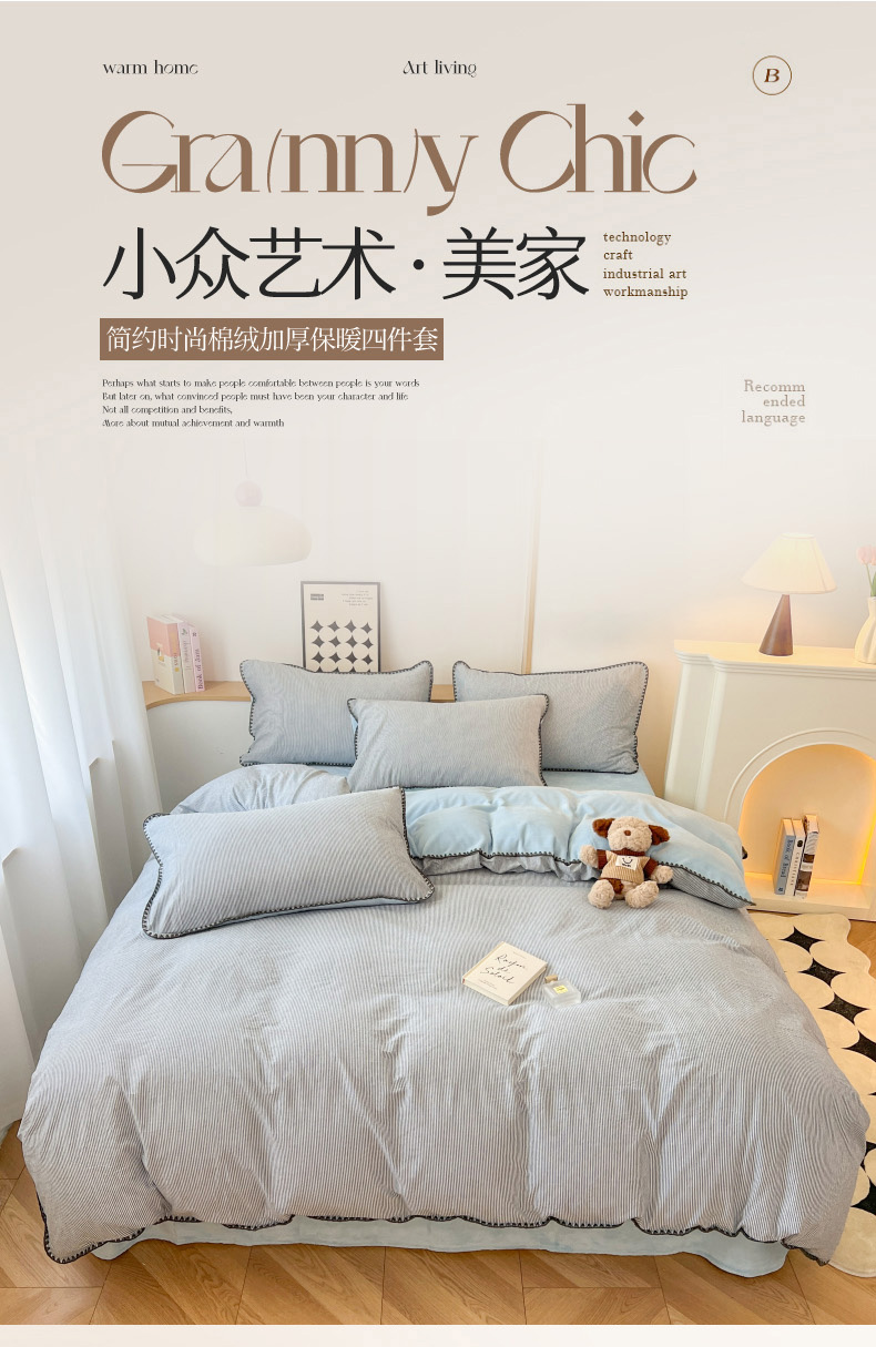 商品名称:柠馨 2024新款简约时尚全棉牛奶绒棉绒四件套 棉绒蓝细条