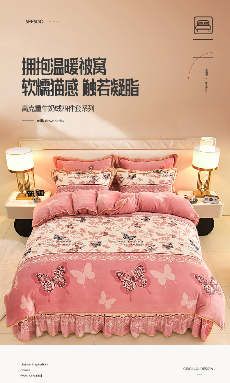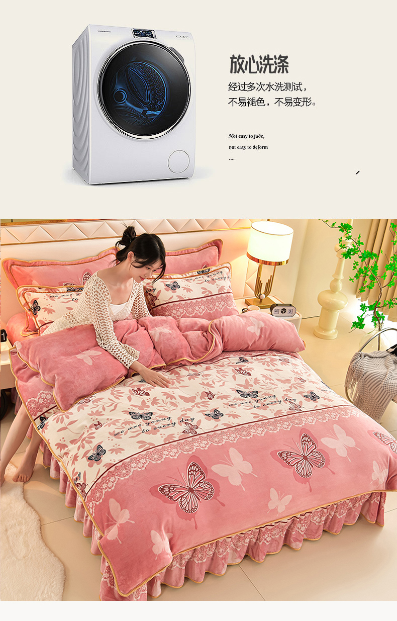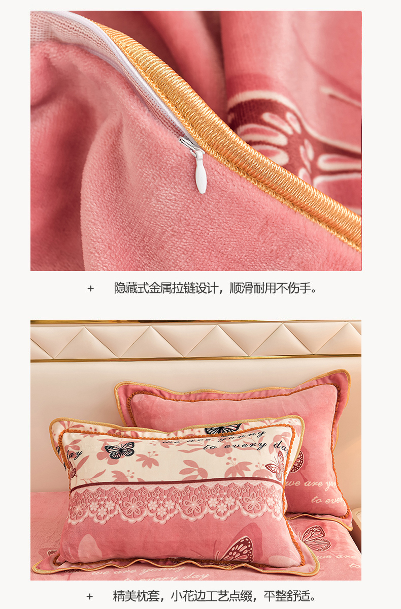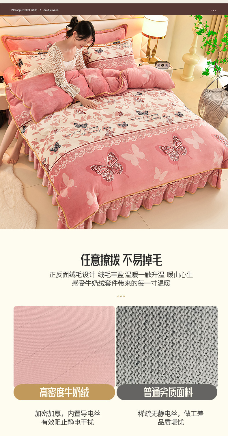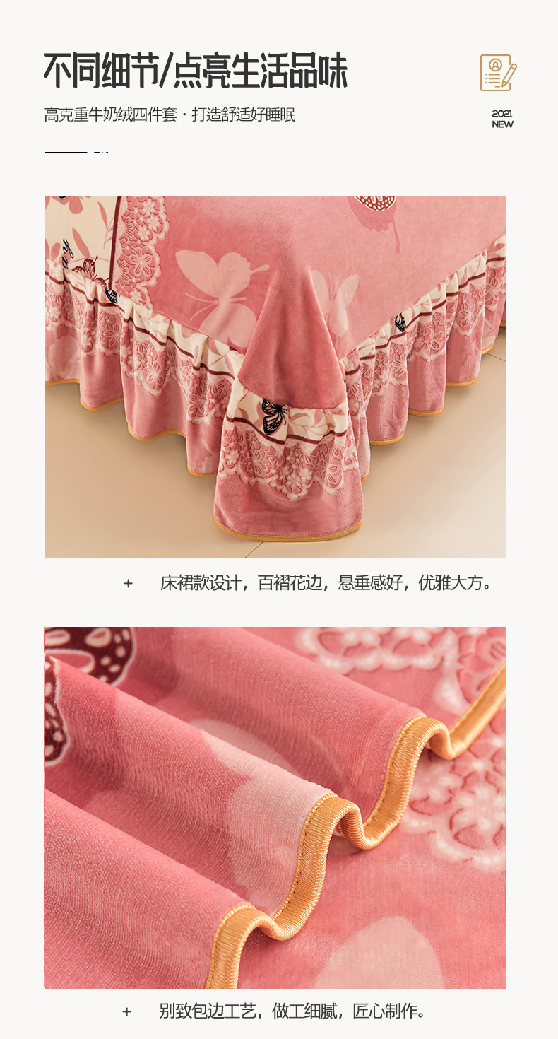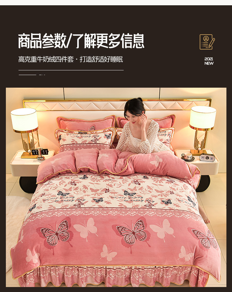 商品名称:沐妍家纺 2024新款7斤牛奶法莱绒金貂绒印花四件套 蝶恋