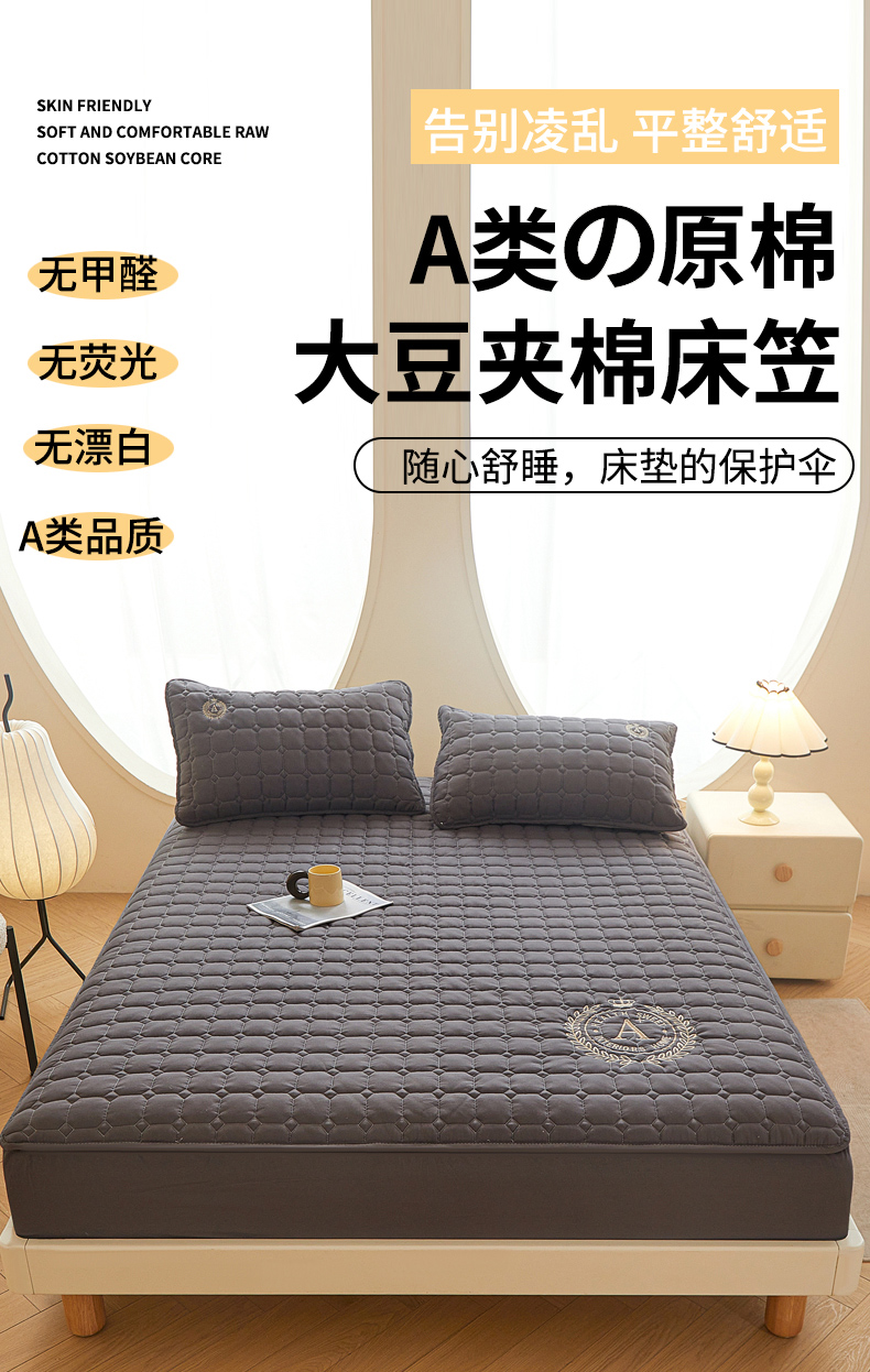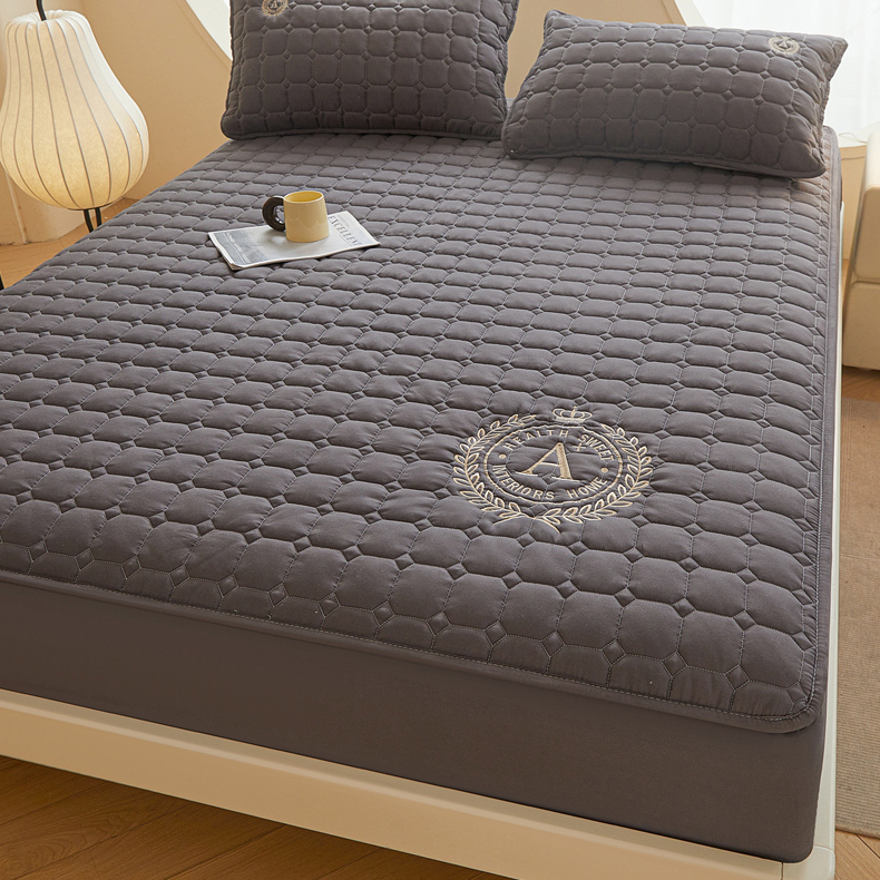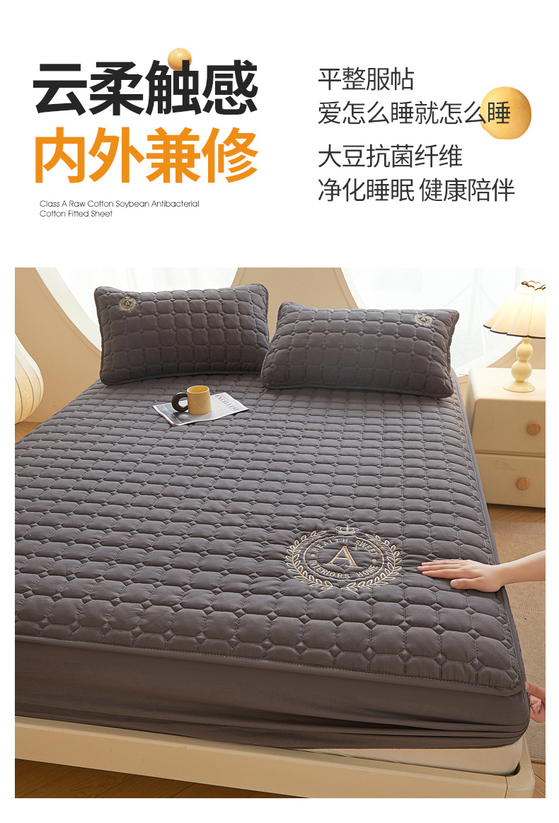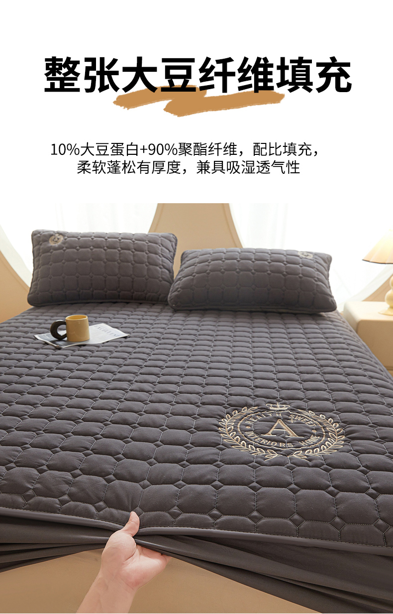 慕木家纺 2025新品A类原棉皇冠刺绣-A大豆夹棉床笠保护垫防尘套 深灰